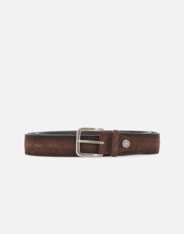 Gianni Chiarini men's belt crafted from suede leather in a deep dark brown shade, featuring a flat, clean design that elevates any look with understated style. The sleek silhouette highlights the suede texture, while the metal buckle adds a refined finishing touch. Versatile and well-crafted, it is ideal for everyday wear or more polished outfits. One size. Made in Italy.