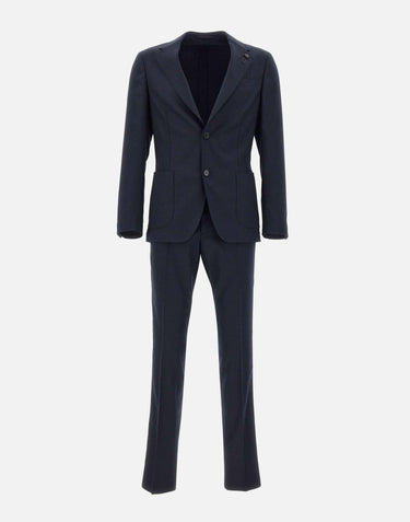 Trousers with partially elasticated waist, zip, hook and button fastening, side welt pockets, single welt pockets with button on back, straight hem.