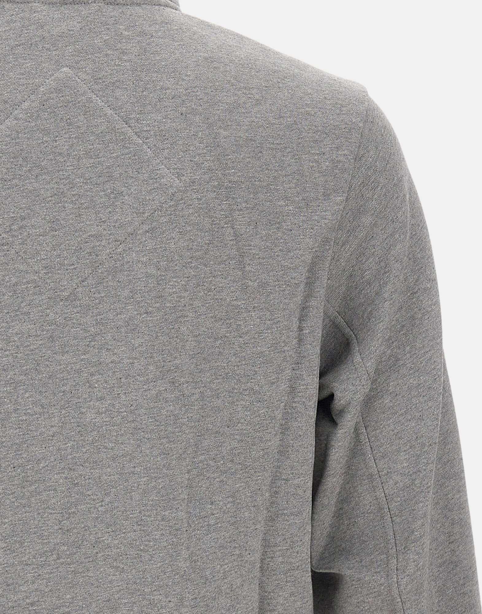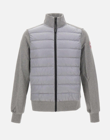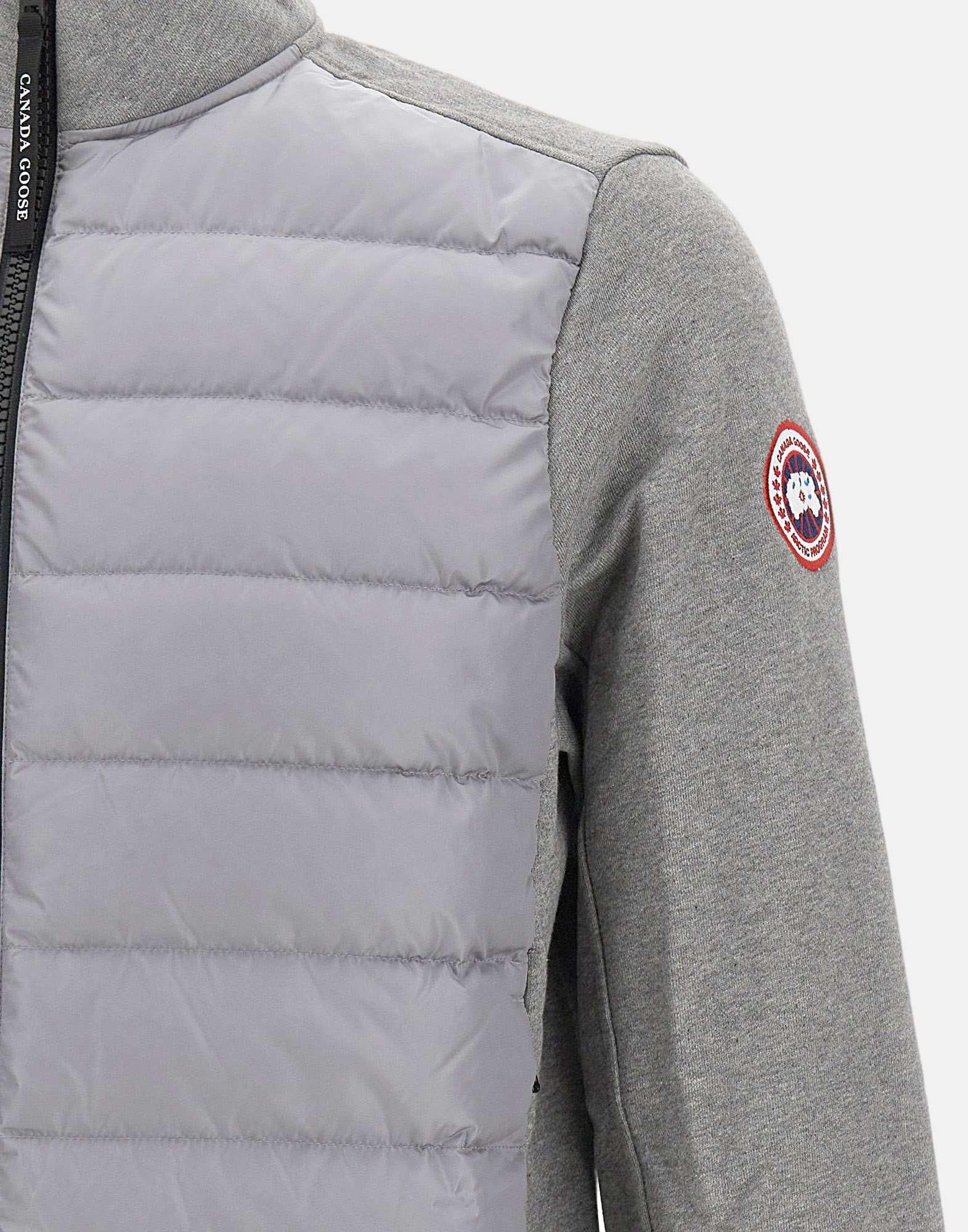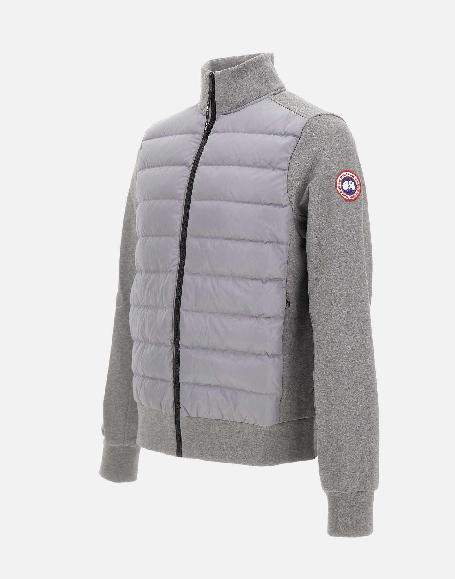 Canada Goose men's "HyBridge Huron" jacket crafted from brushed cotton terry in grey, featuring a smooth outer surface and a soft interior. Strategically placed down-filled panels provide warmth where it is needed most without adding bulk, delivering a balanced feel of comfort and performance. Ribbed cuffs and hem help lock in heat, while the full zip closure ensures everyday practicality. Finished with side pockets with concealed zips and a logo patch on the left sleeve.