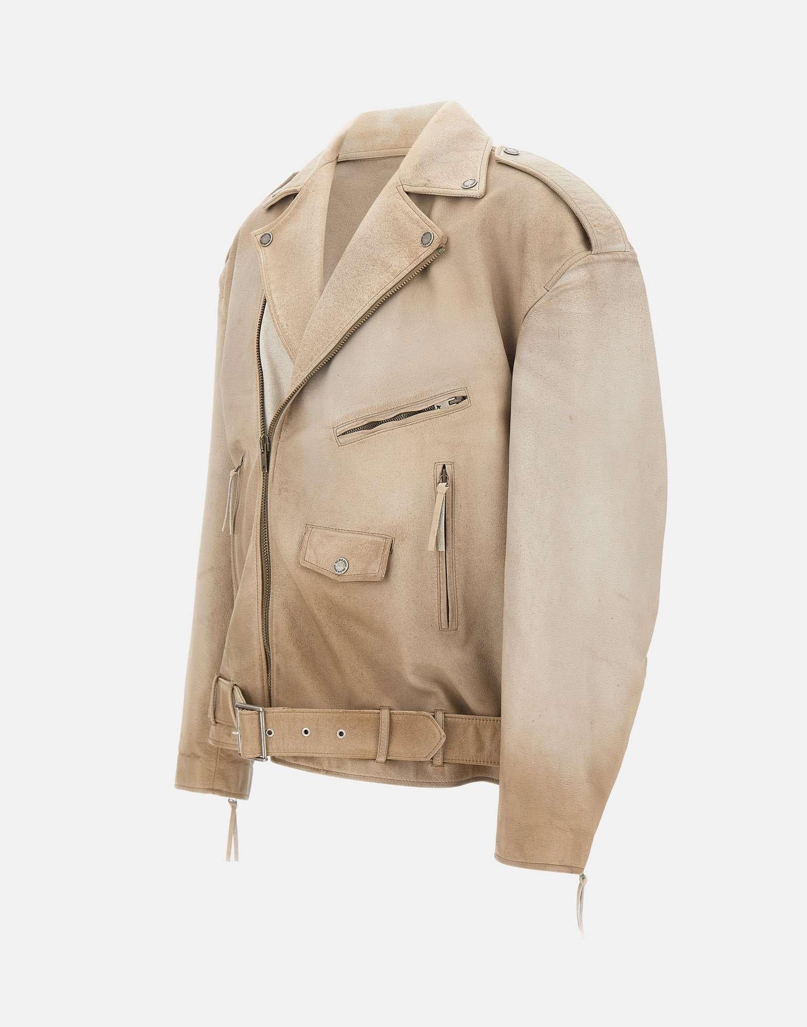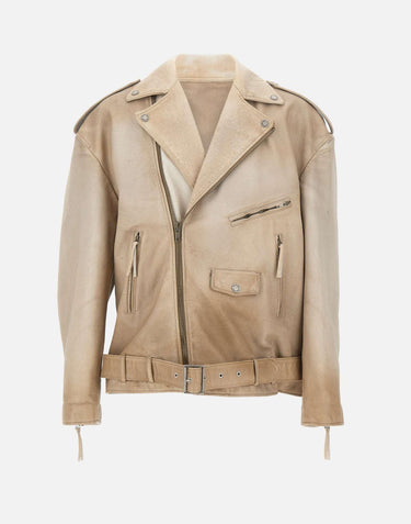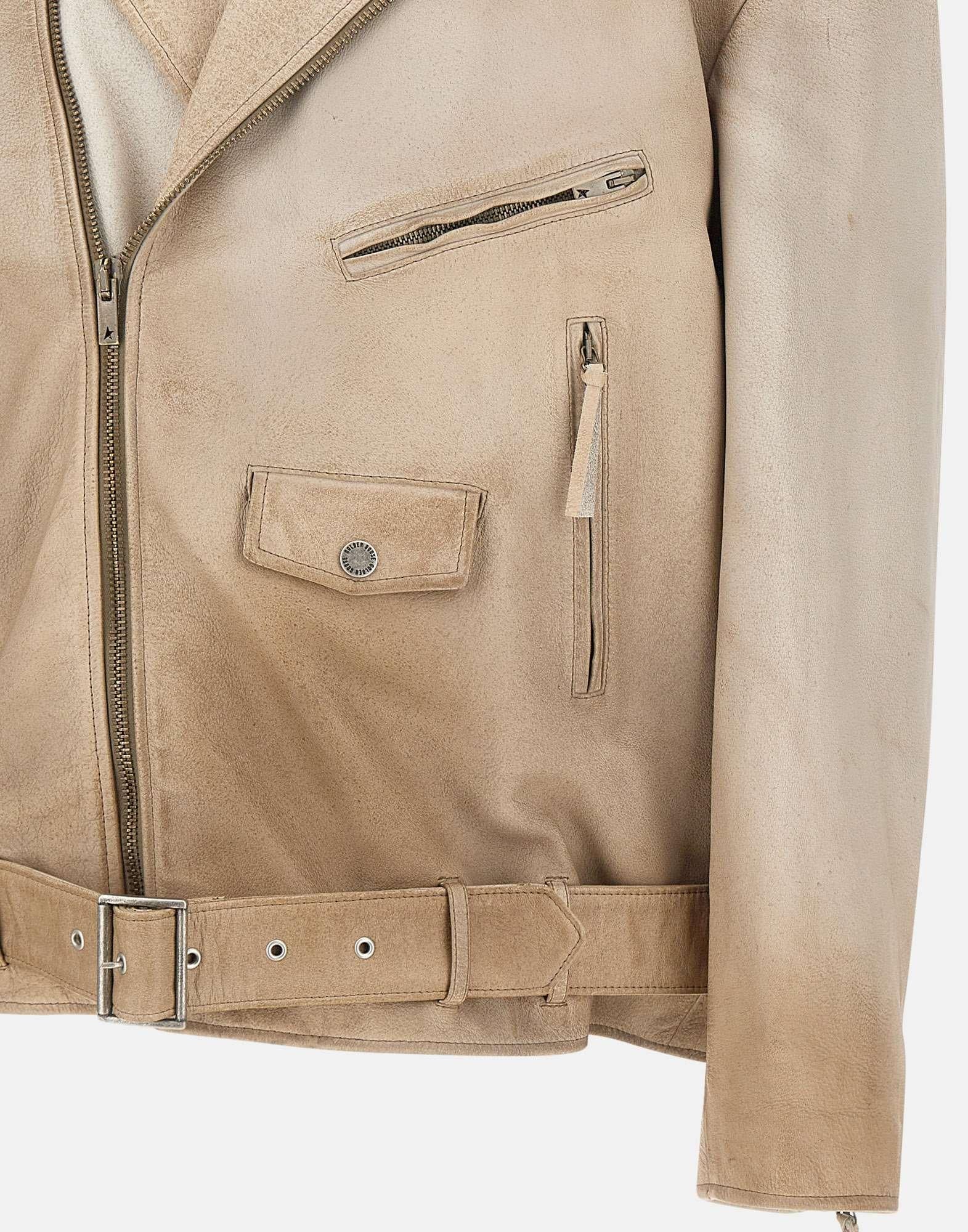 Golden Goose jacket crafted from beige leather with a hand-dyed treatment, delivering a distinctive vintage feel. Designed with an oversized fit, it features classic biker jacket details: an asymmetric zip closure, shoulder tabs with buttons, a waist belt with buckle, and zipped cuffs. Finished with zip pockets and a small pocket with a magnetic button. The iconic double star is applied on the back as the brand's signature. Made in Italy.