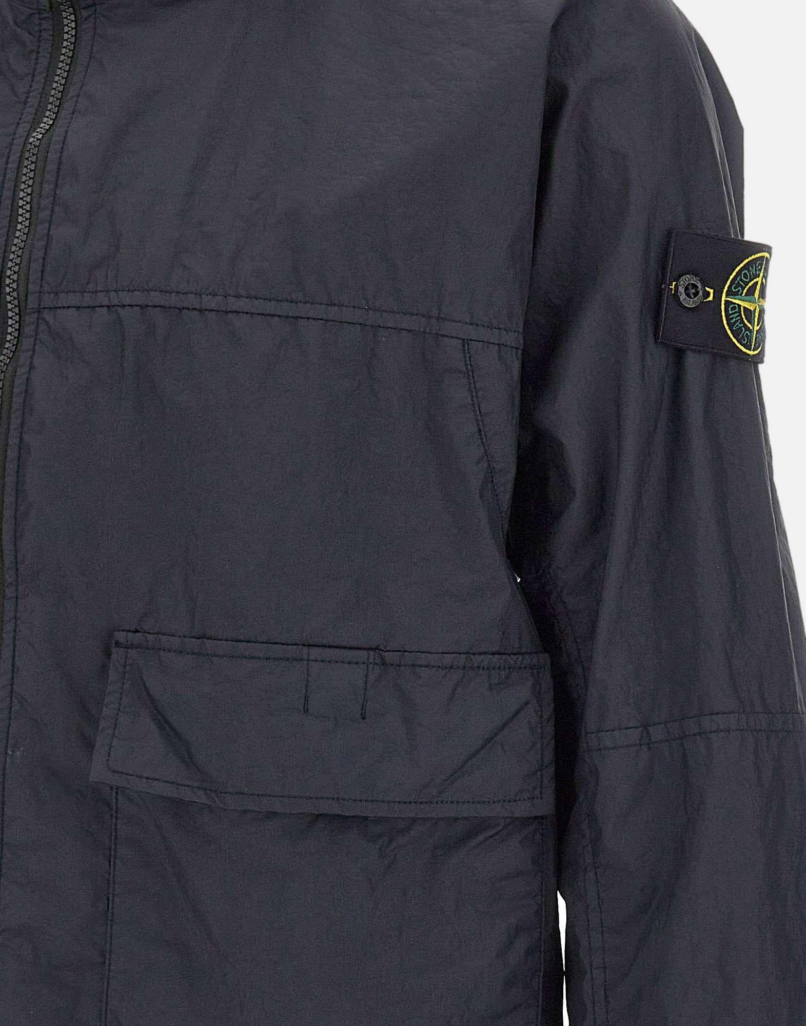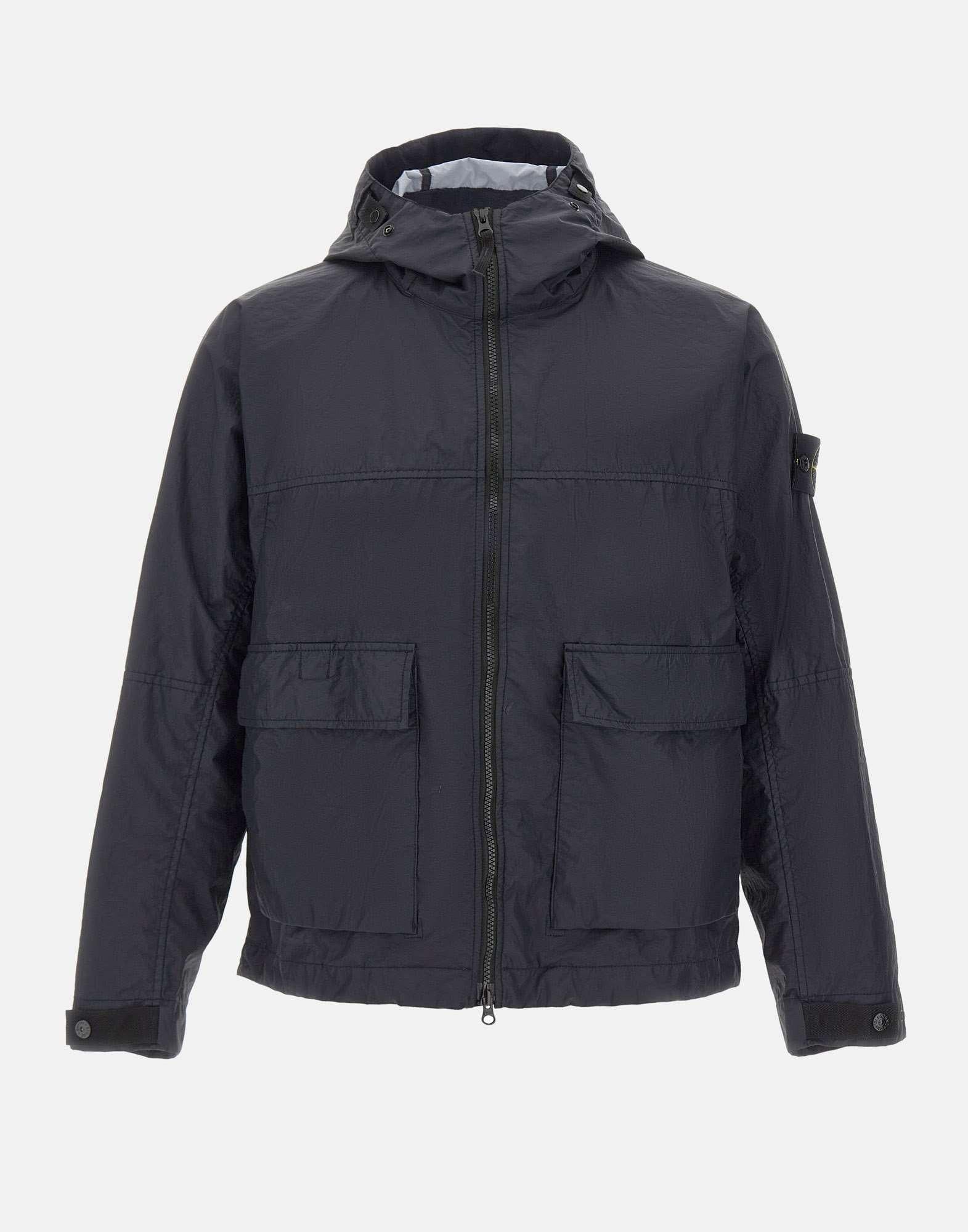 Stone Island men's jacket "Membrana 3L TC" crafted from dark blue three-layer technical nylon, laminated to a breathable, water-resistant membrane. Garment dyed with a water-repellent treatment, designed for functional urban wear. Features a hood with a button for fastening, large flap pockets with snap button closure, and a second concealed vertical pocket for added practicality. Finished with an adjustable drawcord hem, adjustable cuffs, and a double-slider zip closure. Completed with the iconic Stone Island patch on the left sleeve. Regular fit.
