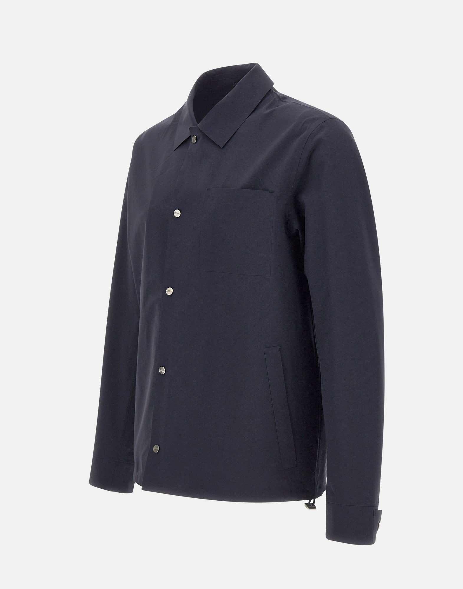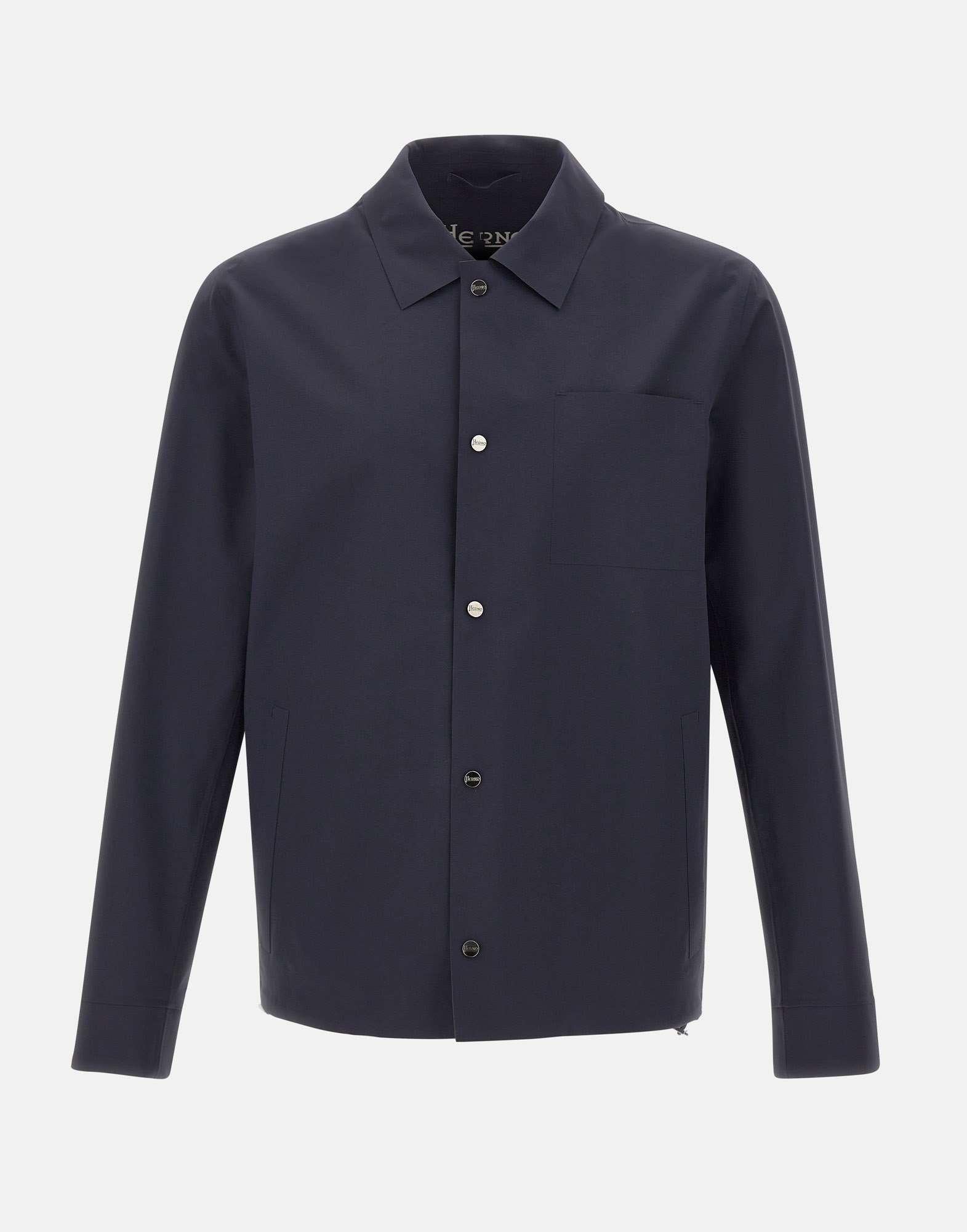 Herno men's jacket "Shaket in Essence" crafted from double bi-stretch fabric in navy blue, designed as a lightweight and versatile outer layer for transitional weather. Comfortable to wear, it combines a clean aesthetic with refined details such as branded snap buttons that add an exclusive touch. Features a shirt collar, side welt pockets, and a patch chest pocket for a balanced, functional look. Regular fit, perfect as an everyday technical jacket for easy layering.