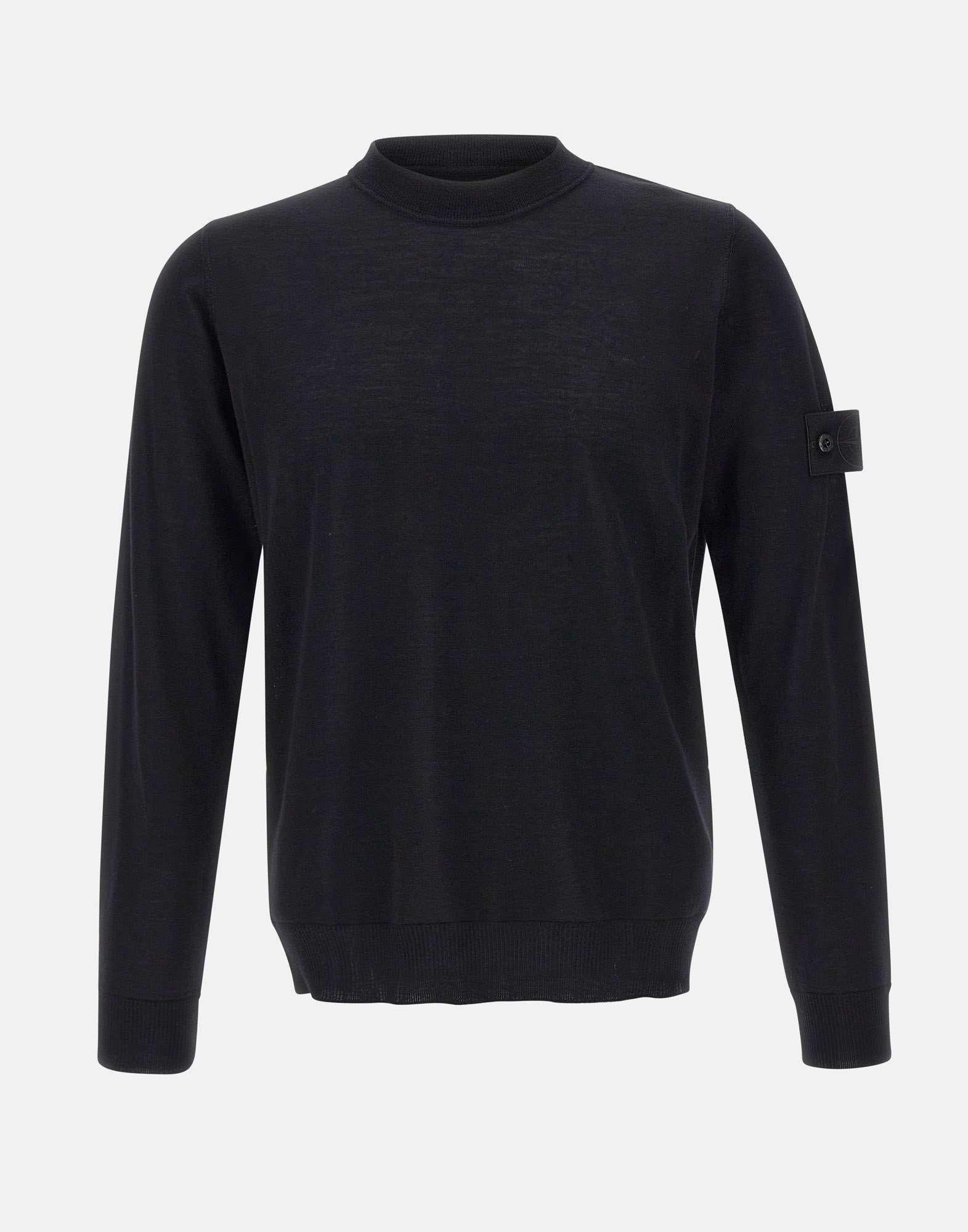 Stone Island men's sweater in black, crafted from lightweight 14-gauge pure wool. Featuring long sleeves and a crew neck, the monochrome design blends seamlessly with the fabric for a minimalist and refined look. The Stone Island Ghost badge on the left sleeve adds a distinctive touch, while ribbed edges ensure a perfect fit and optimal comfort. Regular fit