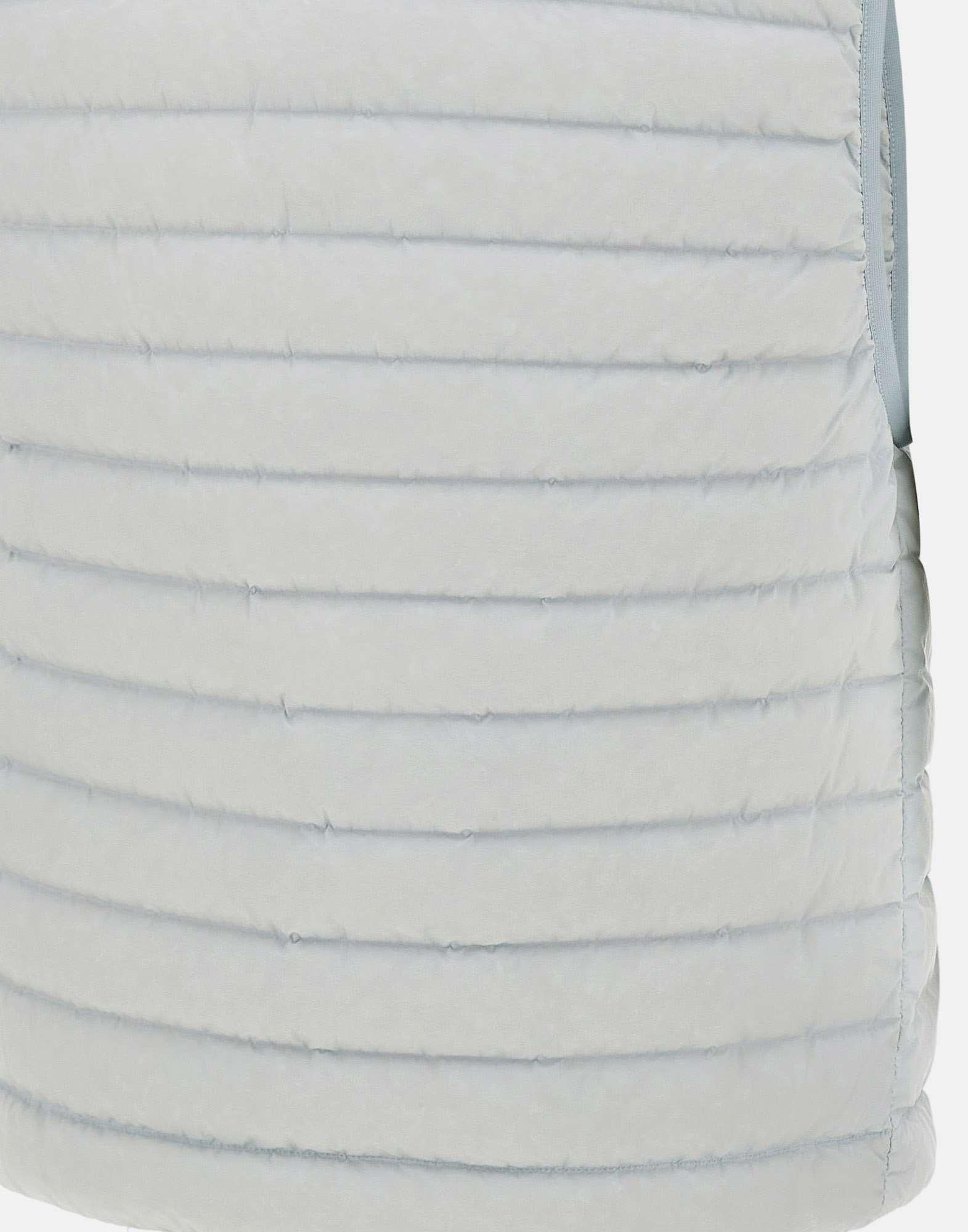 Stone Island men's down vest "Seamless Tunnel Nylon Down-TC" in light blue, crafted from lightweight single-layer stretch recycled nylon. Its seamless tunnel construction improves down retention while keeping a clean, technical look. Garment dyed with a water-repellent treatment, it is ideal for functional transitional layering. Features zip side pockets and a zip chest pocket, an adjustable drawcord hem, and a double-slider zip closure. Finished with the Stone Island patch at the lower left hem. Regular fit.