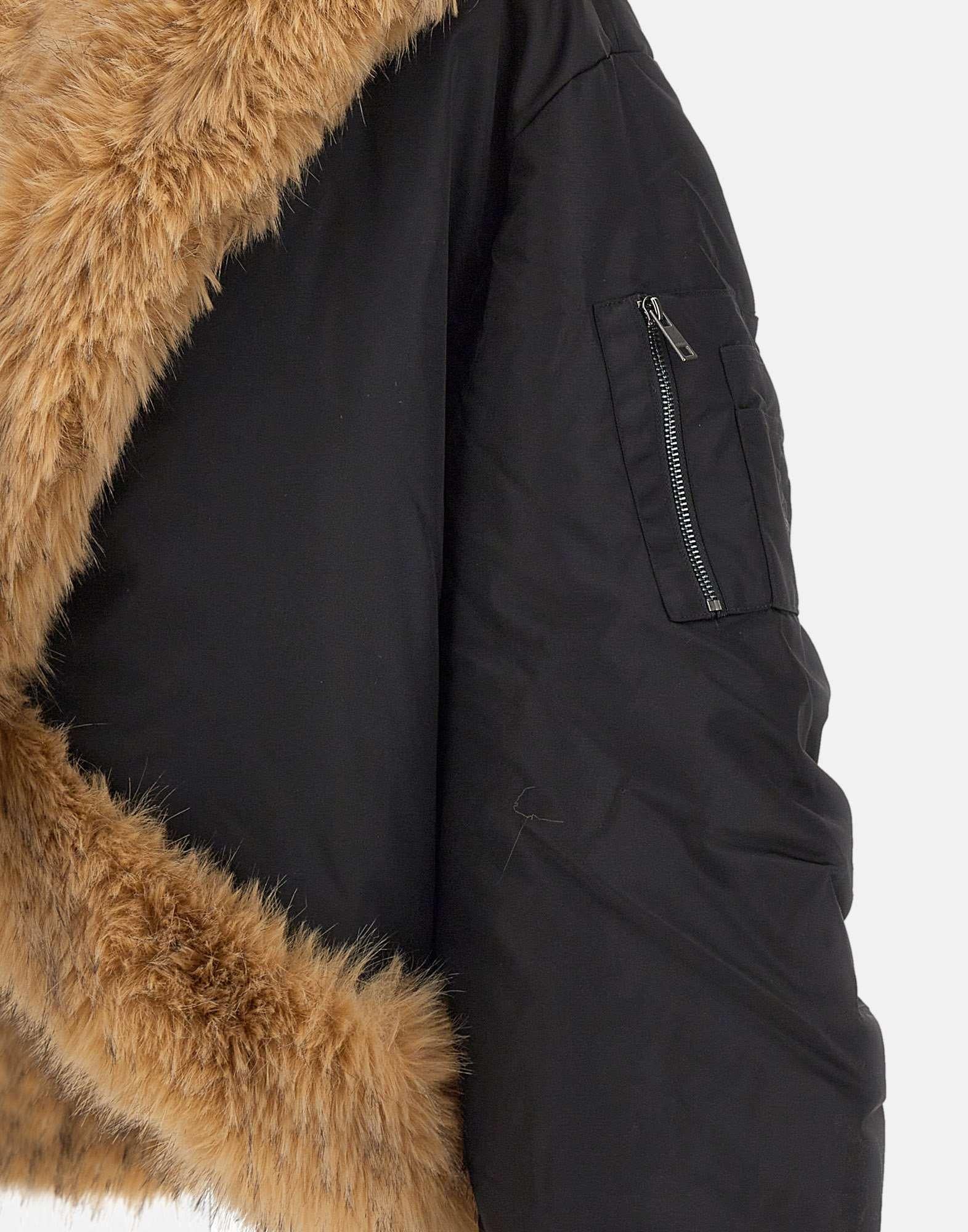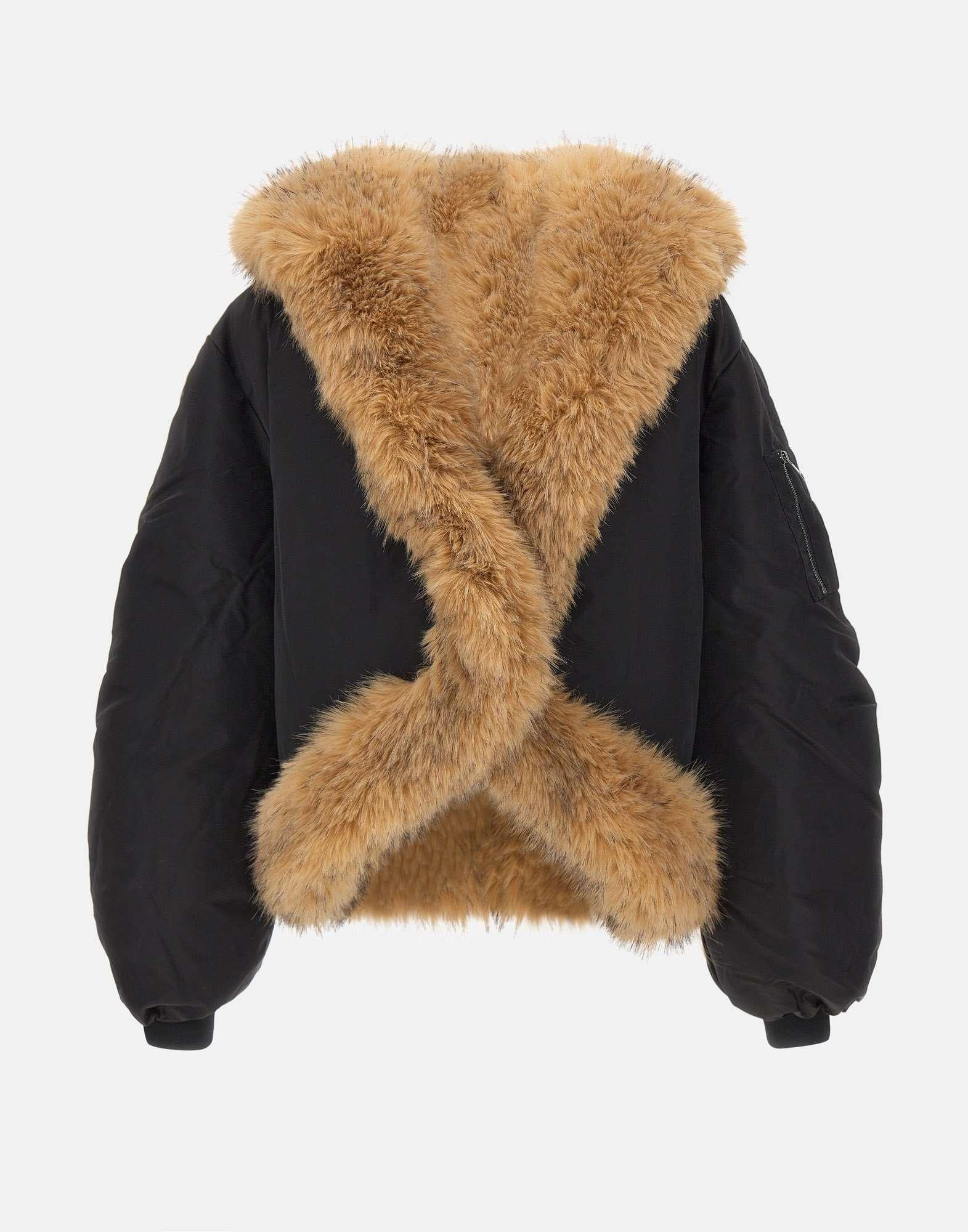 Rotate Birger Christensen "Faux Fur Collar" women's bomber jacket from Holiday Collection, crafted from black polyester satin. Contrasting faux fur trim adds a touch of sophistication and glamour. The jacket features a front hook closure, wide gathered sleeves, Lycra cuffs, and a pocket on left sleeve. Synthetic padding ensures warmth and comfort, while oversized fit creates a modern and bold look perfect for winter season.