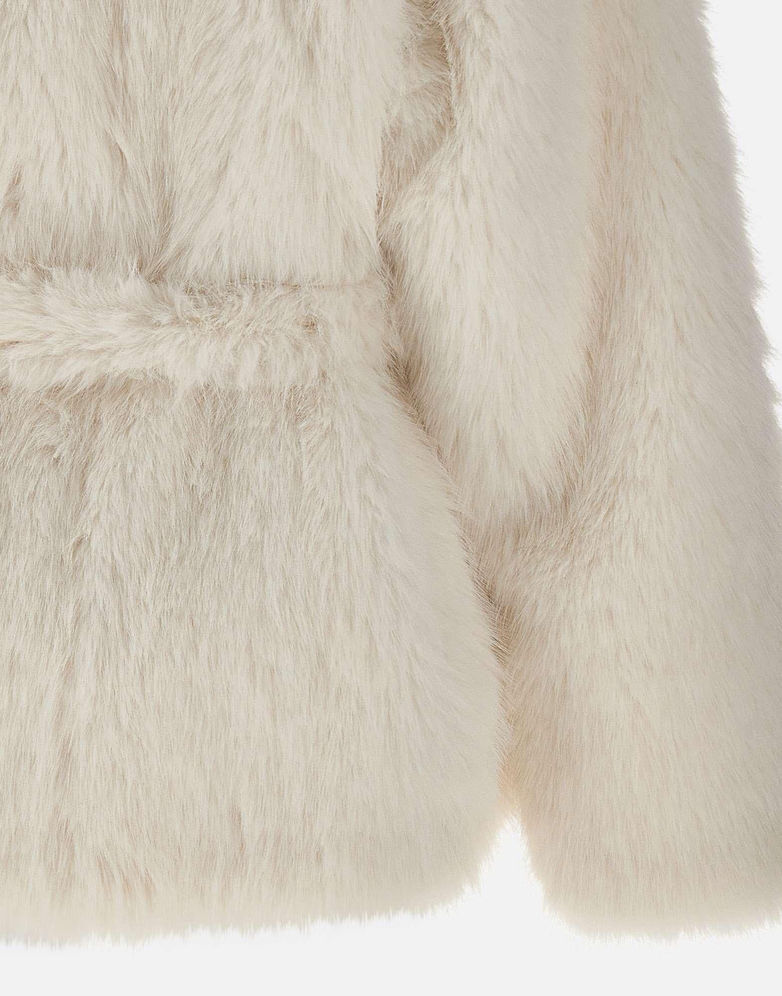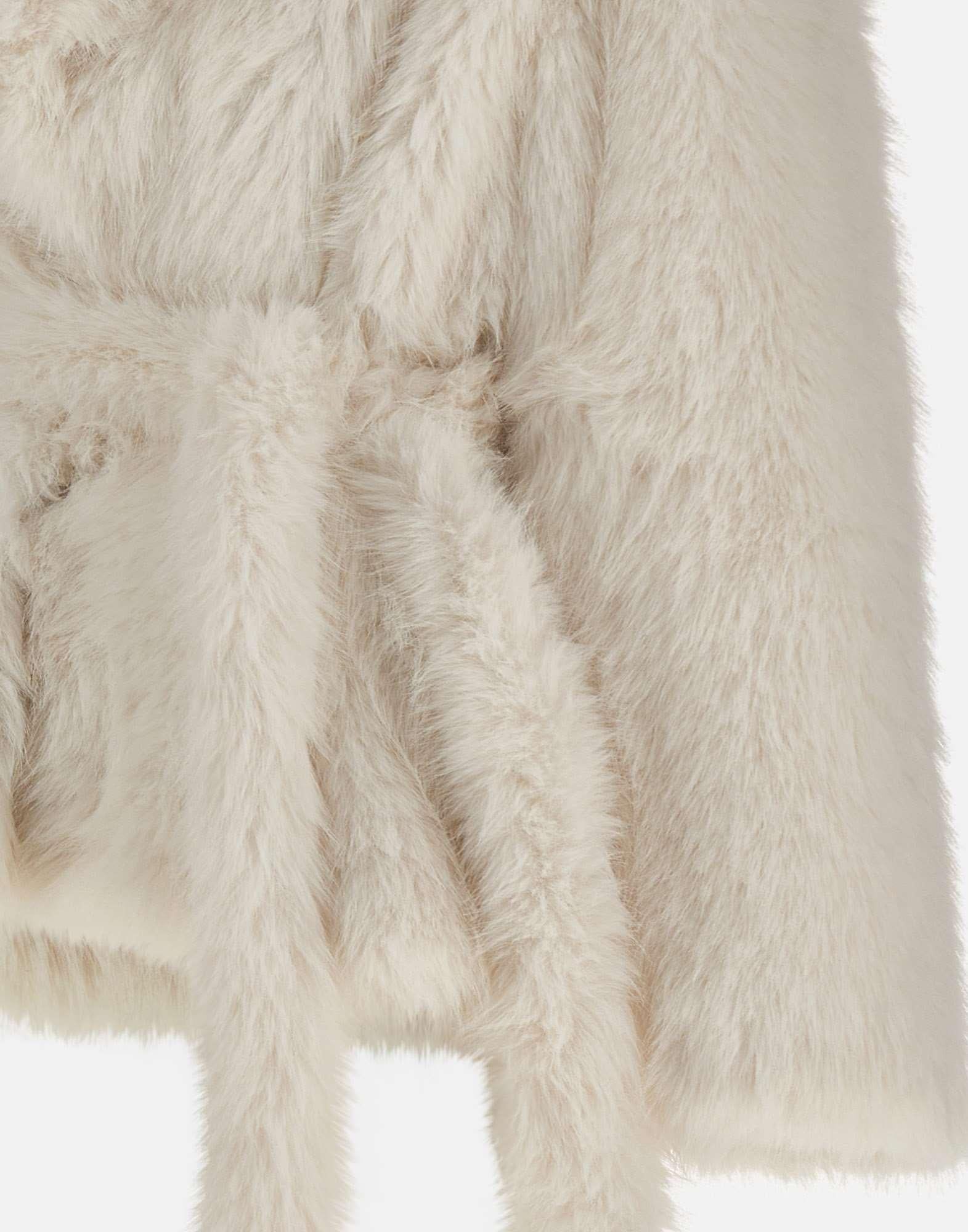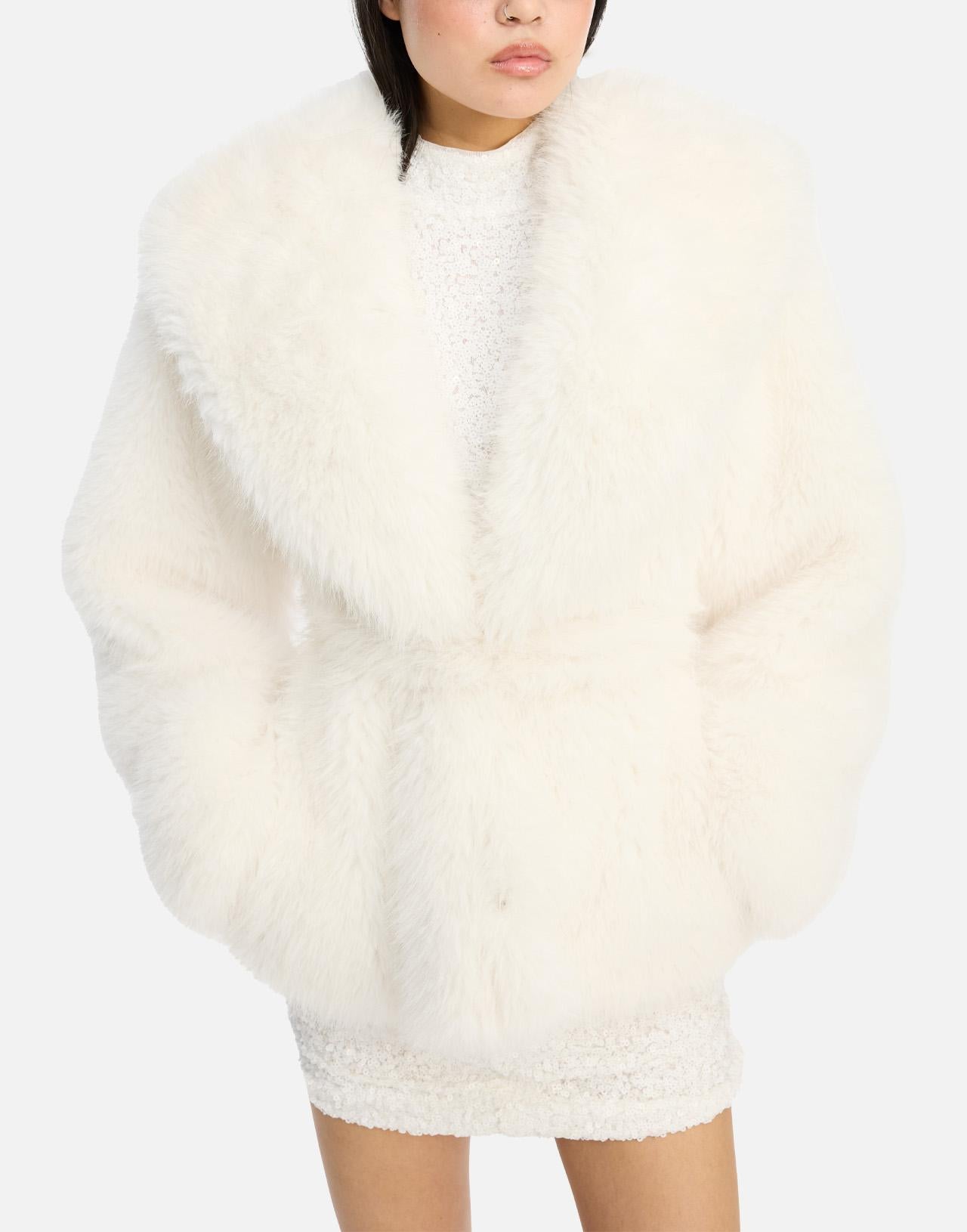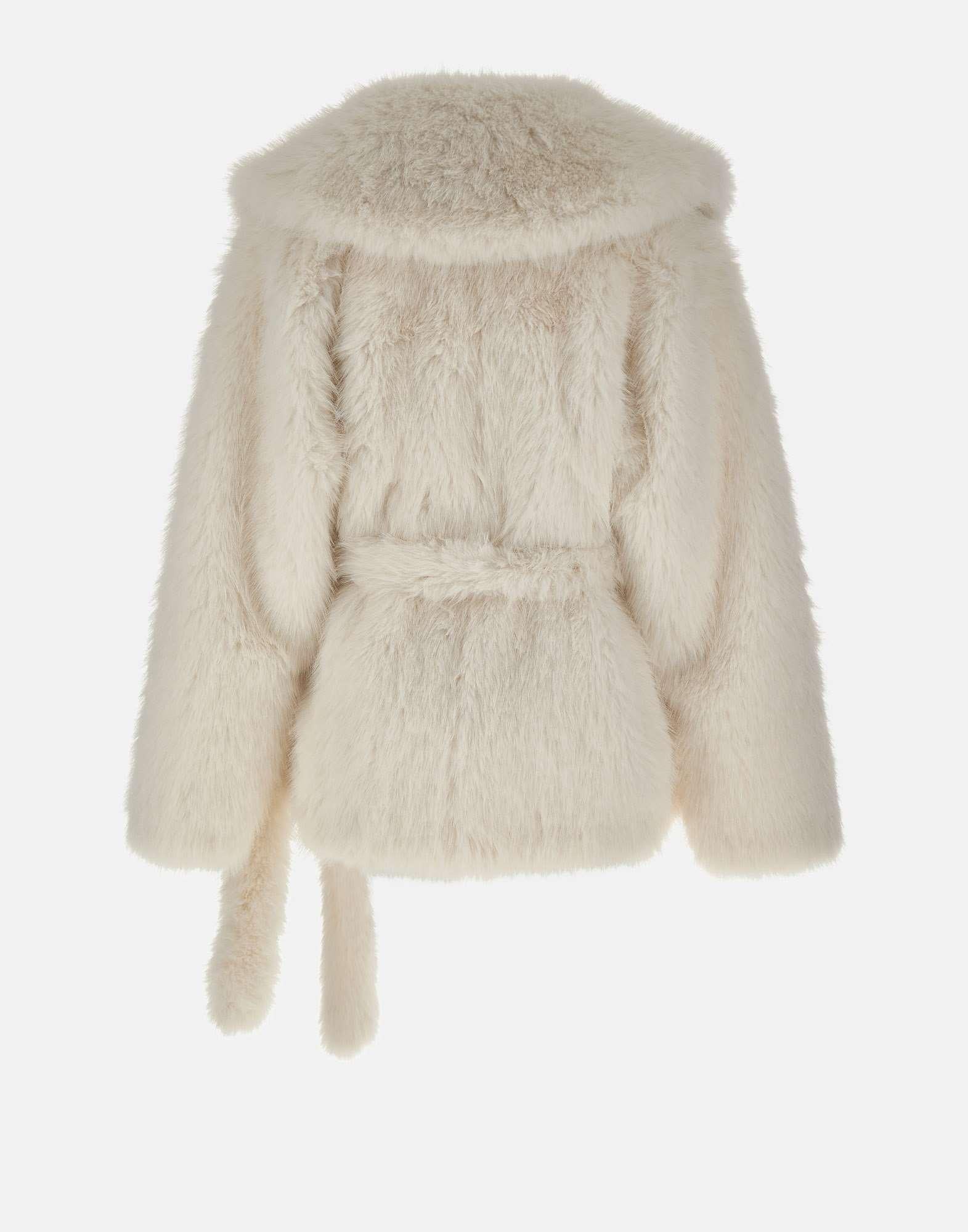 The "Faux Fur Short Jacket" by Rotate Birger Christensen, Sunday Collection, crafted from long-hair white faux fur, exudes modern glamour and sophistication. Featuring a wide, enveloping collar and a belted wrap design, it fastens with concealed hooks and includes side welt pockets. Fully lined for comfort, its ideal statement piece for chic winter looks. Relaxed fit.