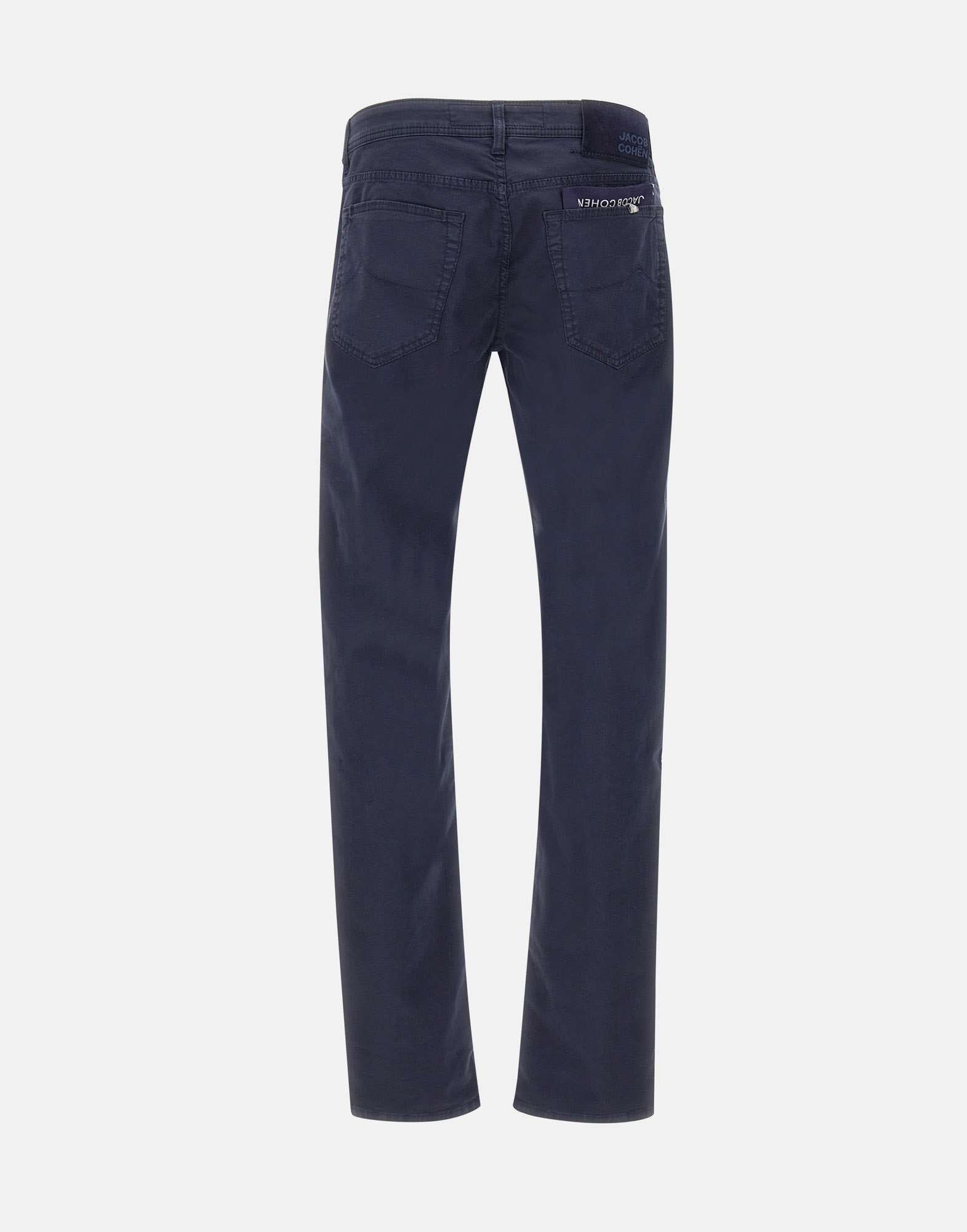 Jacob Cohen "Nick" men's jeans, midnight blue, garment dyed, closure with tone-on-tone logoed buttons, waist with belt loops, five-pocket model with embroidered logo on monochrome pocket, pony skin tag with logo on back, includes scarf with collection print and spool of thread, scented with exclusive Jacob Cohën fragrance, super slim fit. Made in Italy.