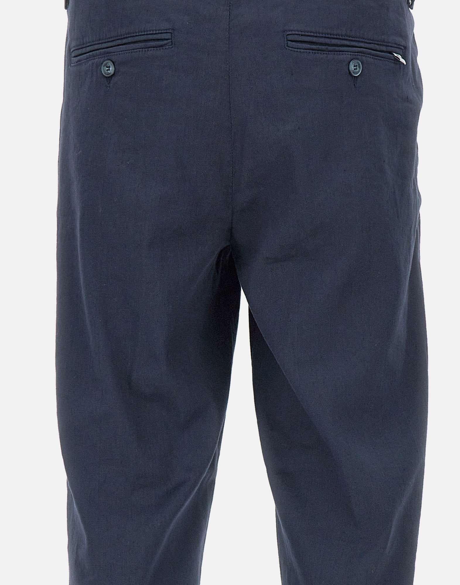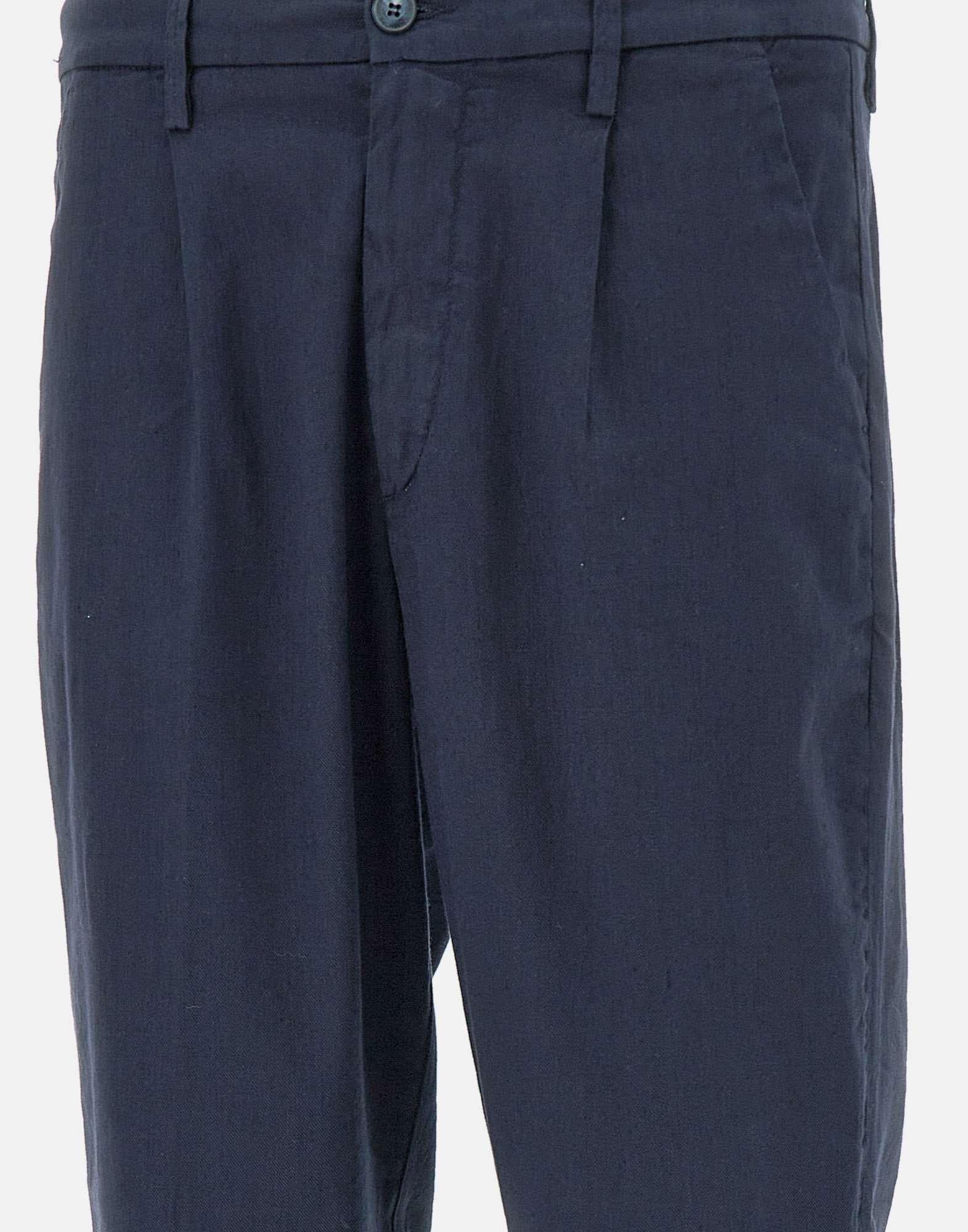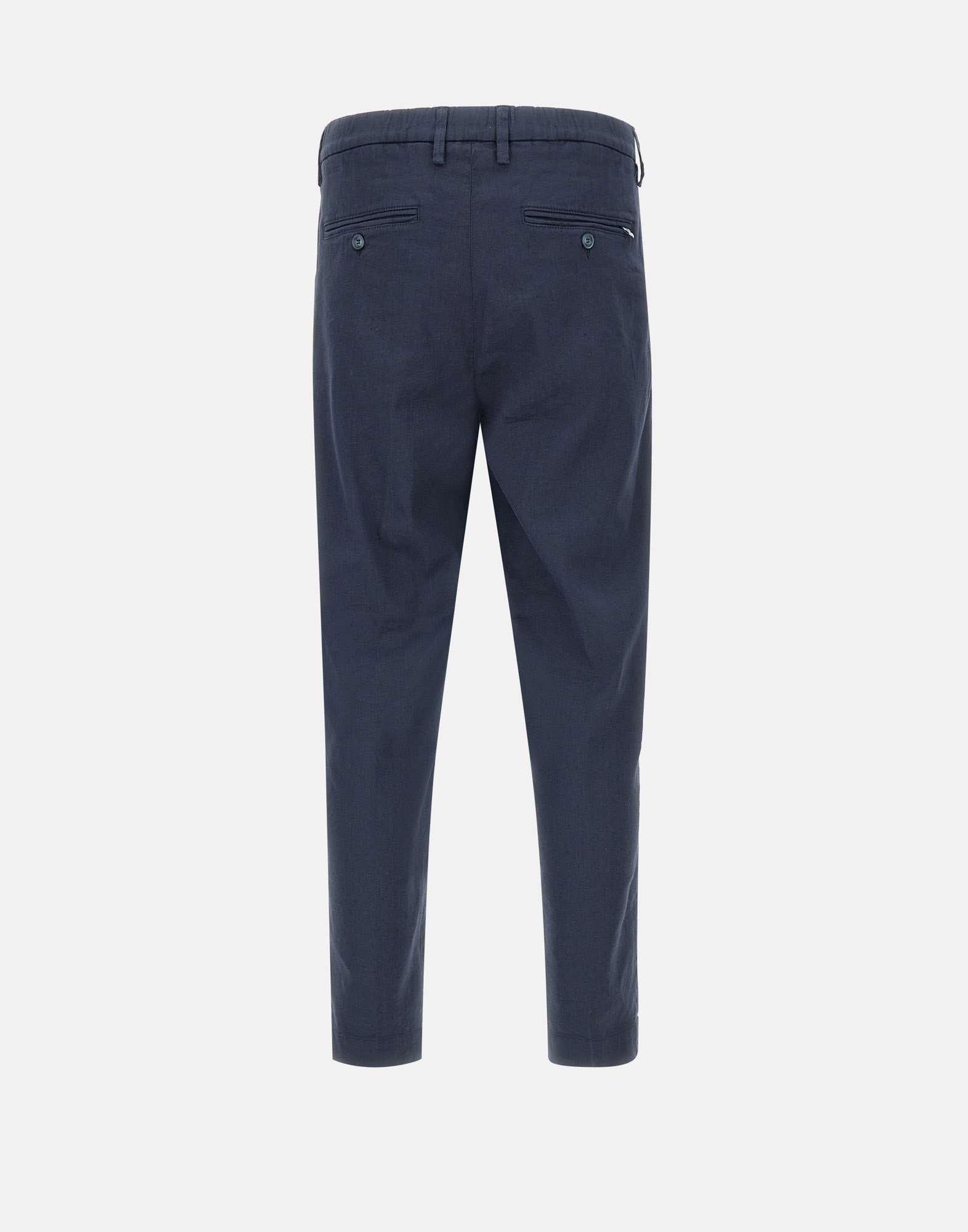 Marc-El Re-Hash men's trousers, blue, blend linen and cotton, jogger style with elasticated waistband and internal drawstring and metal logoed finials, front pleats, button and zip fastening, side welt pockets, back pockets with button, straight leg with 17cm hem, regular fit, made in Italy