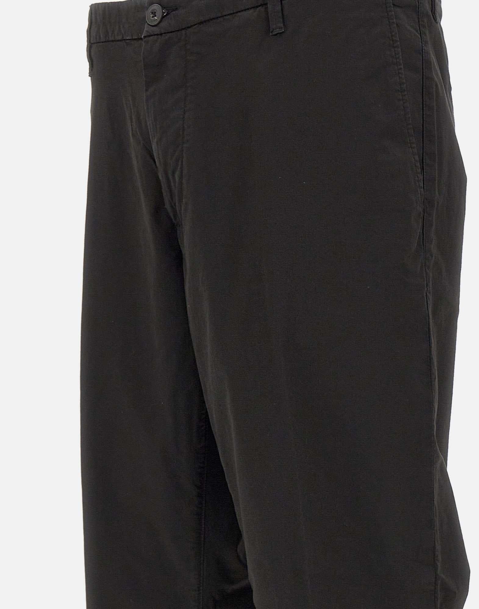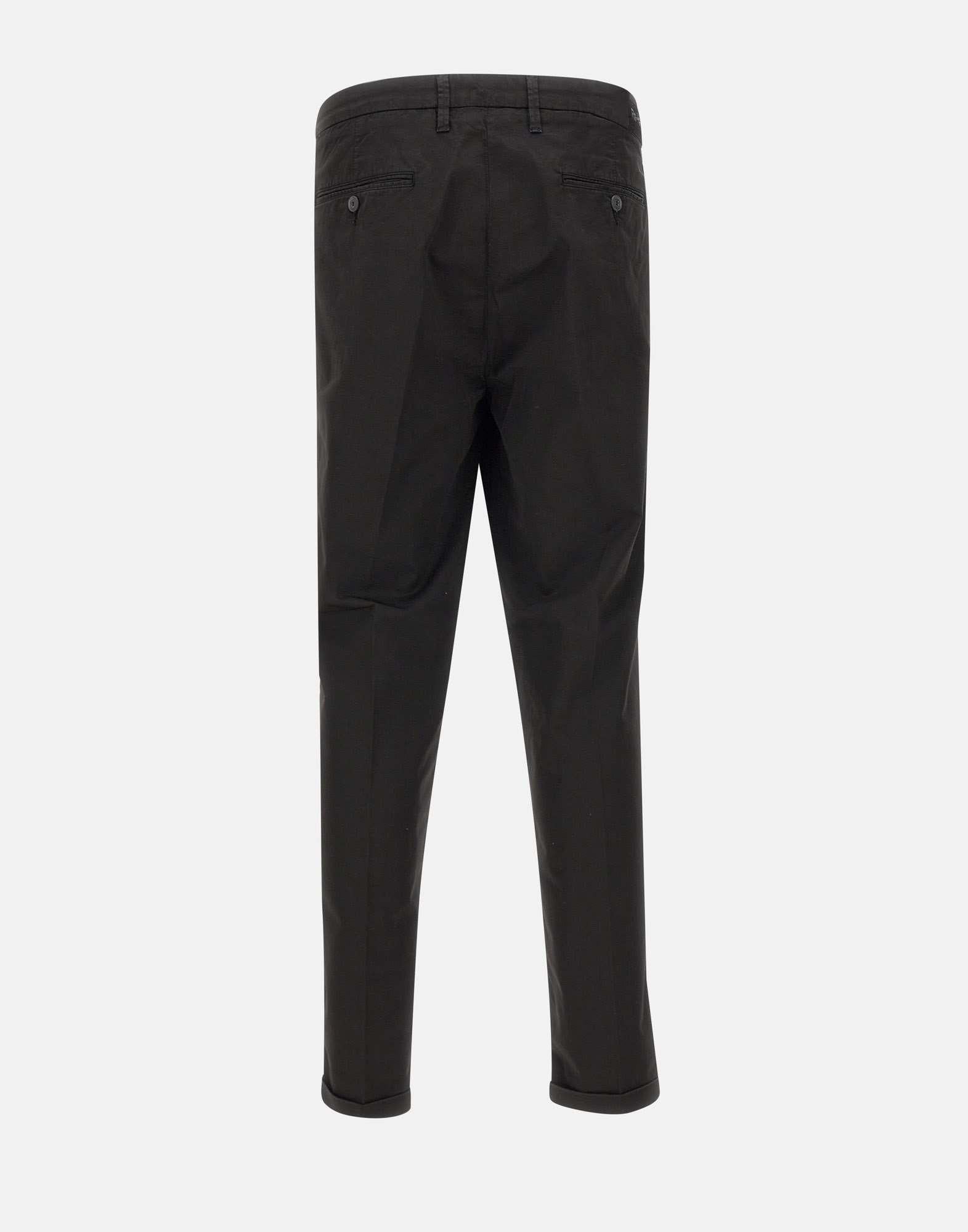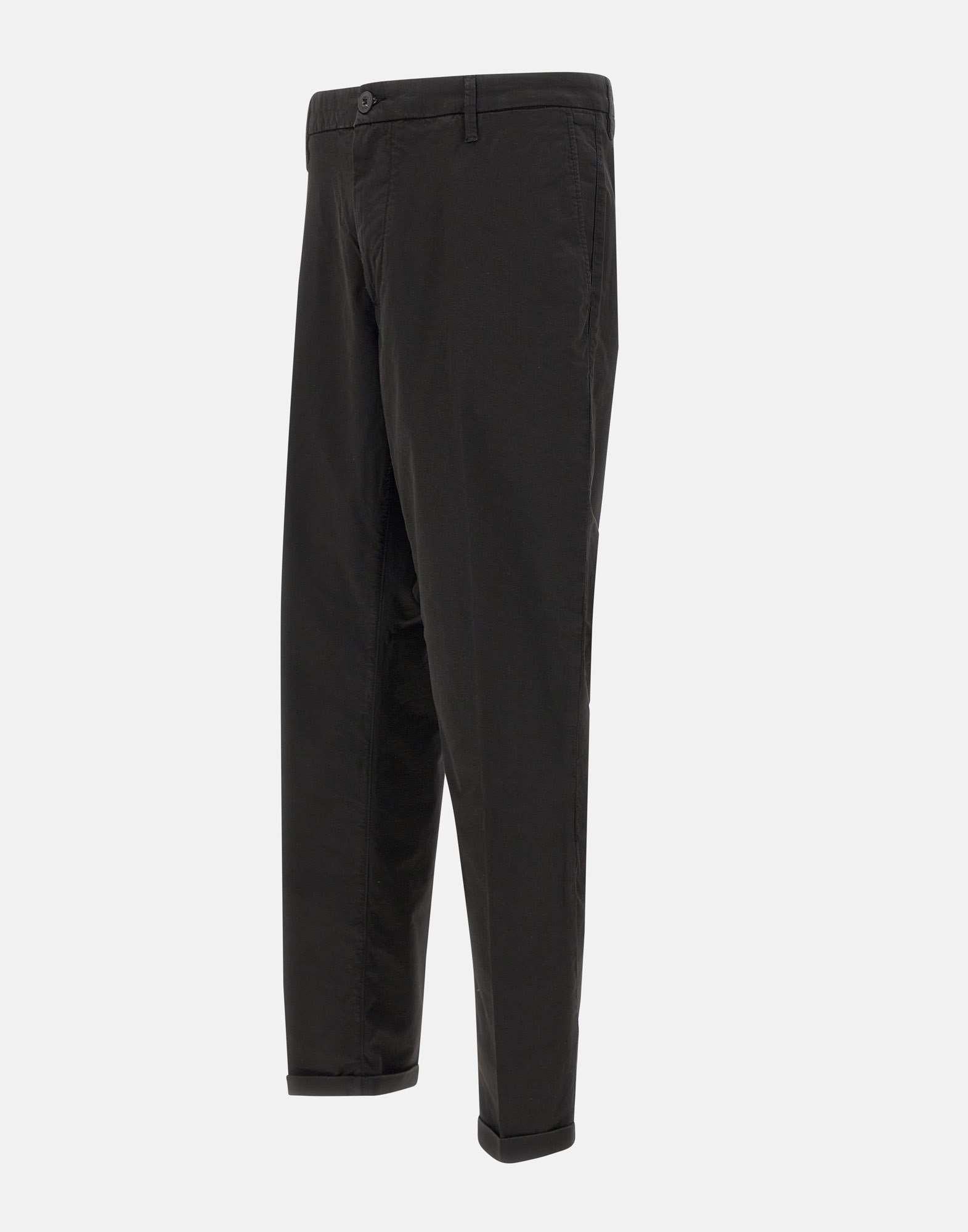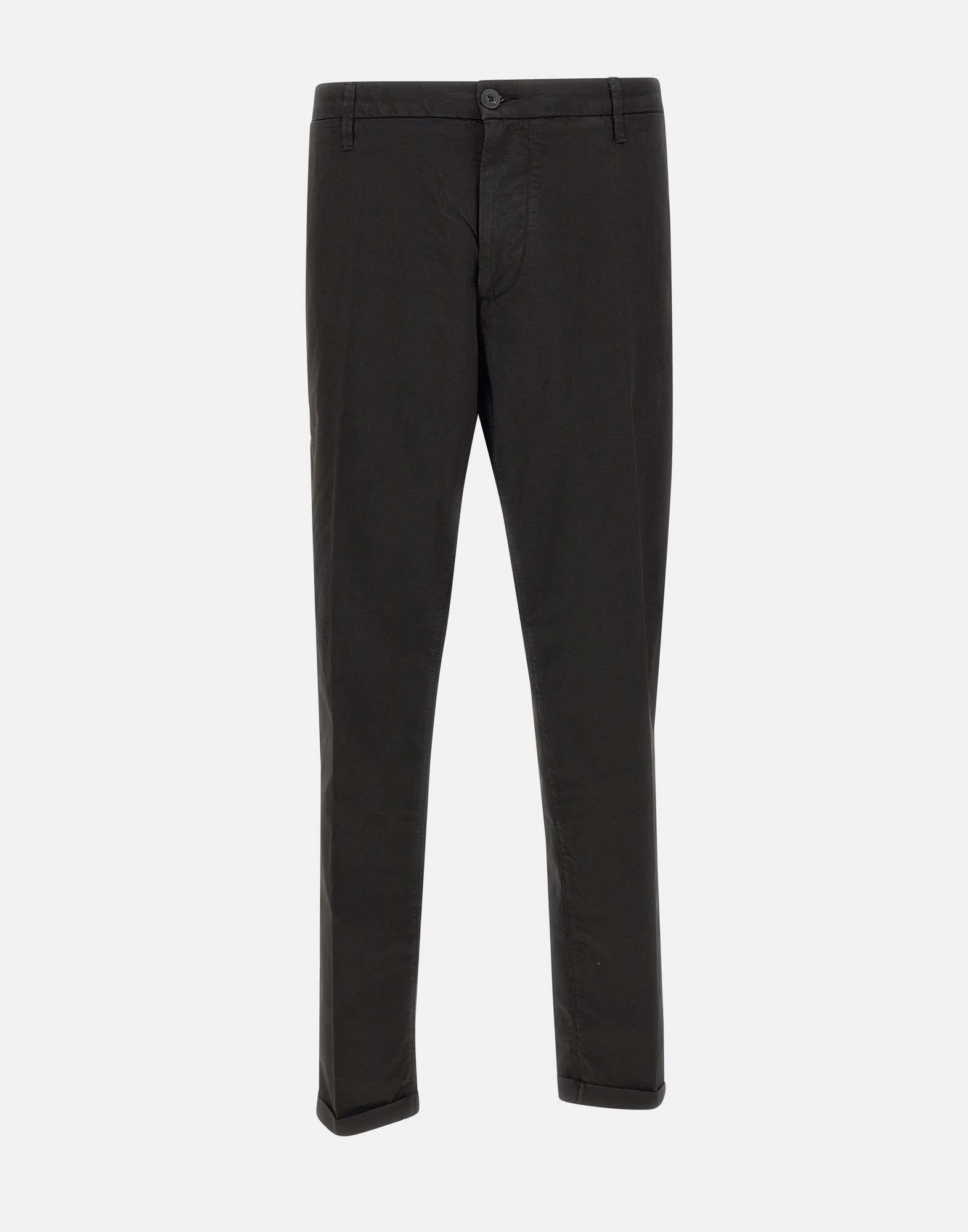 Re-Hash "Mucha chinos" men's stretch cotton pants, black, zip and button closure, side welt pockets, mini front pocket, regular waist with belt loops, turn-up at hem, logo patch on back, slim fit, made in Italy.