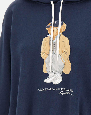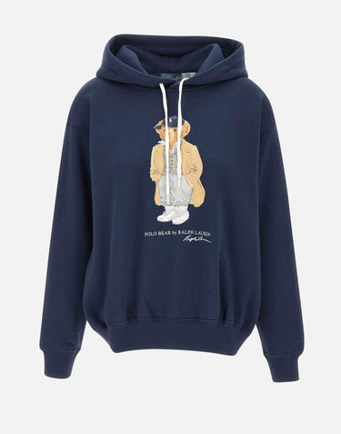 Polo Ralph Lauren "Classics" hoodie in blue cotton blend sweatshirt with long sleeves and adjustable drawstring hood. Features iconic multicolor Polo Bear print on front, soft brushed interior, and ribbed trims. Relaxed fit, ideal for a cozy yet stylish casual outfit.