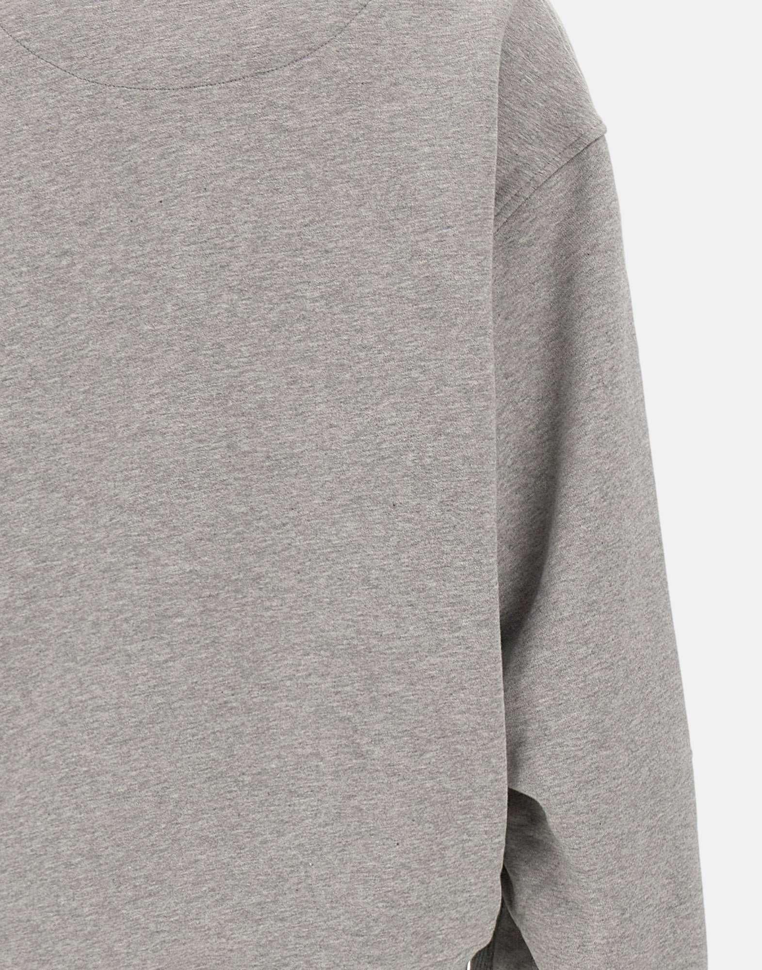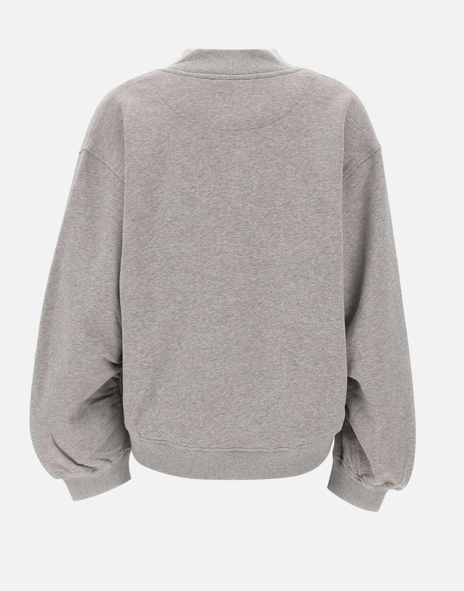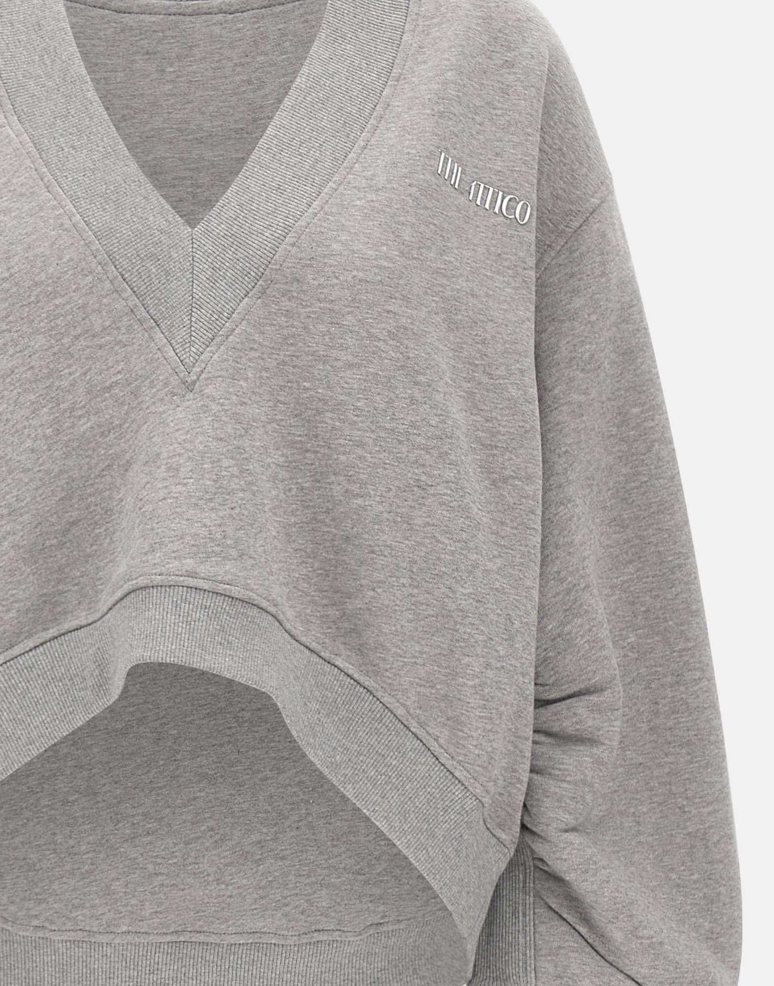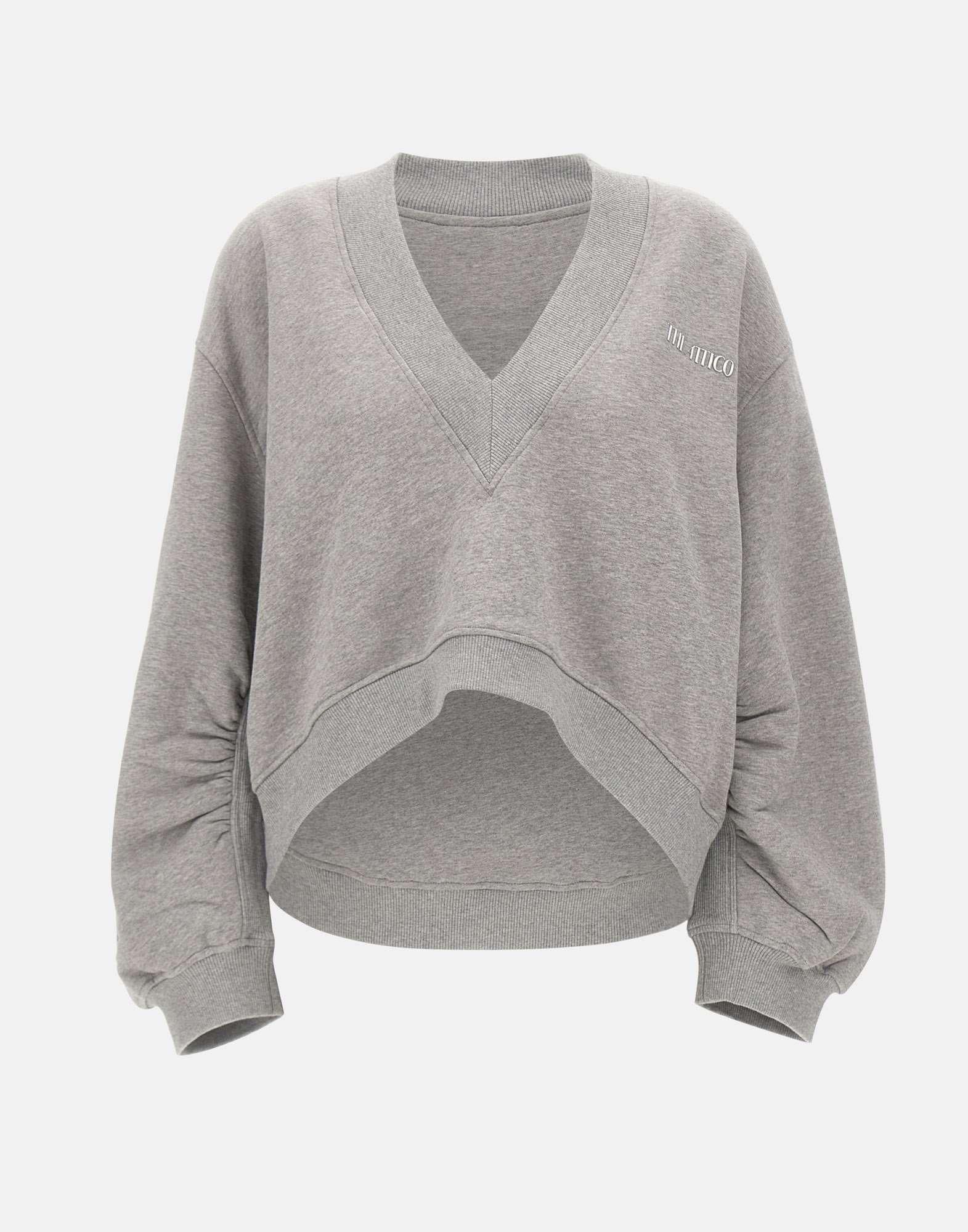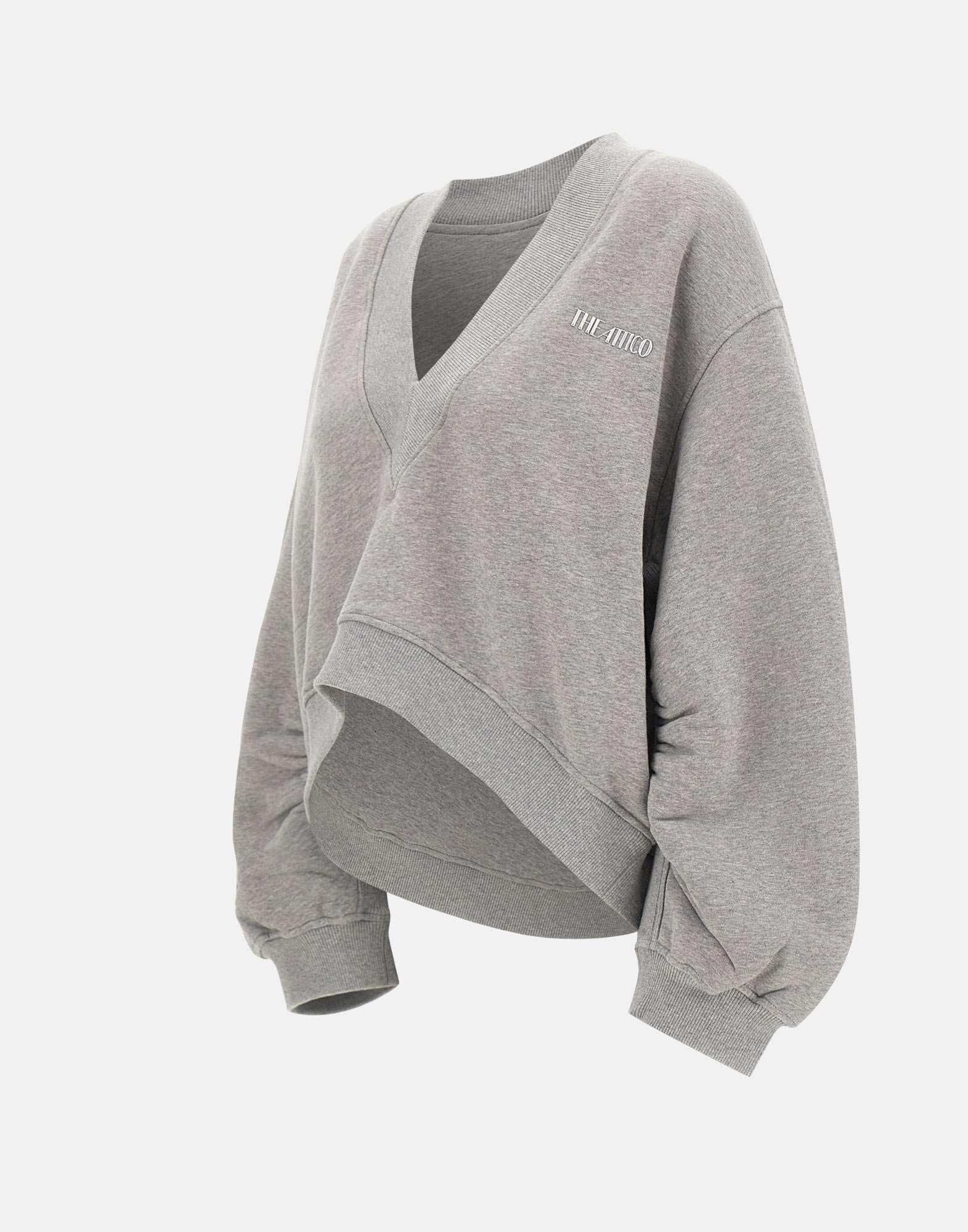 The Attico women’s sweatshirt in faded grey cotton, featuring an oversized fit and bold design. Defined by a deep V-neckline and raised rubberized silver logo print on the front. Gathered sleeve detailing and ribbed finishes at the cuffs and neckline complete the silhouette. Oversized fit for a striking, fashion-forward look.