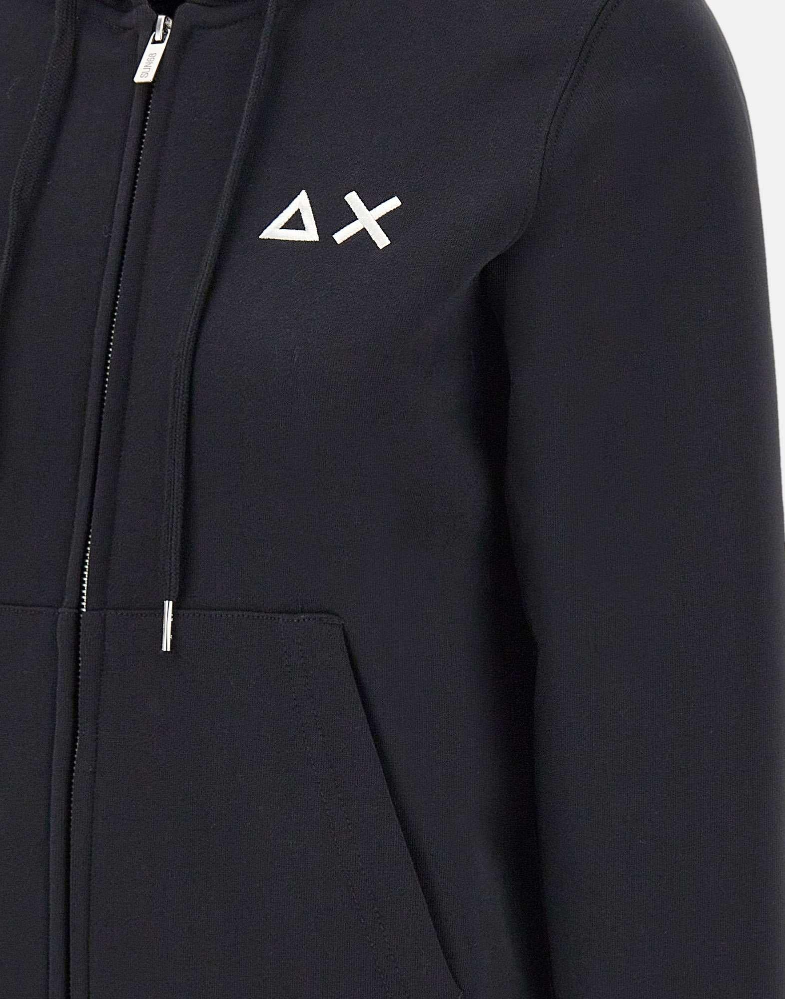 Sun68 women's "Hoodie Zip Basic" sweatshirt in black fleece cotton, featuring a casual and comfortable design. It features long sleeves, an adjustable drawstring hood, and a front zip closure. Kangaroo pockets and an embroidered logo on the chest complete the look, while ribbed edges ensure a perfect fit. The regular fit ensures everyday comfort with a simple and refined style.