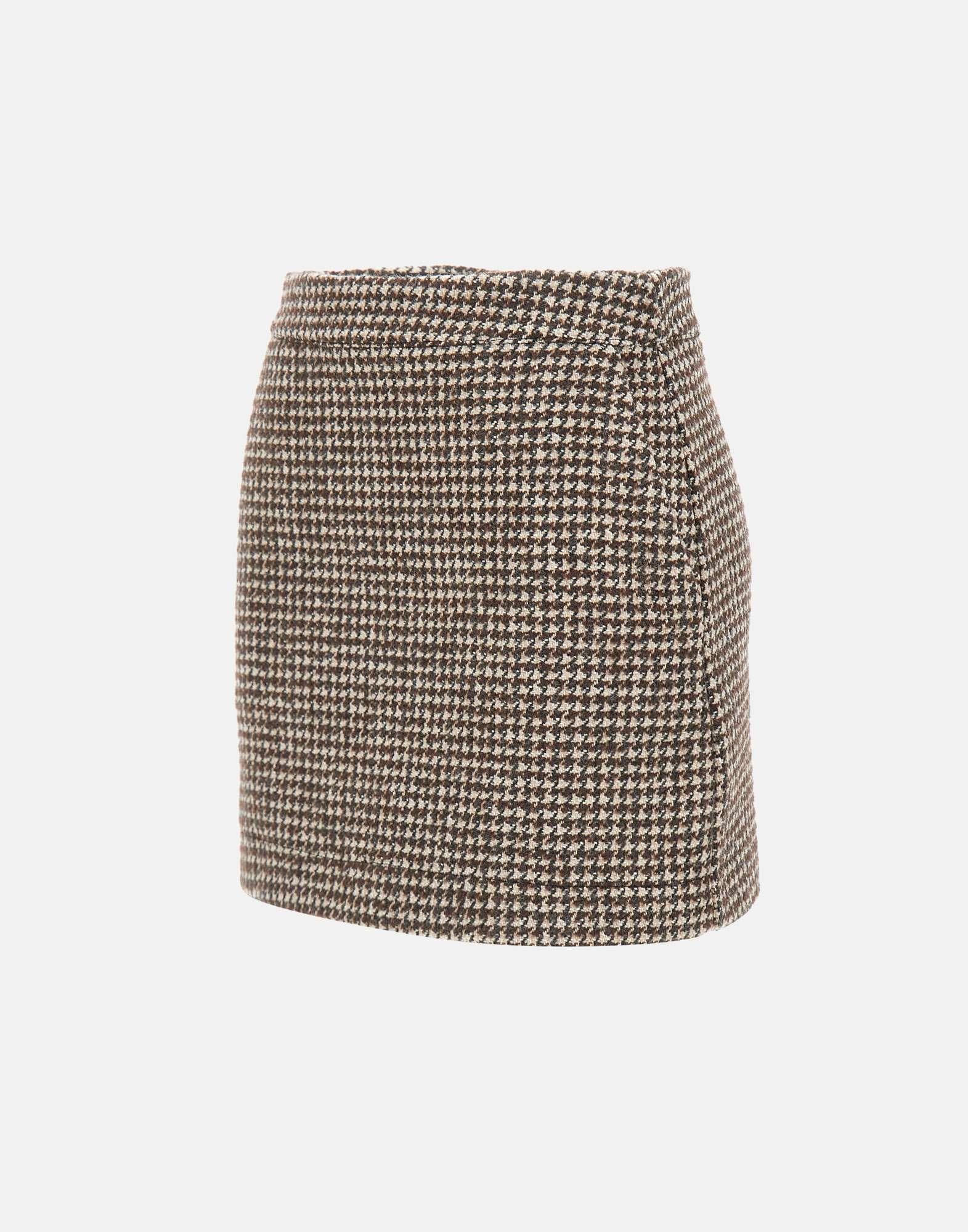 Kaos women's mini skirt with a houndstooth pattern in white and brown tones, offering a modern and stylish look. It features a back zip fastening, two front pockets, and a full inner lining for added comfort. A feminine and versatile piece, ideal for pairing with knitwear and outerwear for a bold seasonal outfit. Made in Italy.