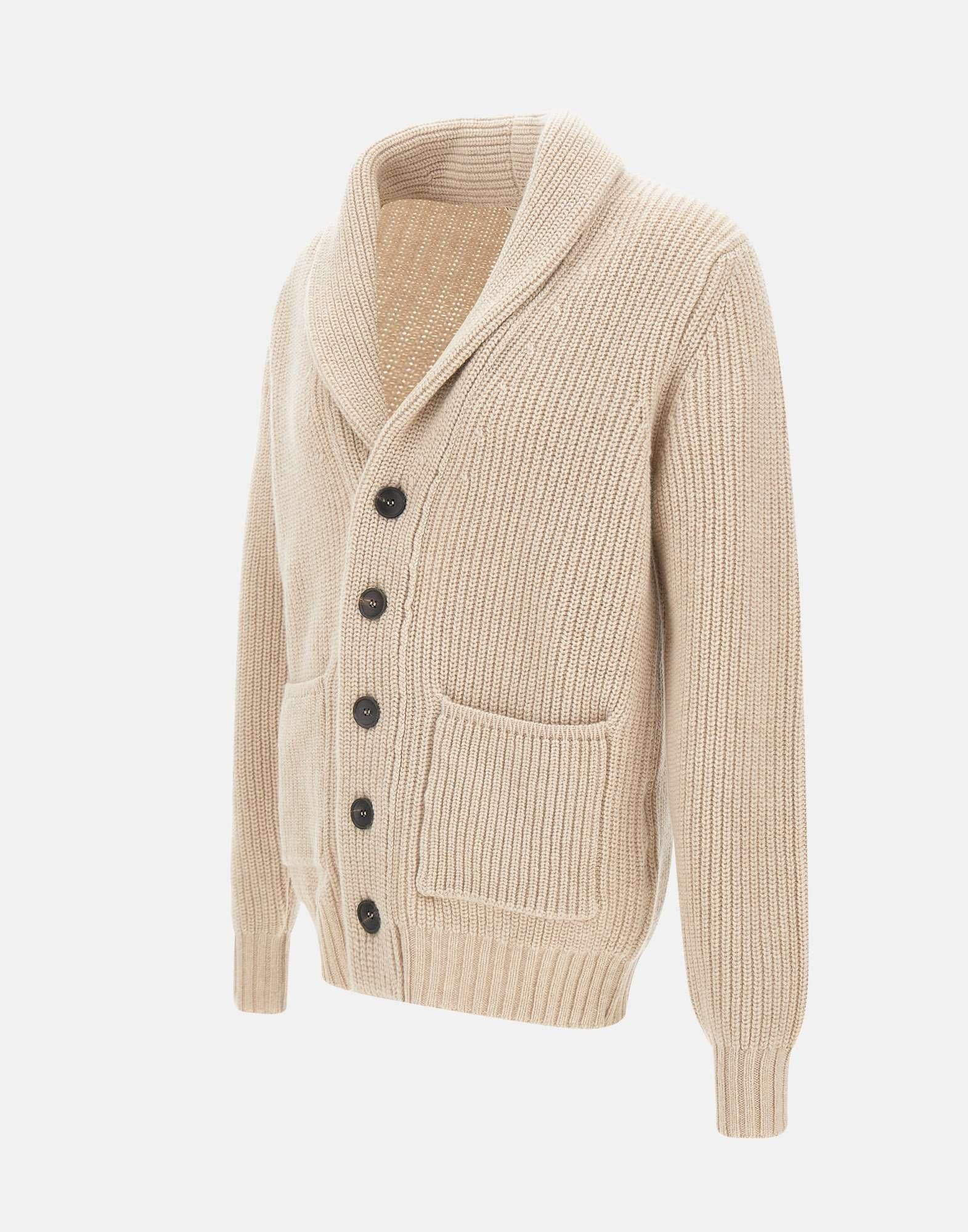 Filippo De Laurentiis men's wool and cashmere cardigan, coffee and milk, knitting, super soft and comfortable, wide shawl collar, contrasting button closure, long sleeves, ribbed edges, front pockets, regular but comfortable fit, made in Italy.