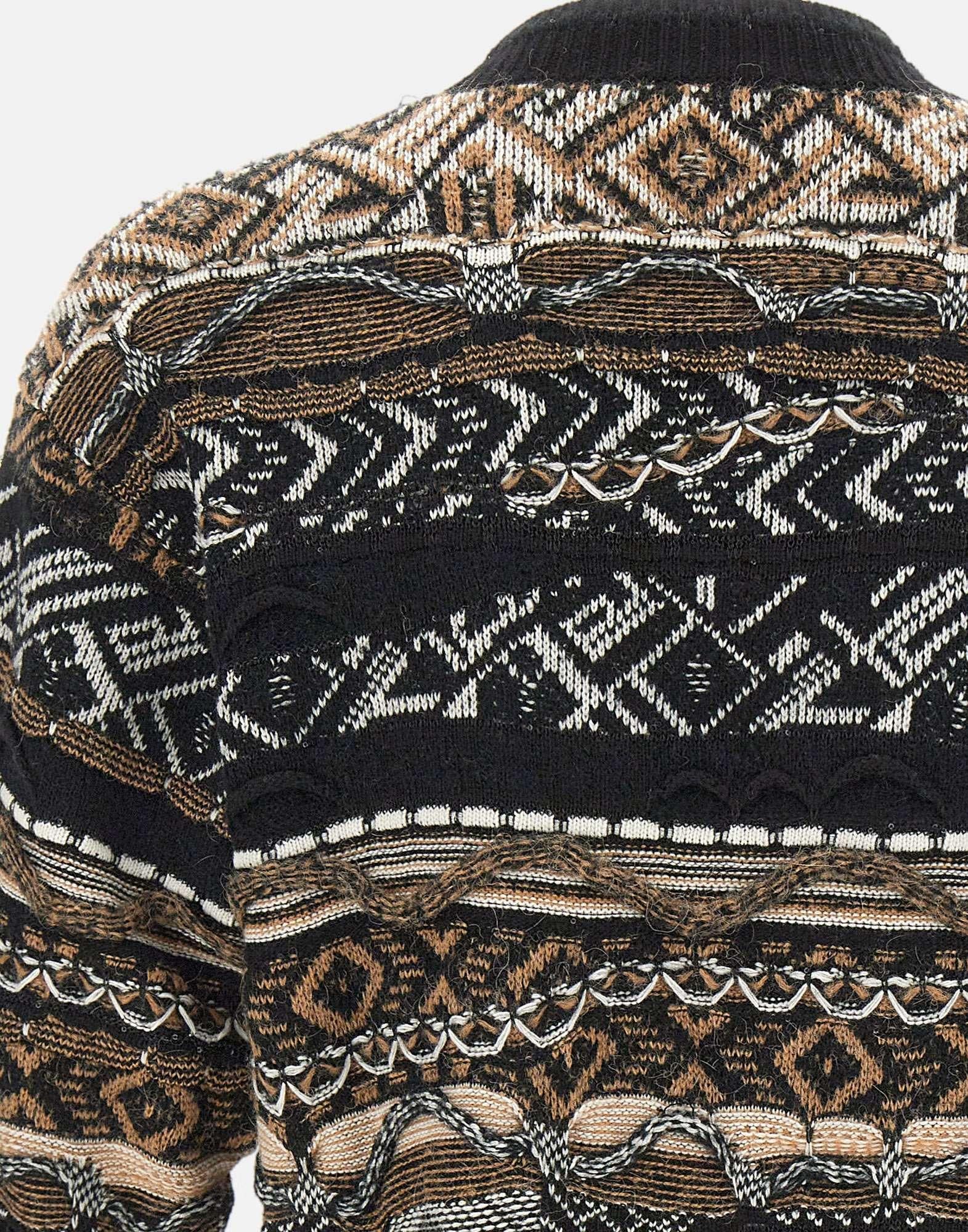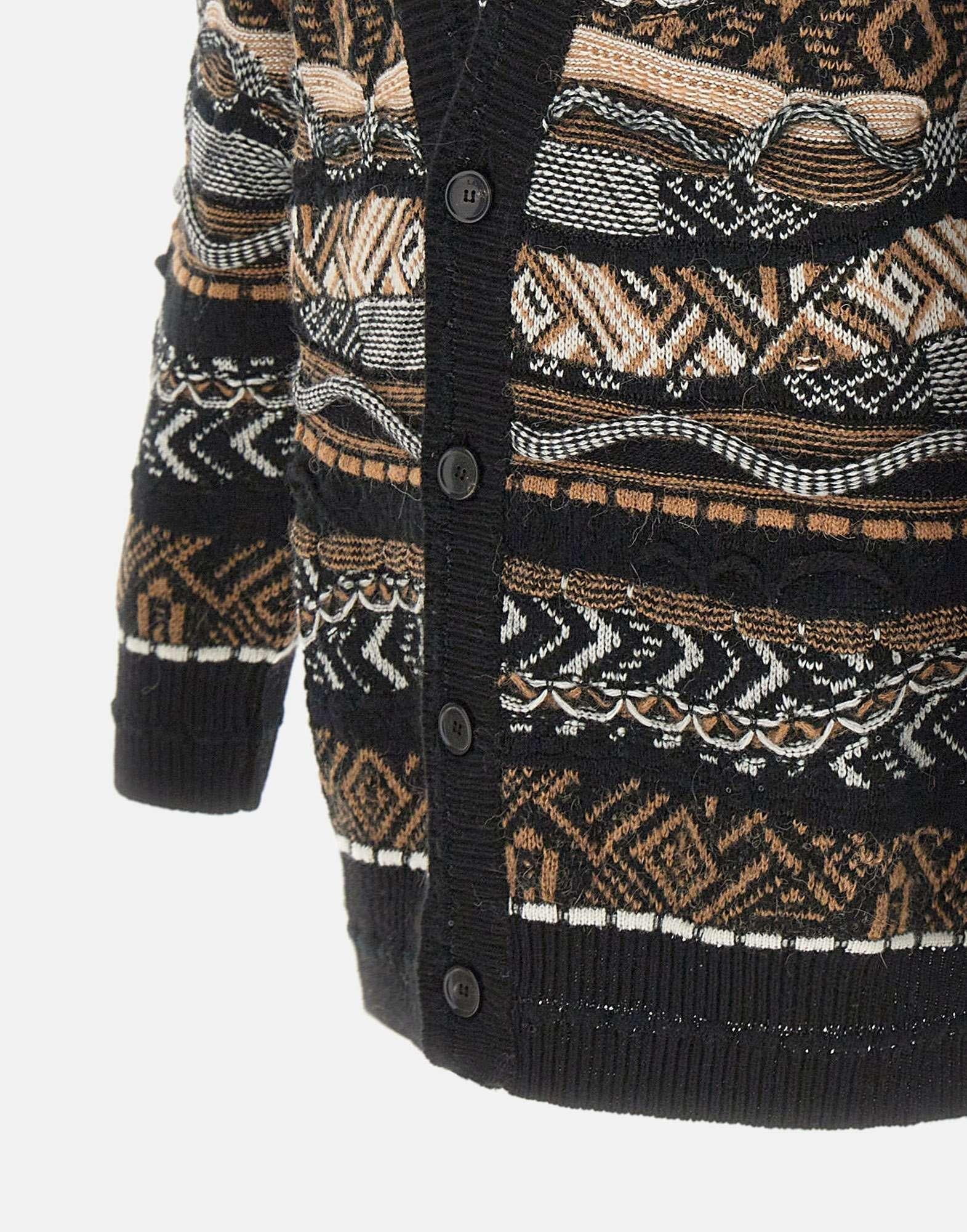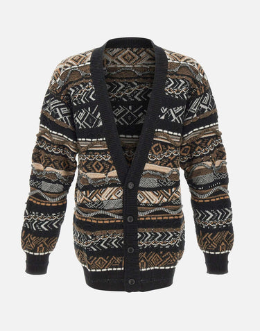 Men's cardigan by Laneus, crafted in a premium wool blend, featuring a seasonal reinterpretation of the brand's signature jacquard pattern in shades of brown, white, and black. The "Laneus" logo is seamlessly integrated into the design, showcasing sartorial attention to detail. Regular fit, button up front. A structured yet soft piece with a bold identity. Made in Italy.