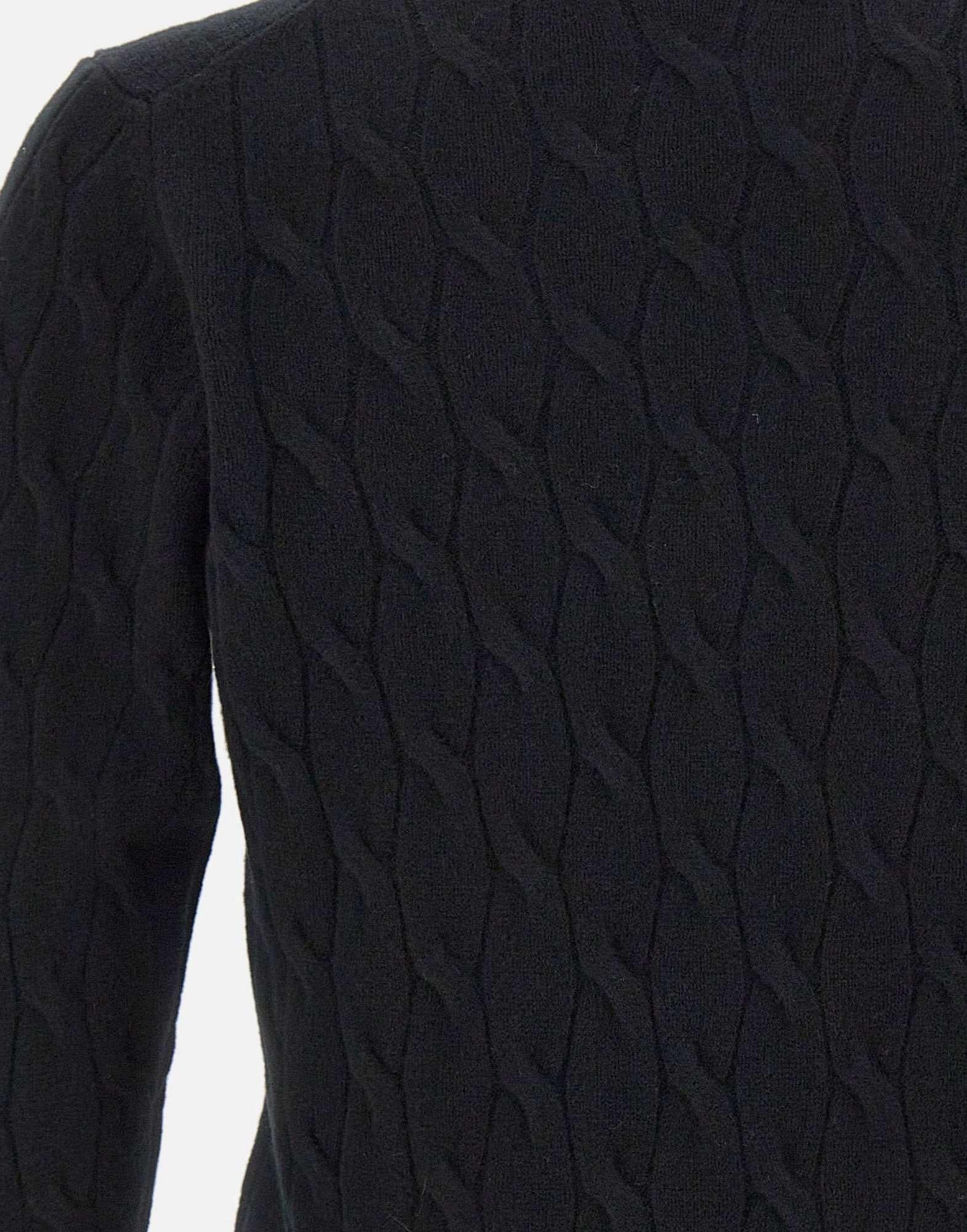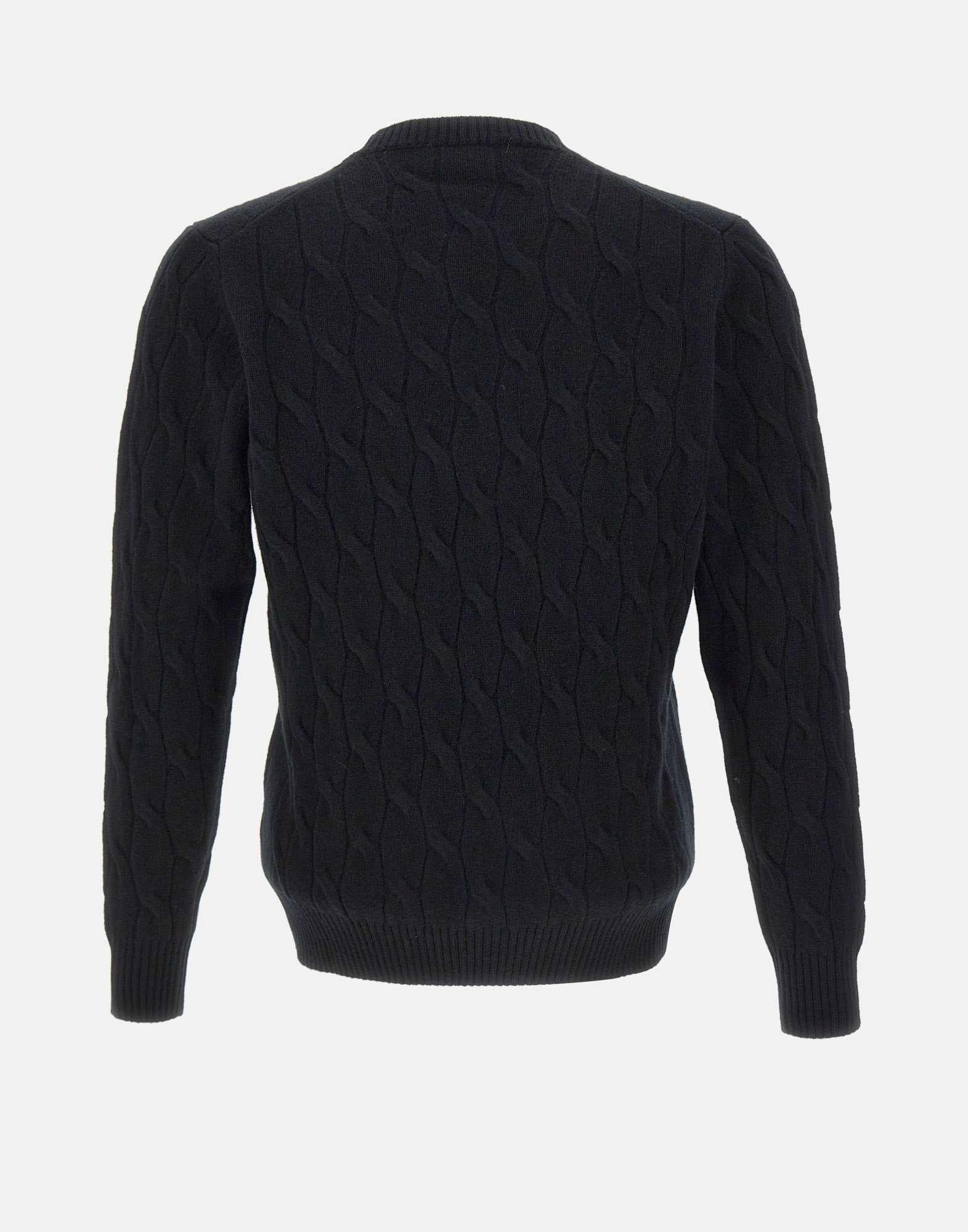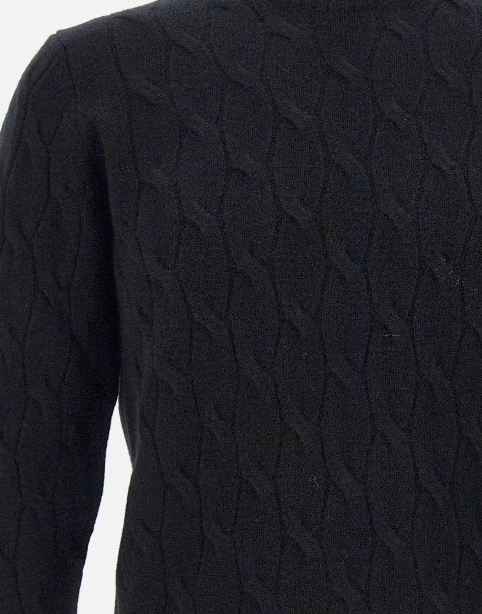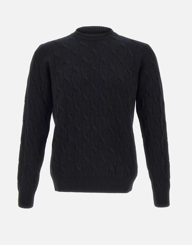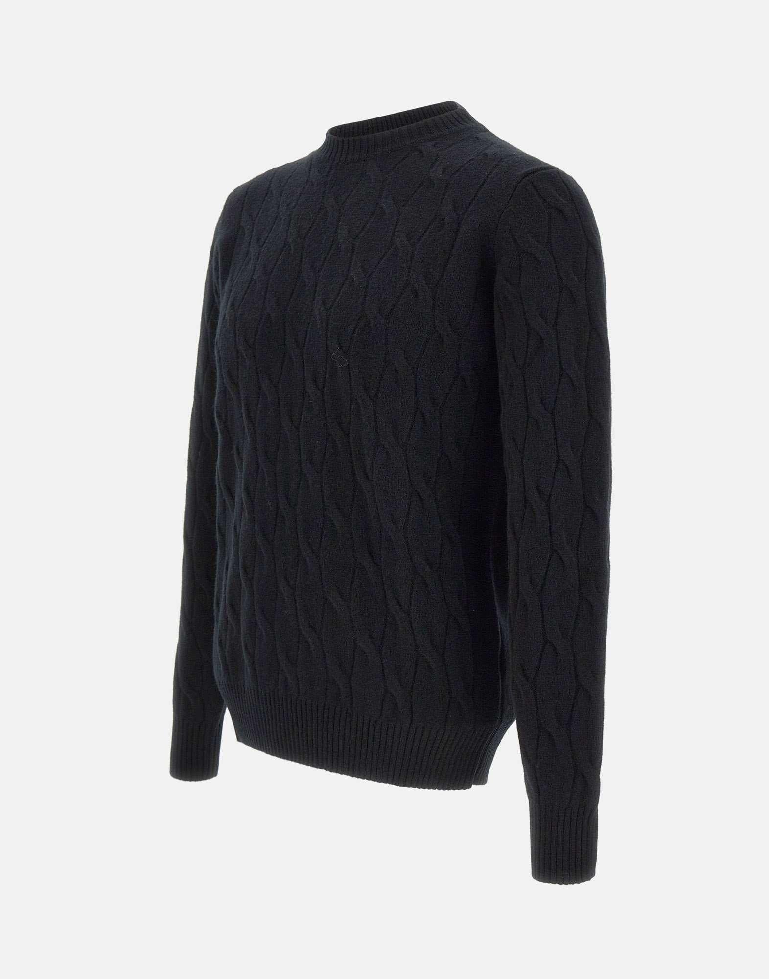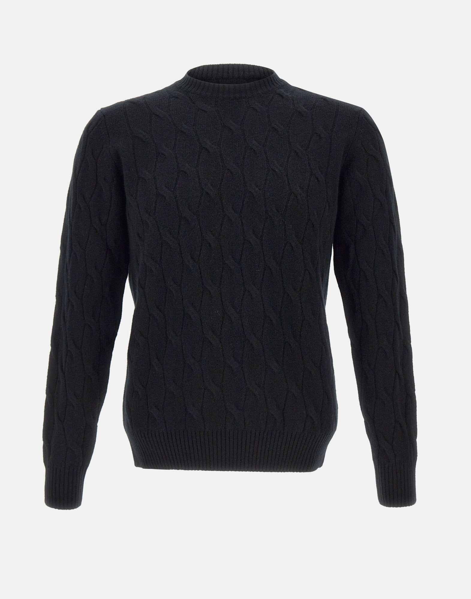 Men's sweater by Filippo De Laurentiis in a black wool and cashmere blend, featuring a refined cable knit texture. Crew neck with ribbed collar, cuffs and hem. The soft, warm yarn combines traditional craftsmanship with a modern twist. Slim fit for a sharp, elegant silhouette. A timeless wardrobe staple. Made in Italy.