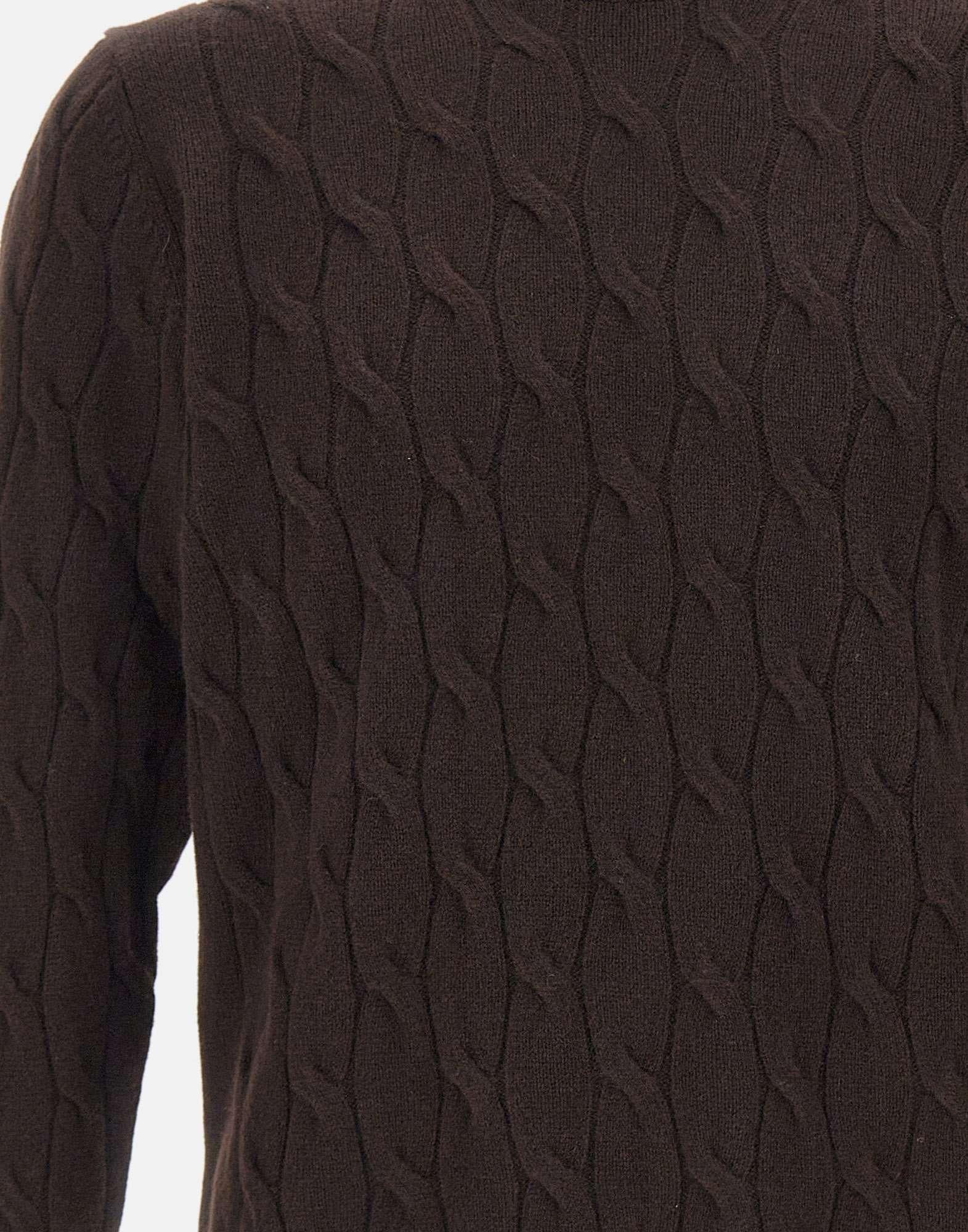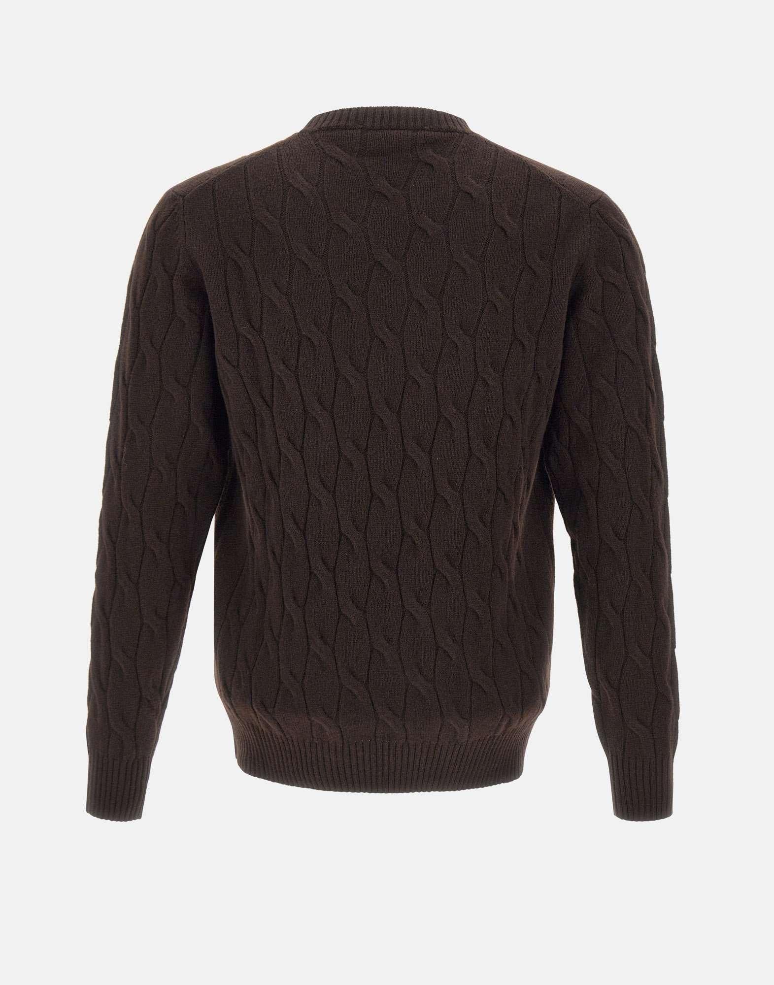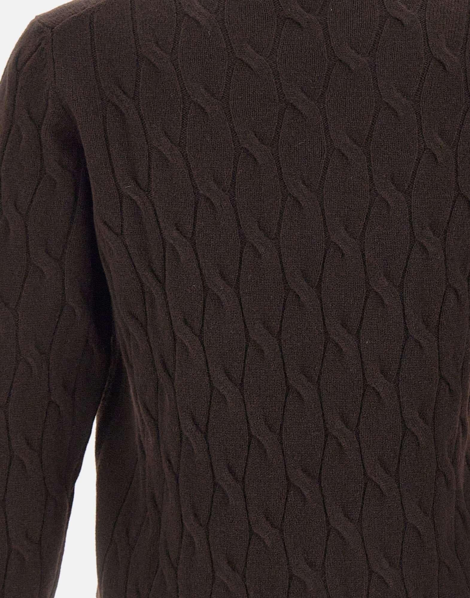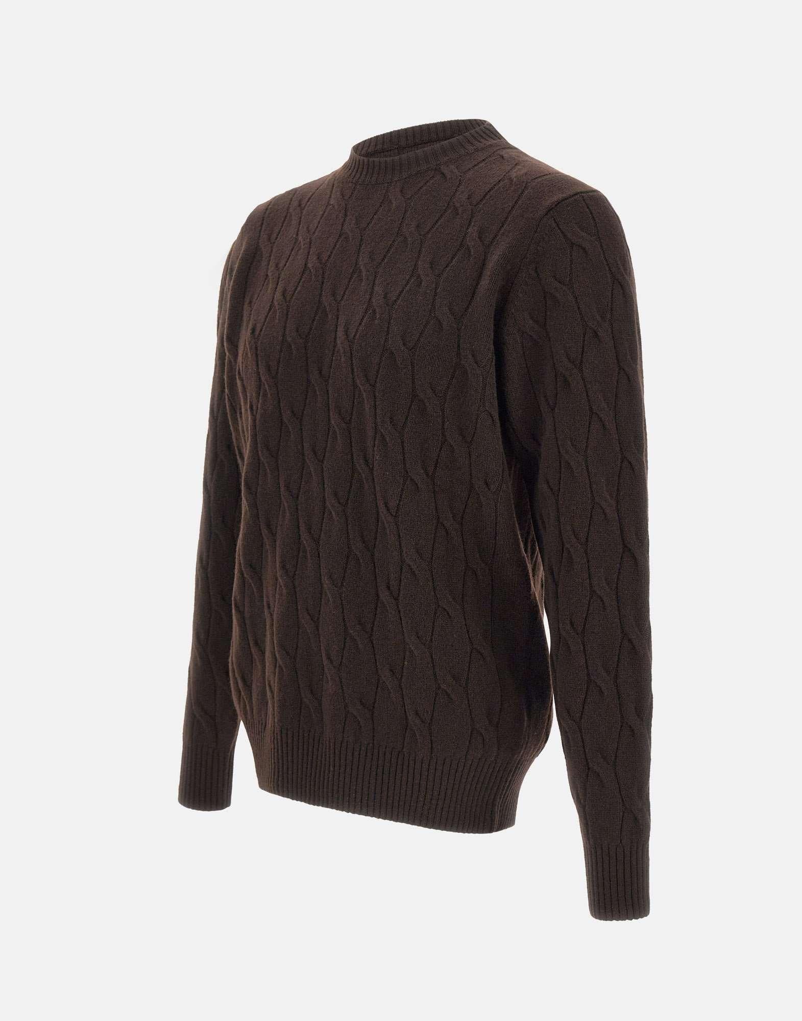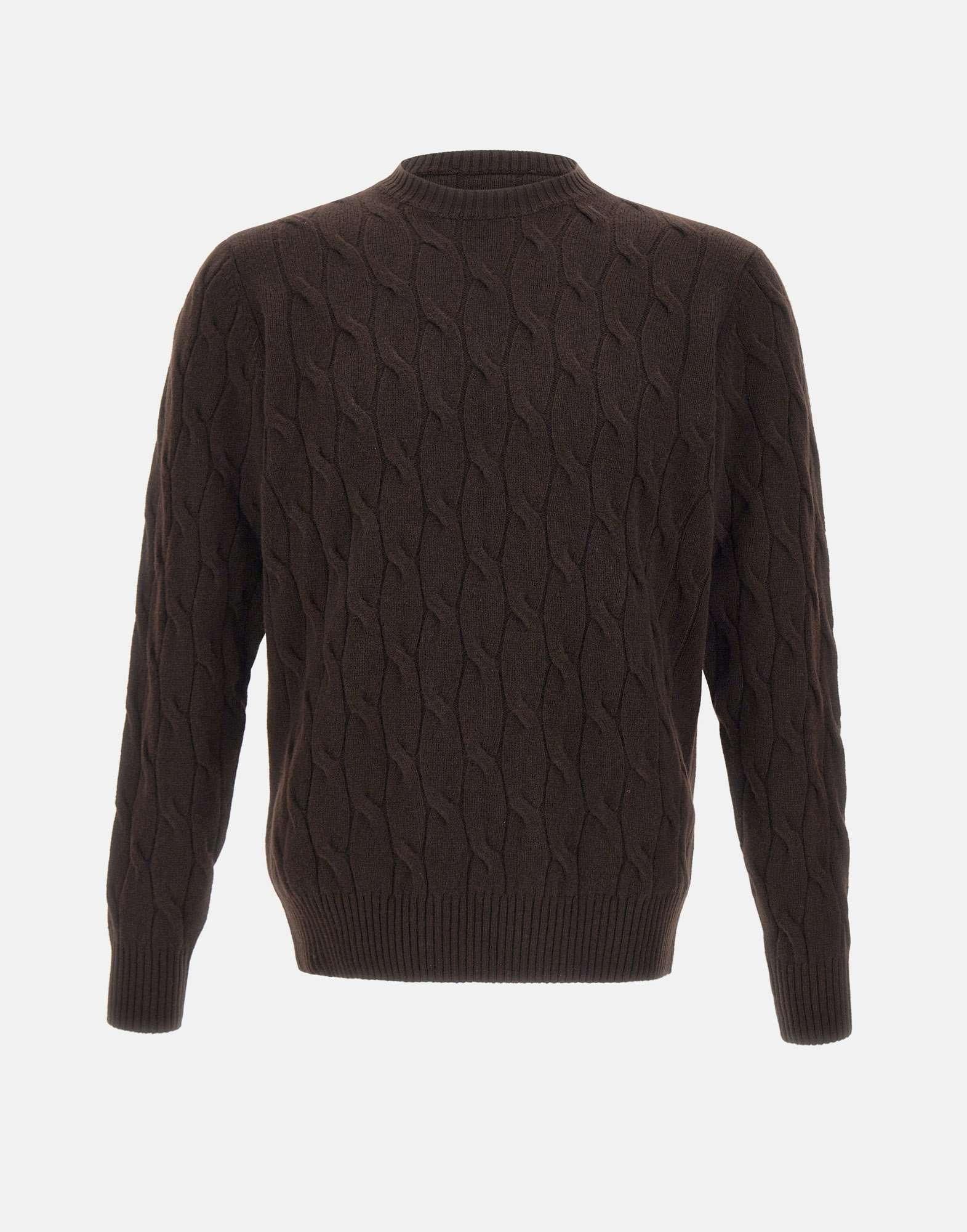 Men's sweater by Filippo De Laurentiis in a coffee shade wool and cashmere blend, featuring a refined cable knit texture. Crew neck with ribbed collar, cuffs and hem. The soft, warm yarn combines traditional craftsmanship with a modern twist. Slim fit for a sharp, elegant silhouette. A timeless wardrobe staple. Made in Italy.