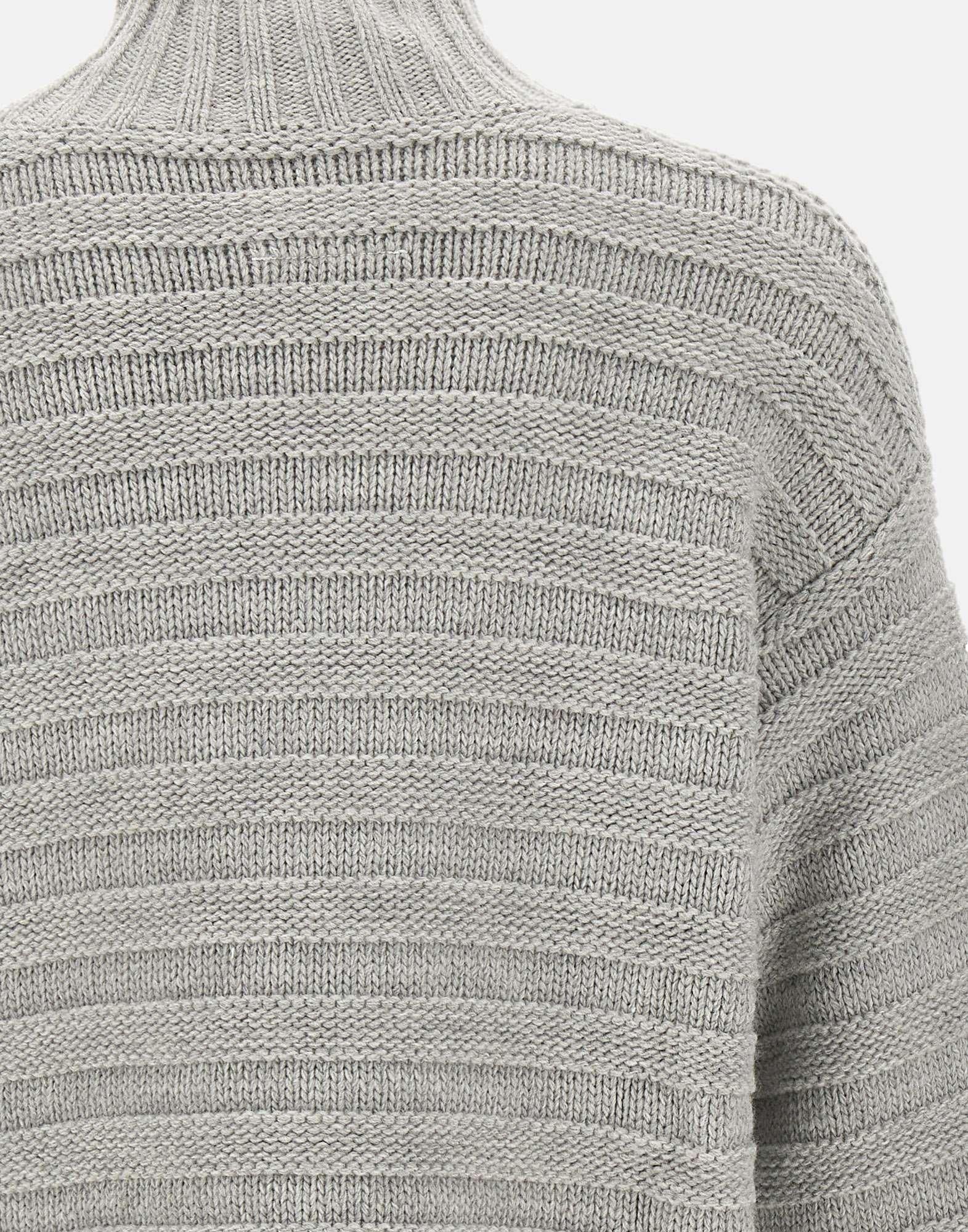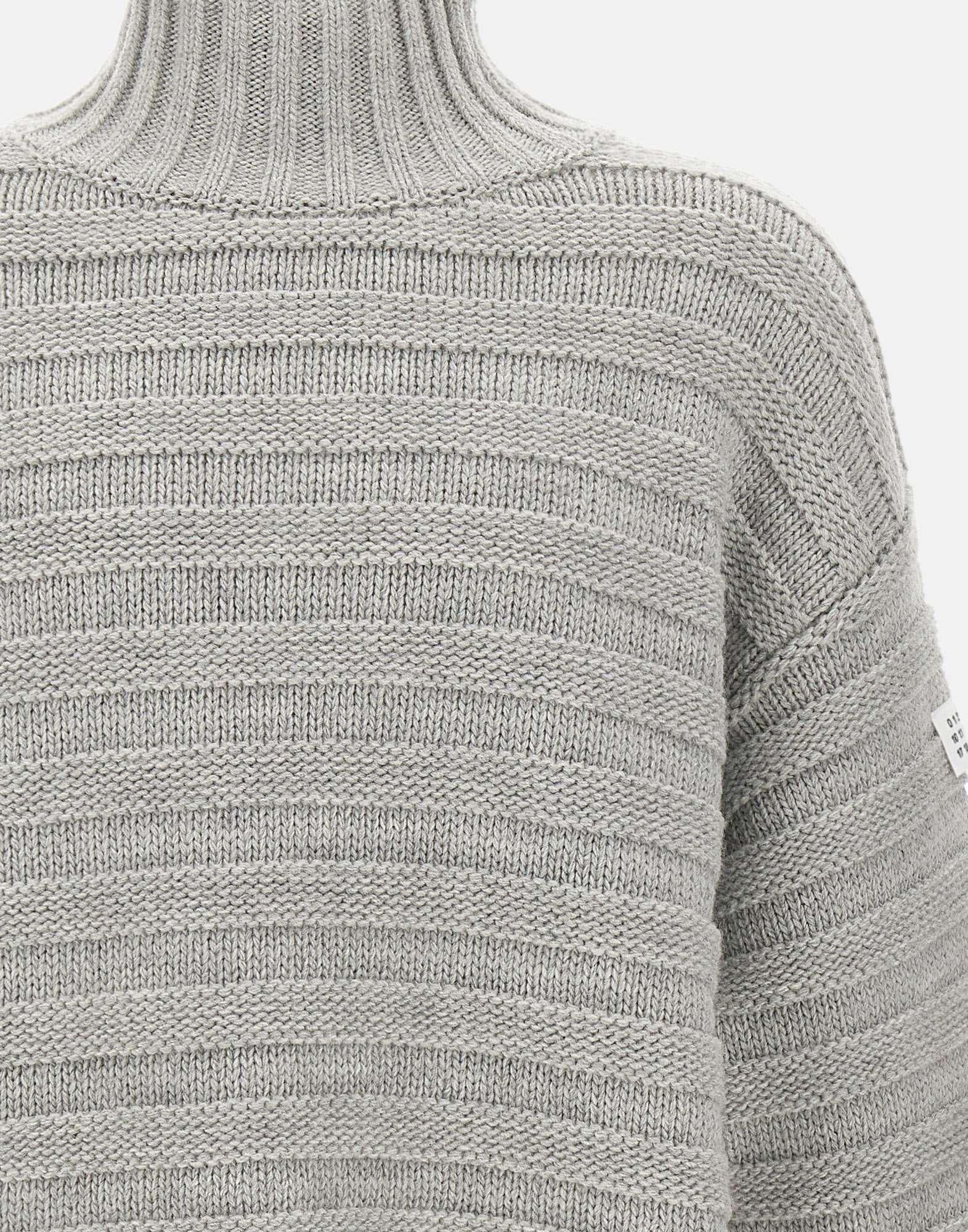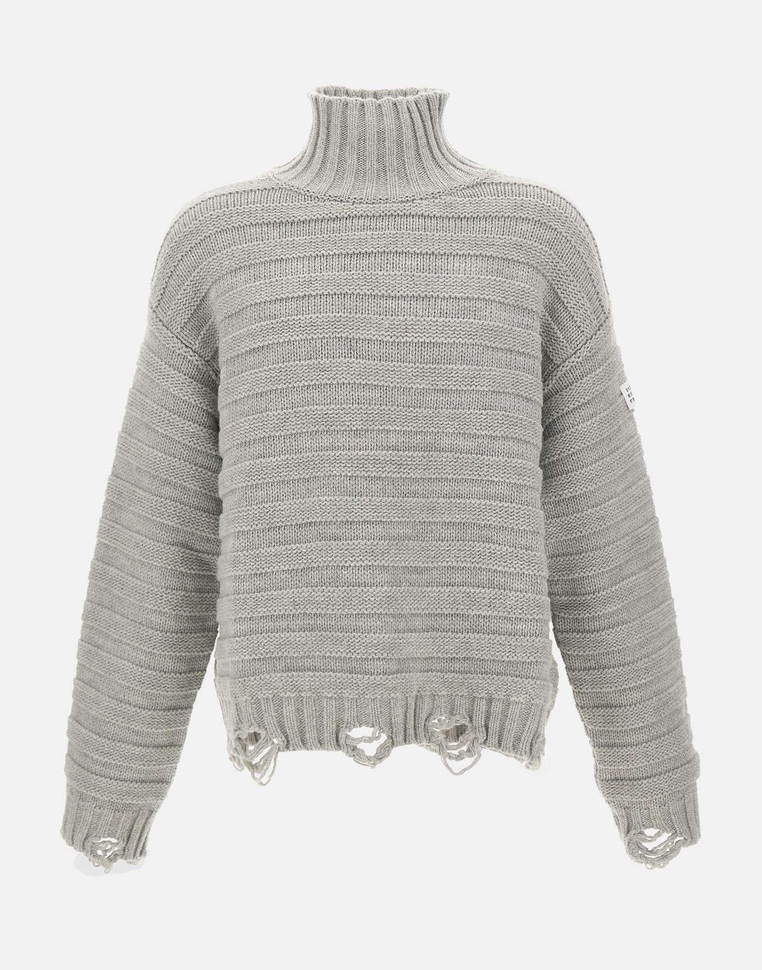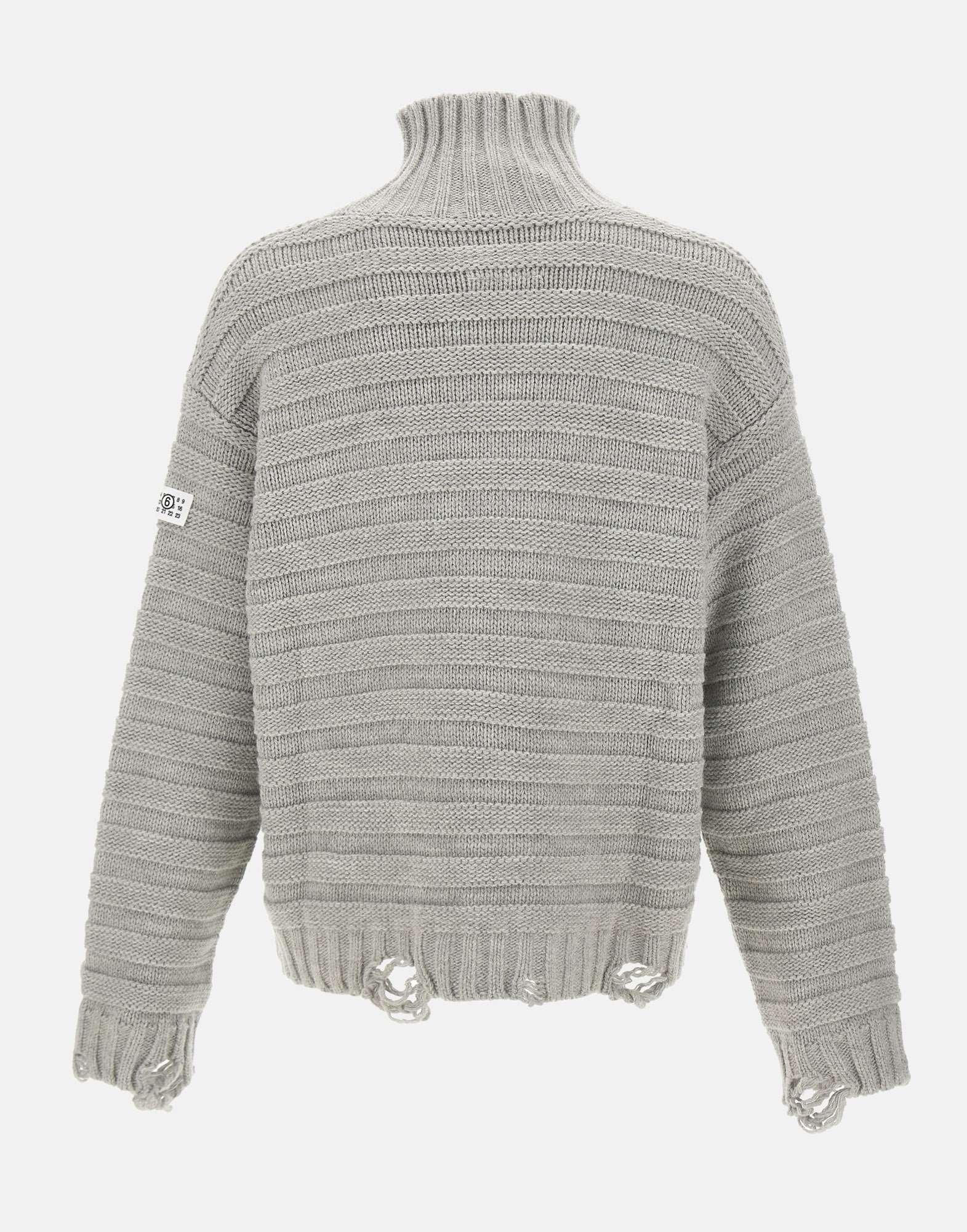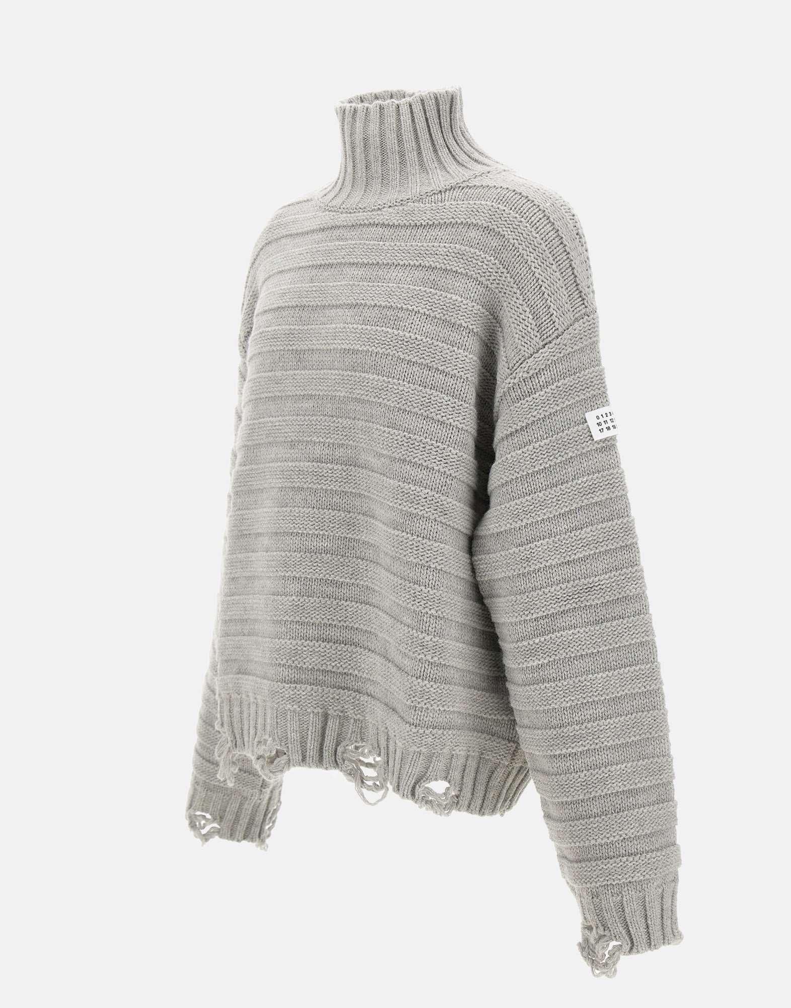 Maison Margiela men's sweater in grey wool blend, embodying the brand'HihhHihn s experimental and nonconformist spirit. Knitted with intentionally distressed details, it features a high neckline, soft shoulders, and a subtly tapered structure. The oversized fit is finished with ribbed trims and the iconic numeric signature on the left sleeve. At the back, the discreet yet unmistakable MM6 stitching line completes the design.