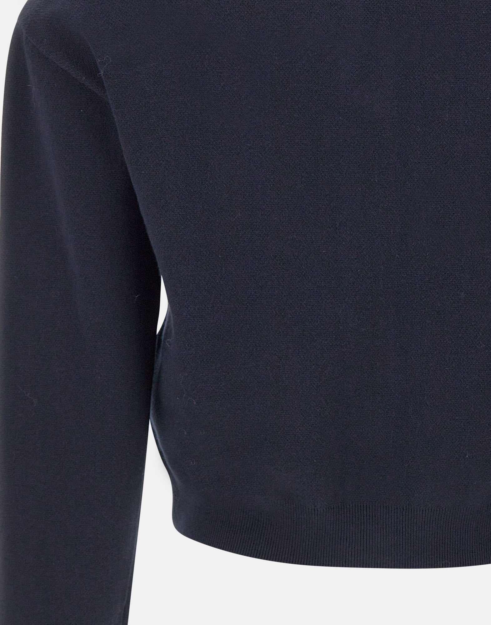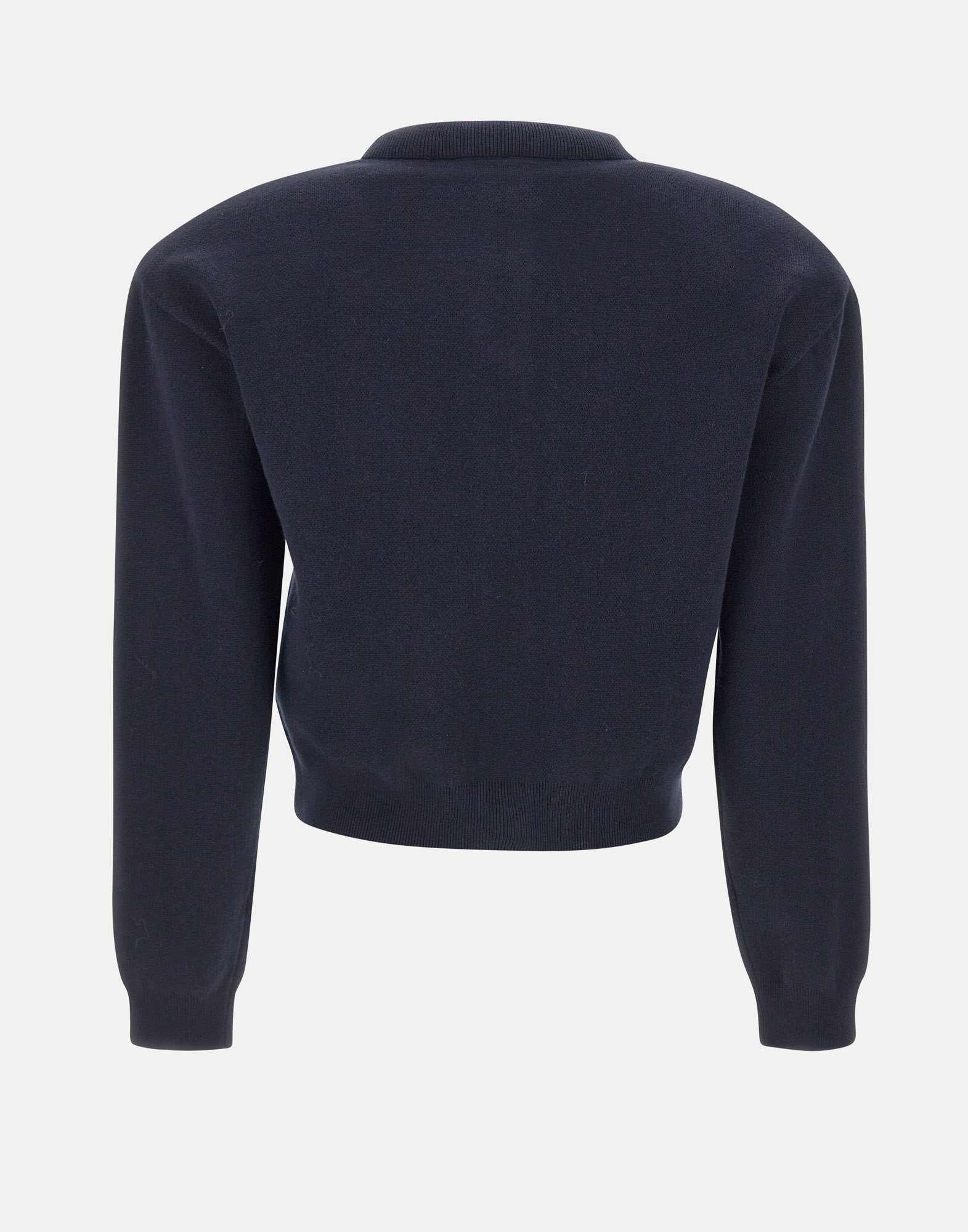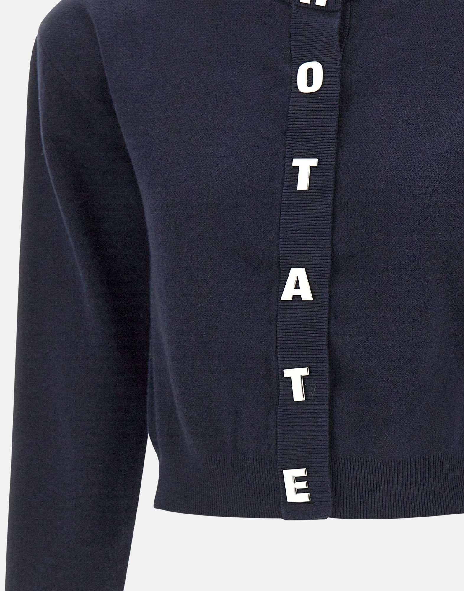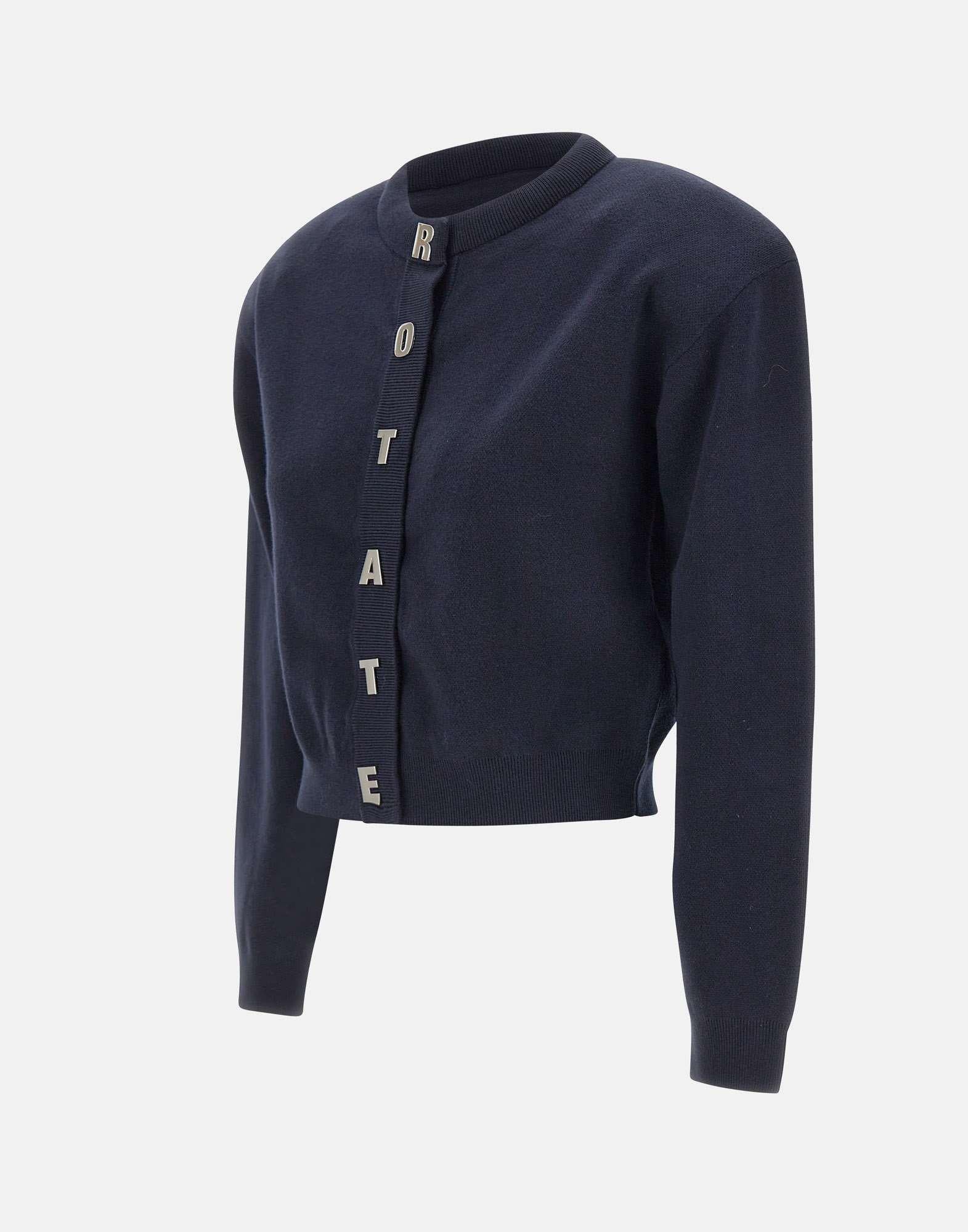 Rotate Birger Christensen's "Firm Knit Cardigan" women's cardigan in a cotton and cashmere blend, in blue, features a compact and refined texture. It features long sleeves, a round neck, and a cropped fit. The front closure with decorative metal buttons engraved with the logo adds a distinctive touch. Detachable shoulder straps elegantly define the silhouette. Part of the Sunday Collection, it features a relaxed fit and a contemporary aesthetic.