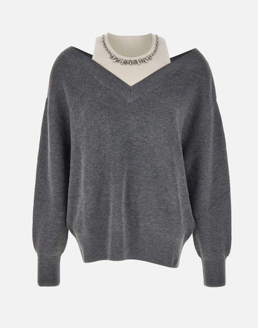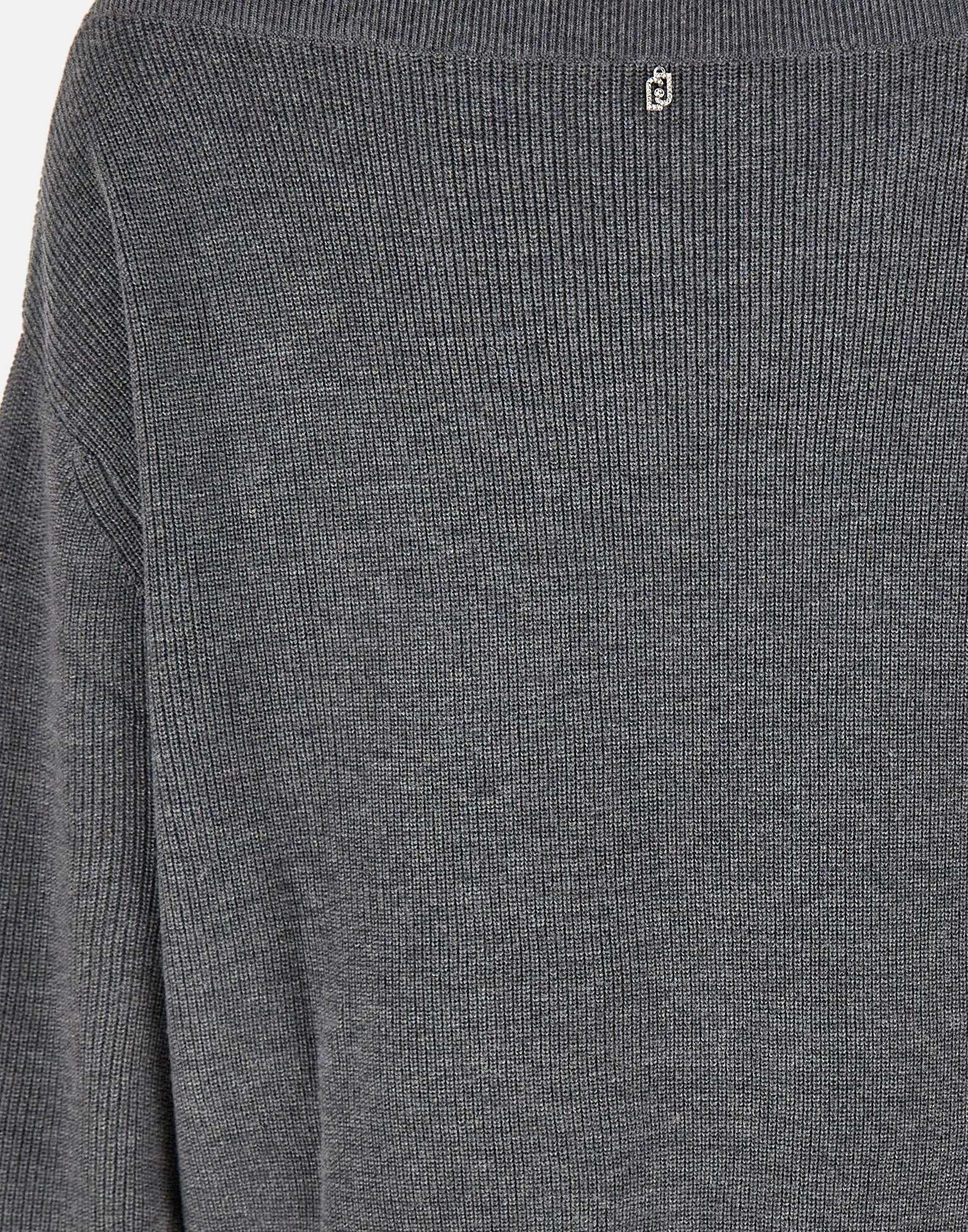 Liu Jo women sweater in grey wool blend with a contrasting white insert at the neckline. The wide V neck features an applied white camisole top enriched with jewel embroidery, creating a refined layered effect. Dropped shoulders form a subtle cut out design, while long sleeves with ribbed cuffs and a ribbed hem complete the look. Soft fit for a modern and feminine style.