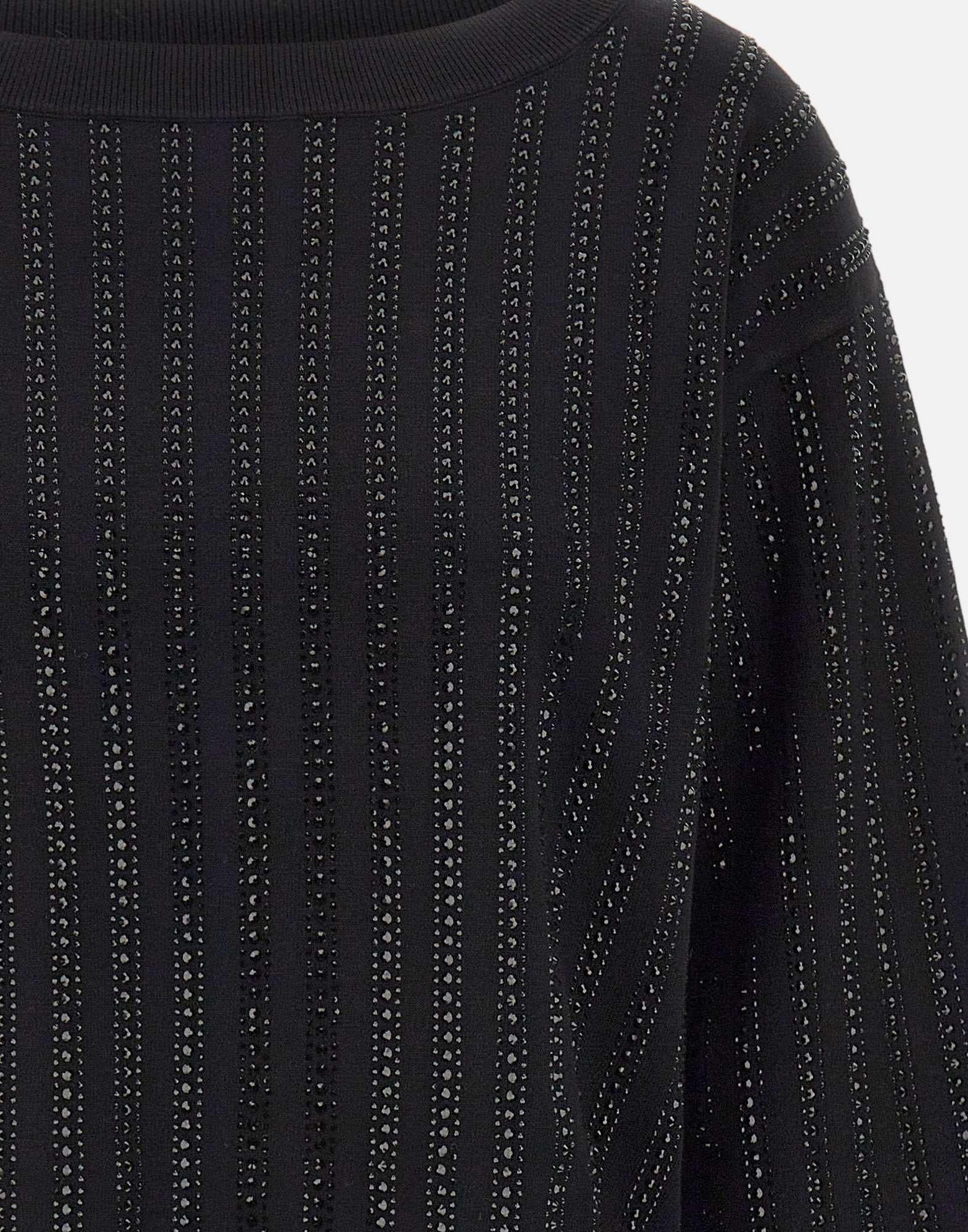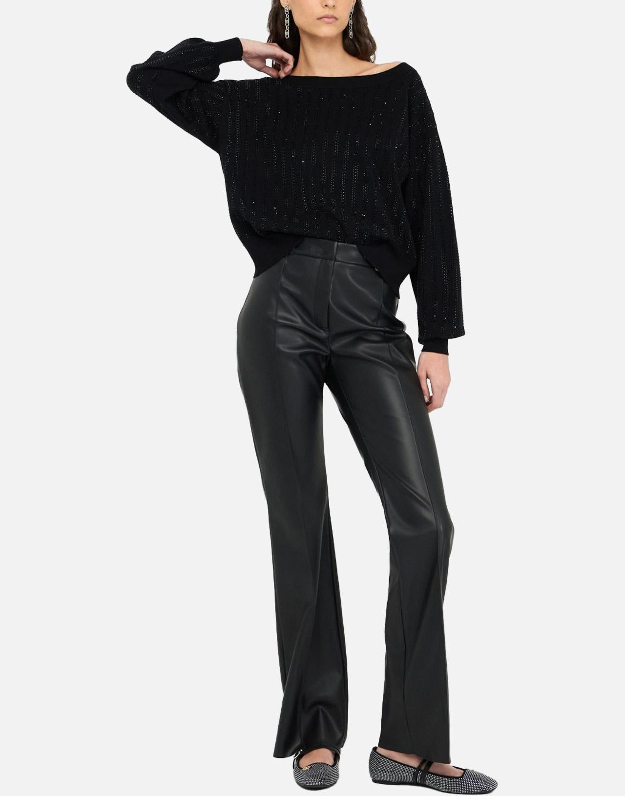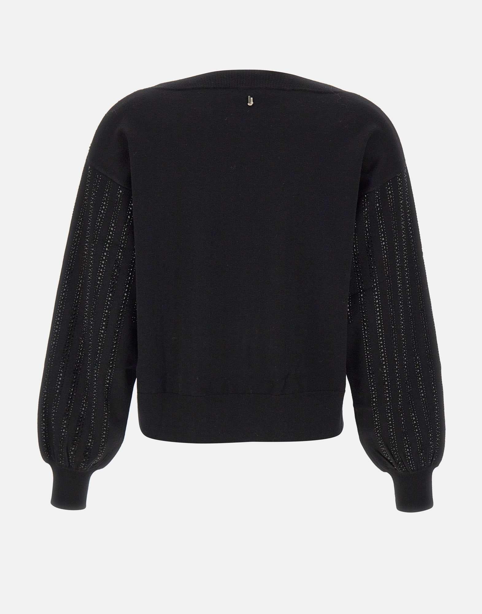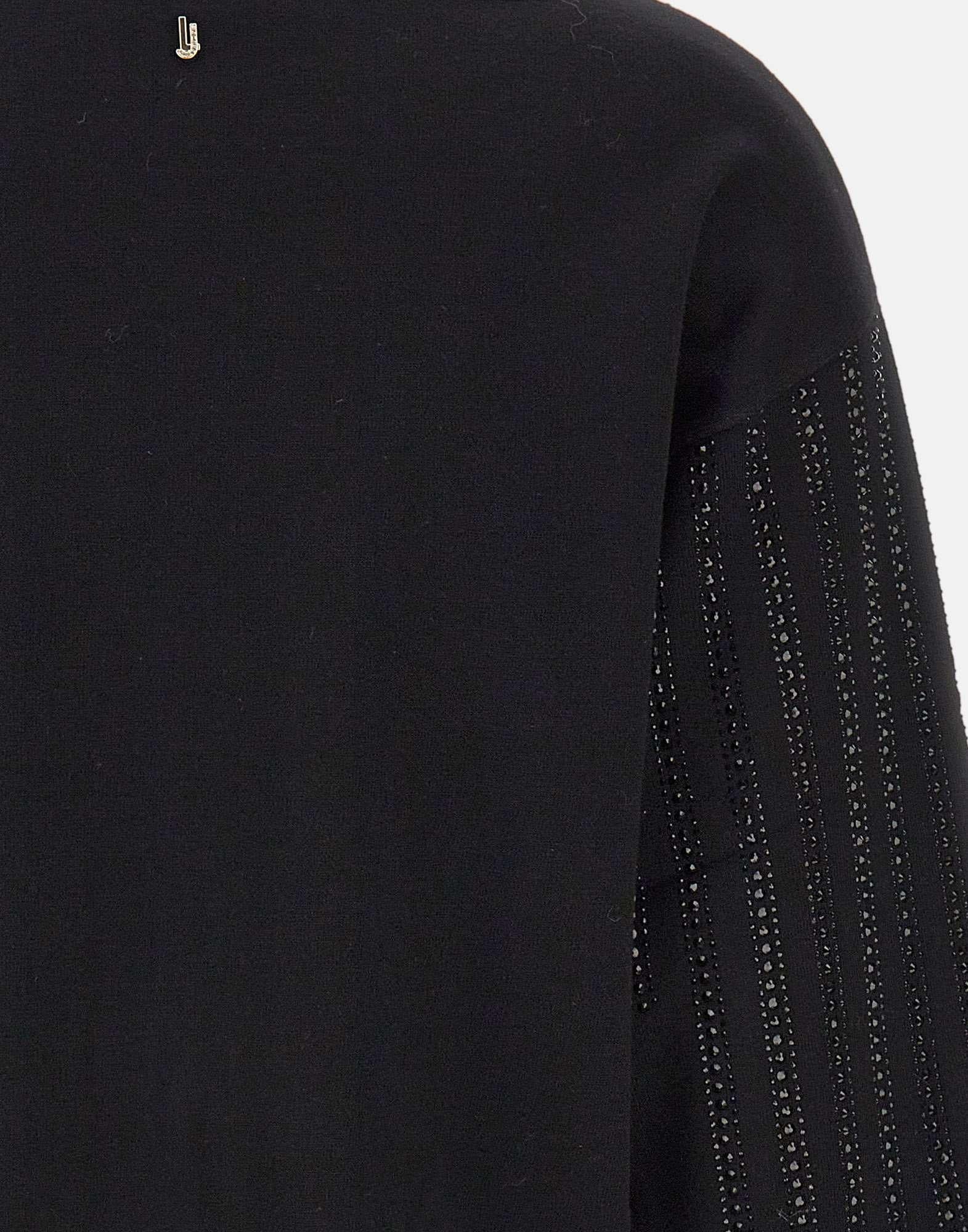 This black Liu-Jo sweater combines elegance and comfort in a feminine and sparkling design. Crafted from a soft viscose blend, it features a refined boat neckline that discreetly accentuates décolleté, while the long puff sleeves add volume and style to look. Embellished with rhinestone appliques and metal LJ logo with rhinestones, this sweater is perfect for those who love sparkling details without sacrificing comfort. Ribbed edges complete garment, which stands out for its relaxed fit, ideal for wearing with jeans, trousers, or skirts, both day and night.