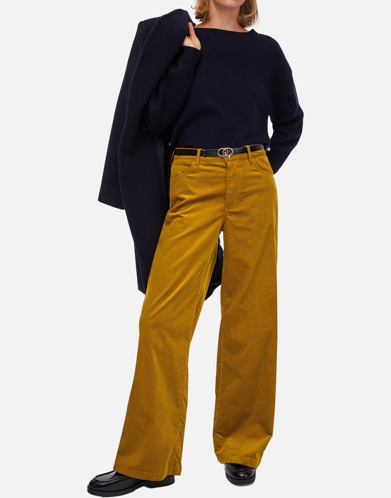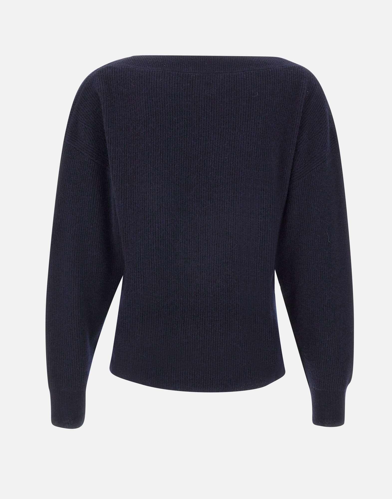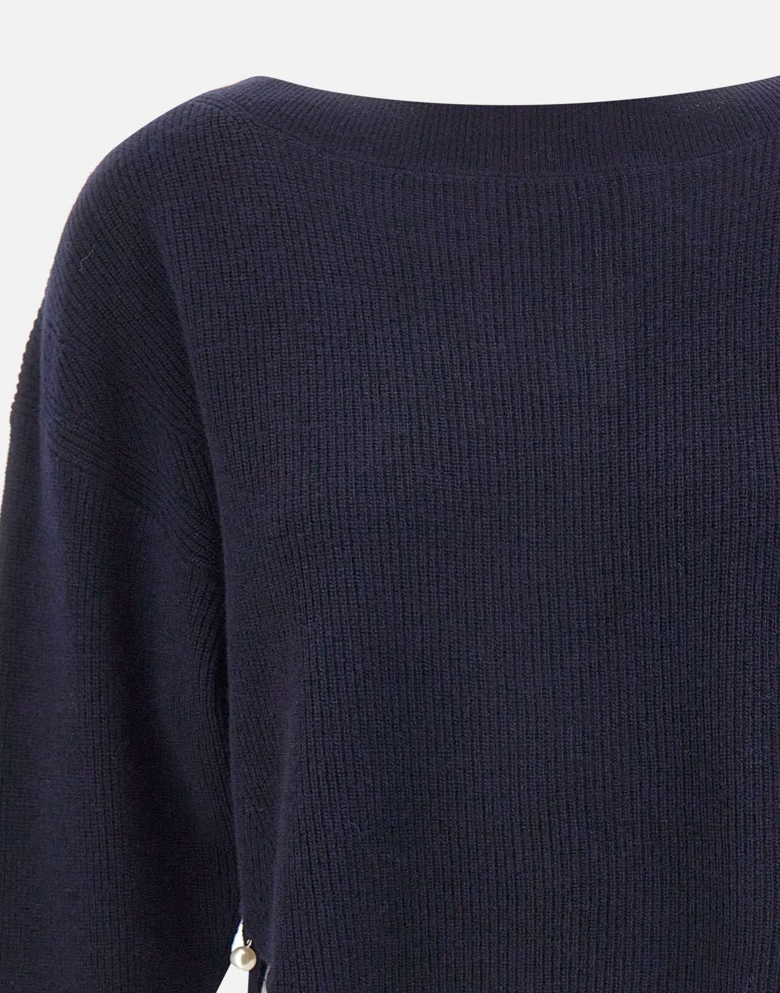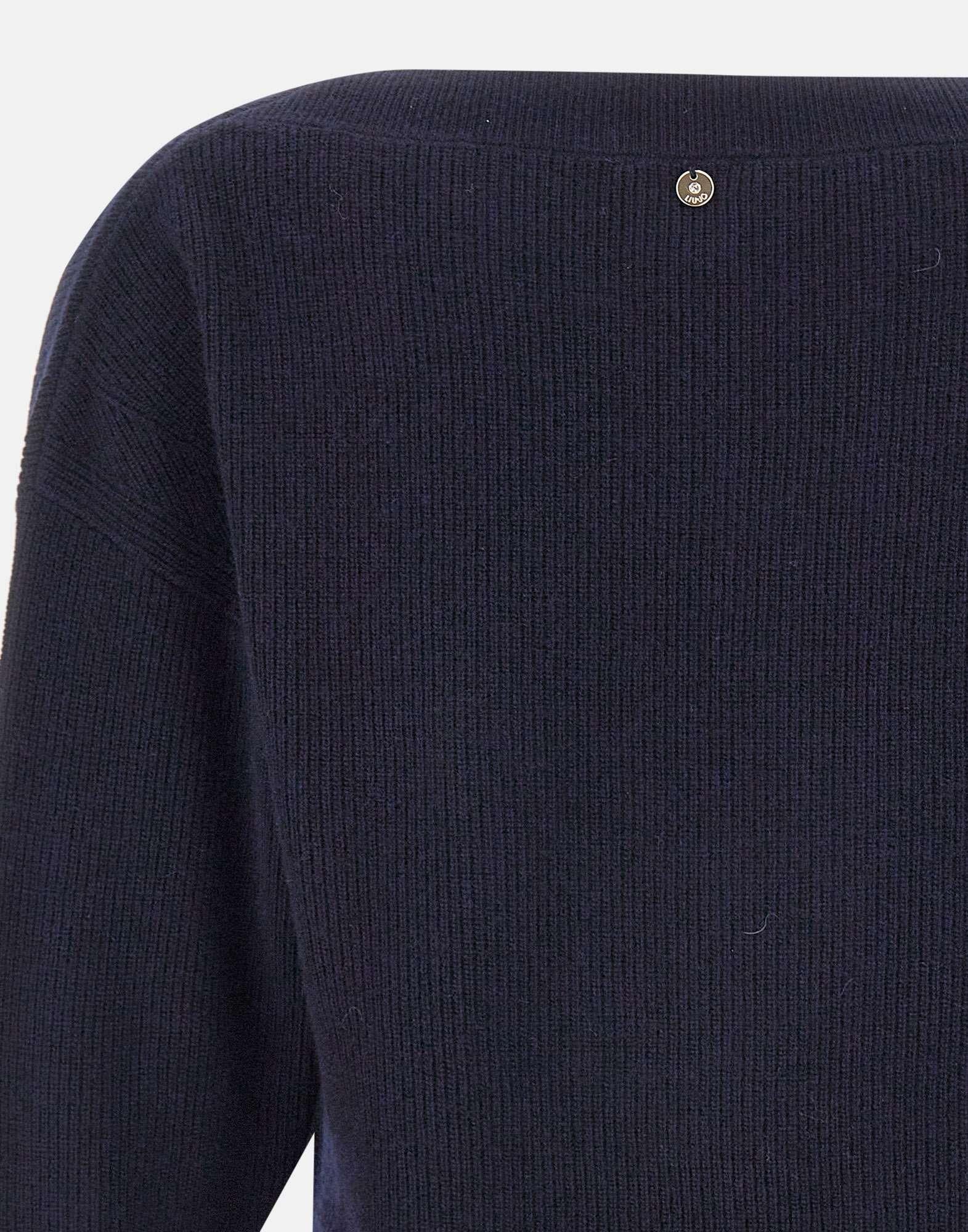 This Liu-Jo sweater in blue is an elegant and refined piece, perfect for facing cold season in style and comfort. Crafted from a premium blend of wool and cashmere, it offers a pleasantly soft feel against skin and natural warmth. The ribbed knit adds texture and character to design, while the boat neckline accentuates décolleté with a subtle femininity. The long sleeves with dropped shoulders and side slits embellished with decorative pearls add a sophisticated and distinctive touch. The metal logo on the back and the comfortable relaxed fit complete the piece, ideal for a chic and relaxed look, perfect paired with tailored trousers or jeans.