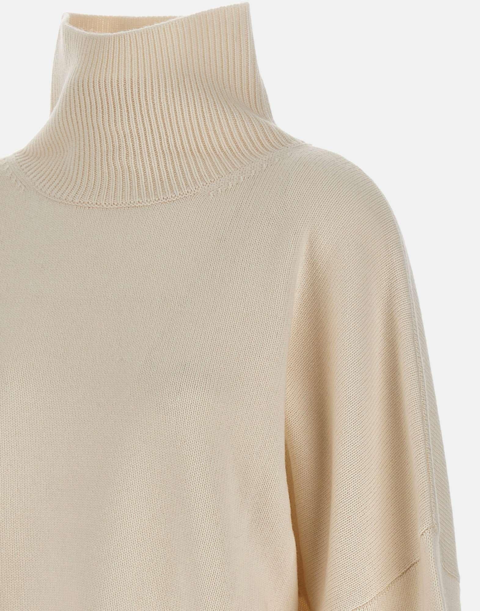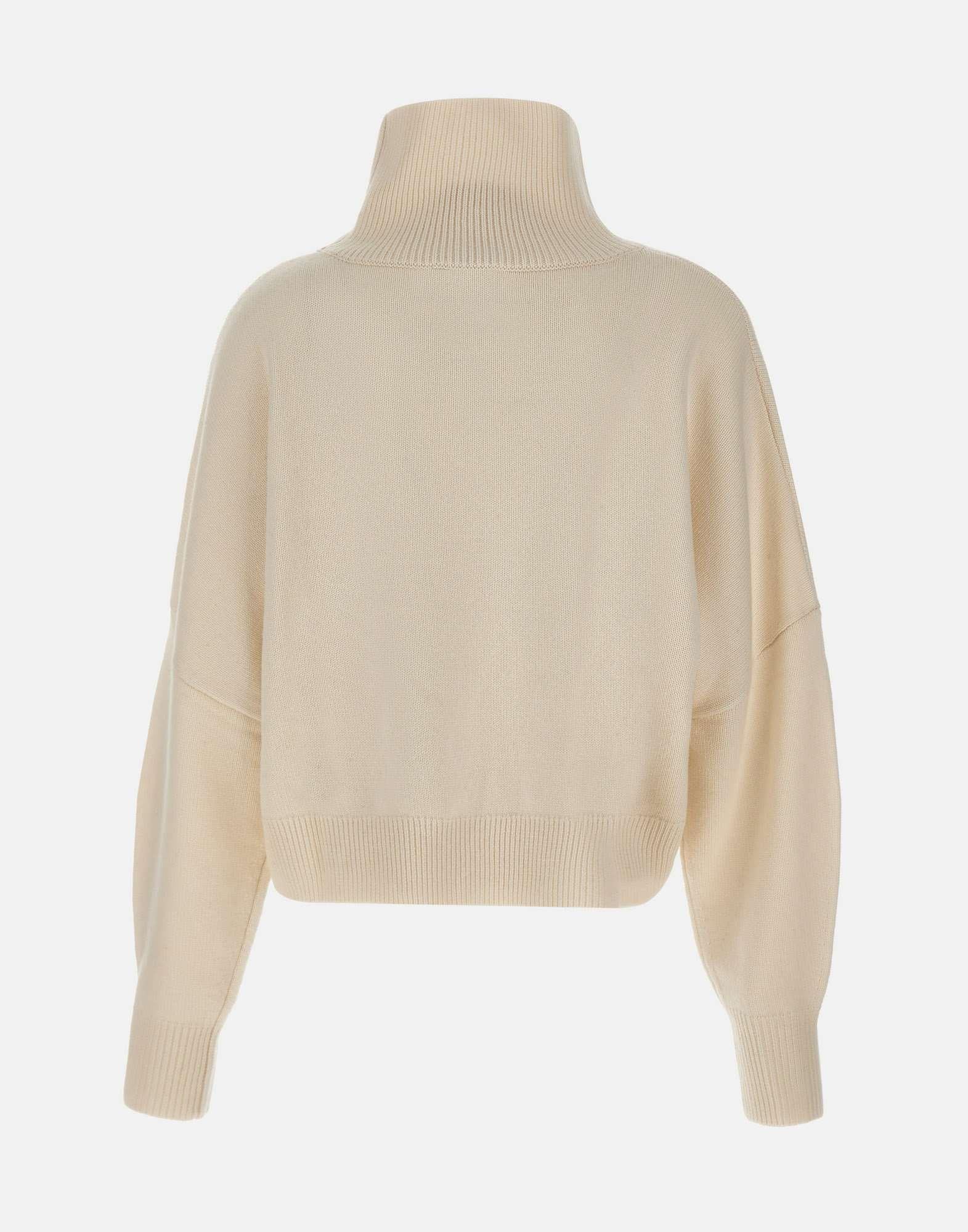 Loulou De Saison "Luke" womens turtleneck sweater crafted from soft white wool and cashmere. Features a straight fit with dropped shoulders, ribbed high neck, cuffs, and hem. The embroidered logo at the bottom adds a subtle, refined touch to this timeless and elegant winter essential.