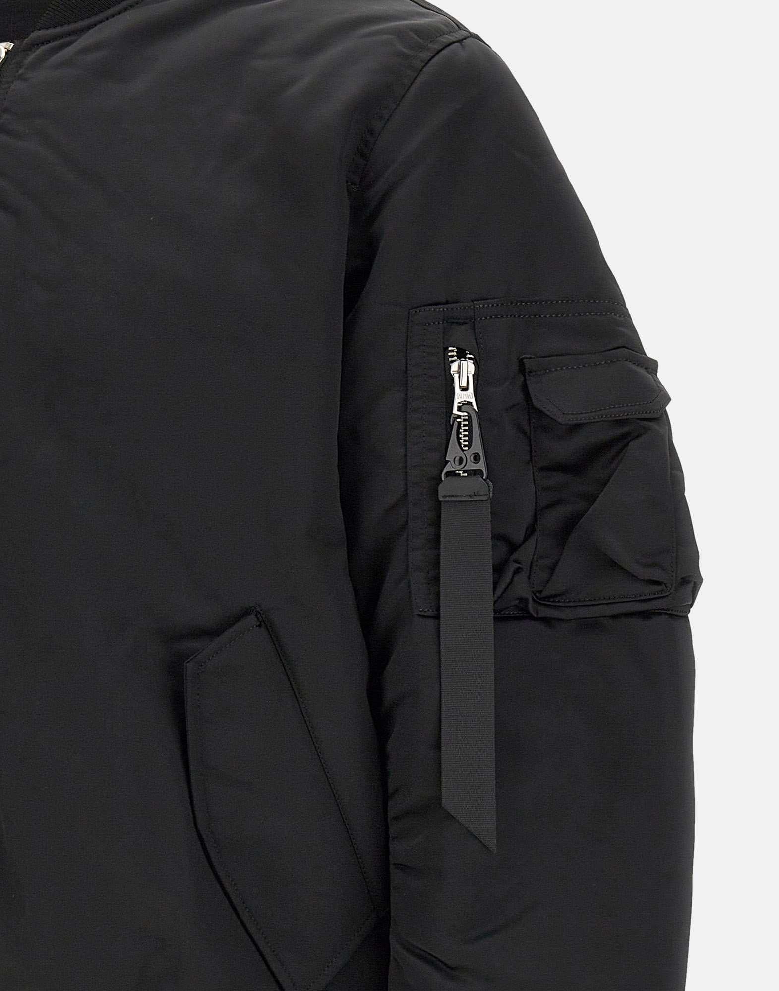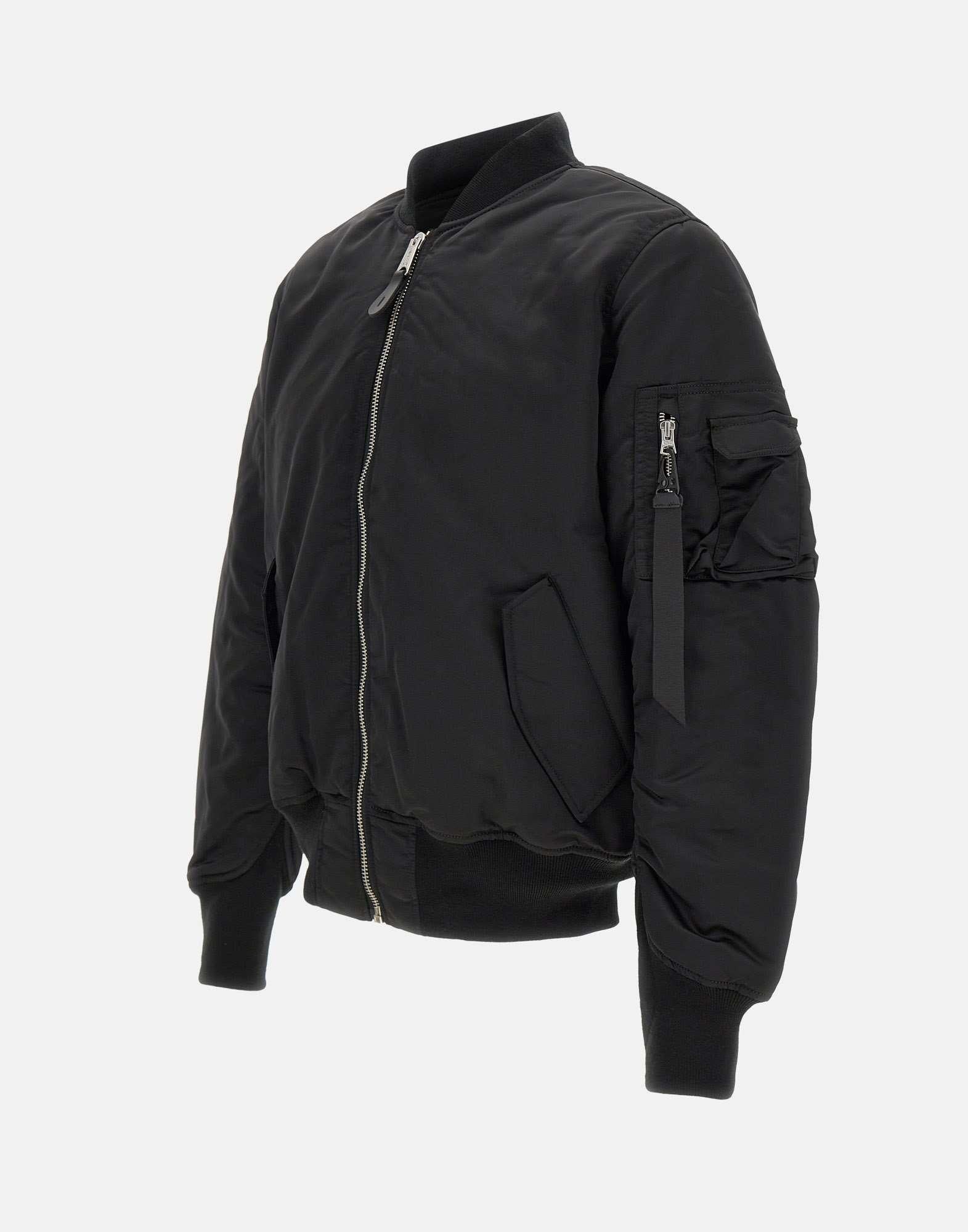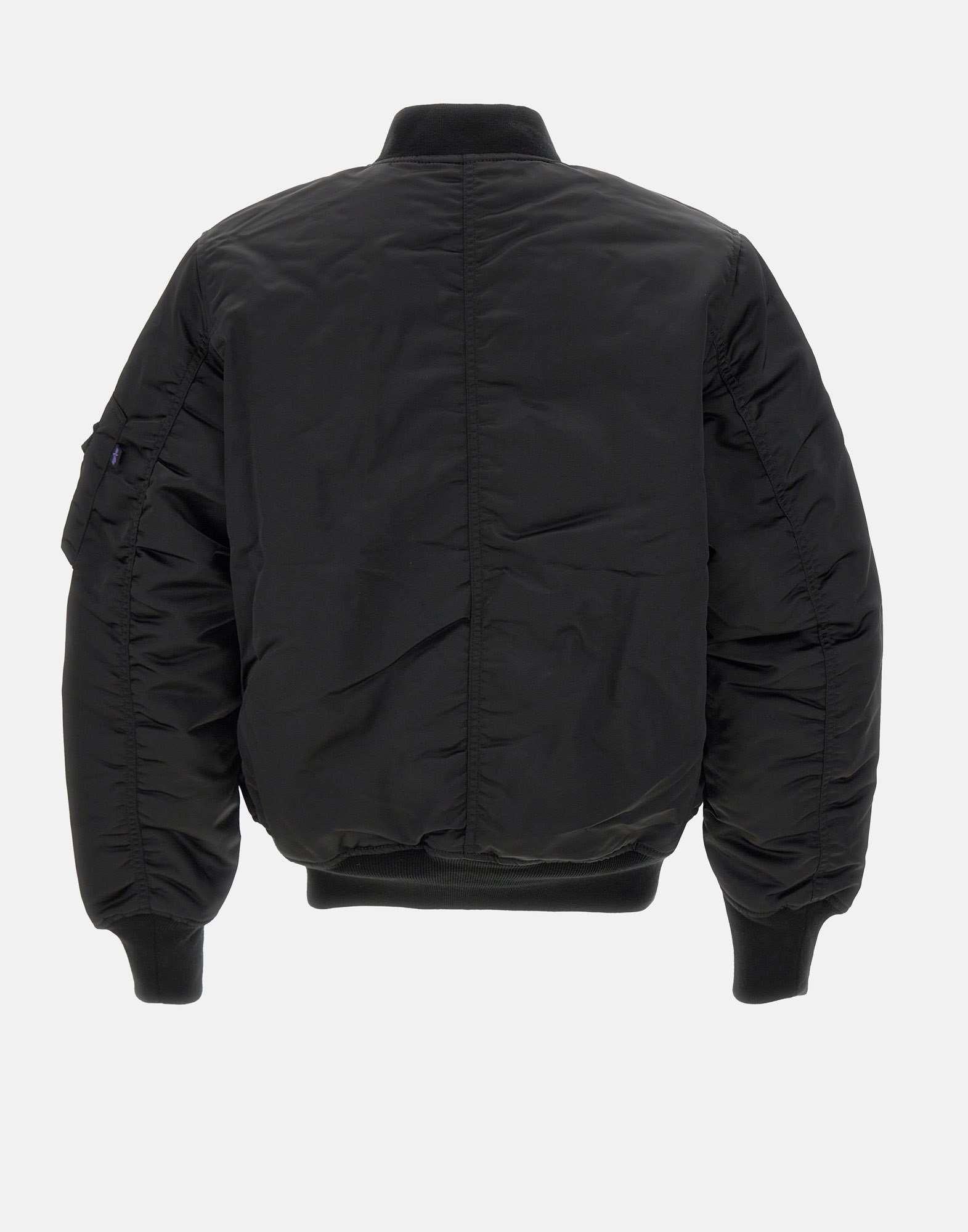 Alpha Industries "MA-1 Base Flight Bomber Jacket" in black nylon, reversible, a must-have for any modern wardrobe. Crafted from 100% durable nylon with Core Fit silhouette and 3M Thinsulate padding for warmth, lightness, and flexibility. Features gold-tone anti-pilling zip closure, ribbed knit trims, multiple pockets, and signature sleeve utility pocket with RBF Tag. Back length: 70.5 cm (size L). Oversized fit for a bold, casual look.
