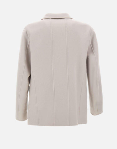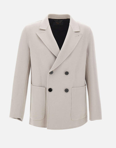 Mens Paltò "AntonelloDB" jacket in ice-colored wool, featuring a coat-style tailored construction. Designed with a double-breasted closure and contrasting buttons, peak lapels, and front welt pockets. The regular fit provides refined comfort, ideal for formal or elegant looks. Made in Italy, symbol of craftsmanship and premium quality.