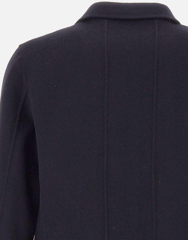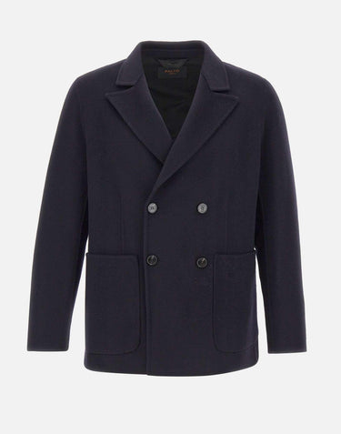Mens Paltò "AntonelloDB" jacket in blue-colored wool, featuring a coat-style tailored construction. Designed with a double-breasted closure and contrasting buttons, peak lapels, and front welt pockets. The regular fit provides refined comfort, ideal for formal or elegant looks. Made in Italy, symbol of craftsmanship and premium quality.