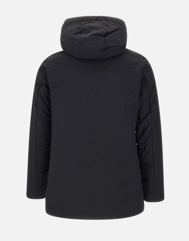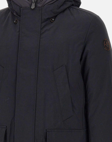 The Save The Duck "Coto21 Forest" parka, in black, from the Arctic collection, is crafted from an innovative, lightweight, and breathable 100% recycled nylon cotton-look fabric. Featuring a padded drawstring hood, buttoned handwarmer pockets, and large front flap pockets, it offers comfort and functionality in any condition. The adjustable drawstring waist and button-adjustable Lycra cuffs ensure a precise fit. The 100% Animal-Free Plumtech padding guarantees warmth and sustainability, while the logo on the left sleeve and the center zip and hidden button closure complete the design.