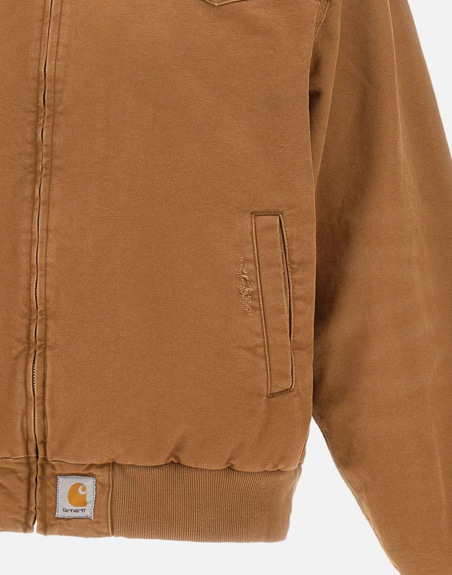 Carhartt men's jacket "OG Santa Fe" crafted from caramel cotton, finished with a contrasting brown ribbed collar for a distinctive workwear-inspired look. Bomber style with elasticated hem and cuffs, zip fastening, and welt side pockets for a clean, functional silhouette. Detailed with a logo patch at the hem and a used-effect finish, it features padded construction with a contrast lining for added comfort. Slightly oversized fit, perfect for everyday casual and streetwear styling.
