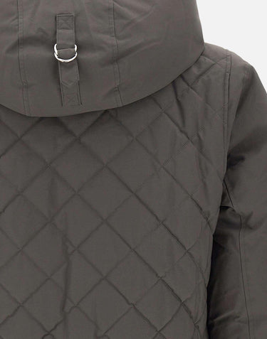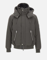 The Mackage "Iker" men's down jacket in gray is crafted from technical fabric with down padding to ensure warmth even in the coldest temperatures (-13°/-25°C). It features a removable faux leather bib, fur lining, knitted trim, and a detachable hood with an adjustable drawstring. The double zip and snap button closure ensures maximum protection, while the front zip pockets, the left sleeve pocket with an iconic logo, and ventilation holes combine style and functionality. The diamond-quilted back and relaxed fit complete this technical and refined piece, perfect for winter.