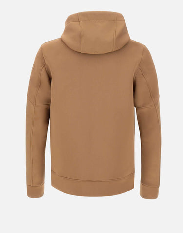 Men's Blauer "Surface" jacket in camel scuba fabric with contrasting inserts, combining sporty style and modern design. Features a front zip closure, adjustable drawstring hood, and four side pockets with zip and button closures. Finished with the signature Blauer chest loop and embossed shield on the left sleeve. The regular fit provides comfort and versatility for everyday wear.