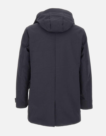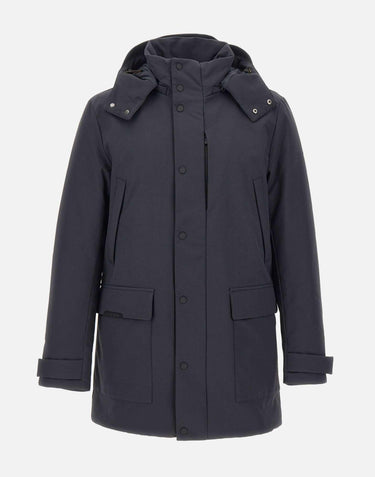 The Save The Duck "Wuly21 Edwin" parka in blue merges modern aesthetics with sustainable performance. Filled with Plumtech® insulation, it ensures warmth and lightness without animal down. The design includes a stand collar with detachable hood, zip, flap, and snap-button fastening, and adjustable cuffs. Extra functionality comes from the water-resistant zip hand-warmer pockets and flap pockets. The look is finished with the logo patch on the sleeve. A regular fit makes it the perfect winter piece, balancing style and practicality.