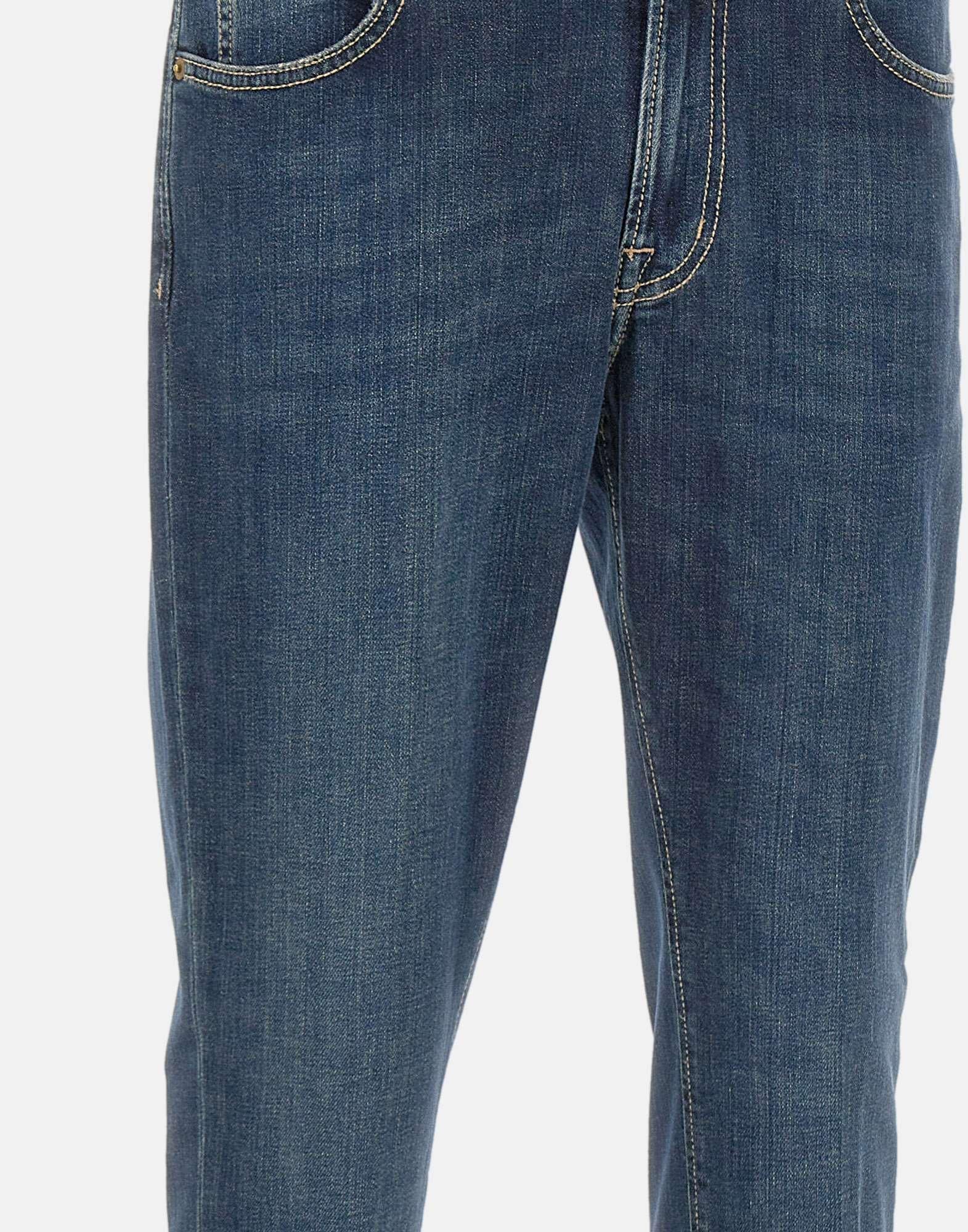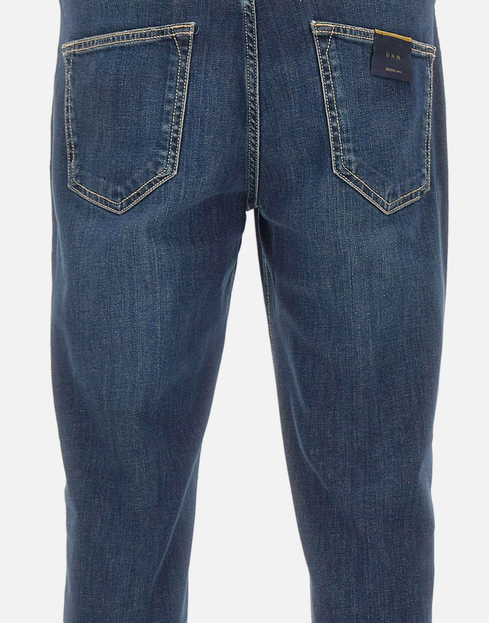 Briglia 1949 "Ribot-L" men's jeans in dark blue denim with a used wash and subtle fading, part of the DNM Collection. This five-pocket style features belt loops, a branded button with zip fastening, a leather logo patch at the back, and a 17 cm hem that enhances the slim fit. A versatile and contemporary denim piece designed for everyday style. Made in Italy.