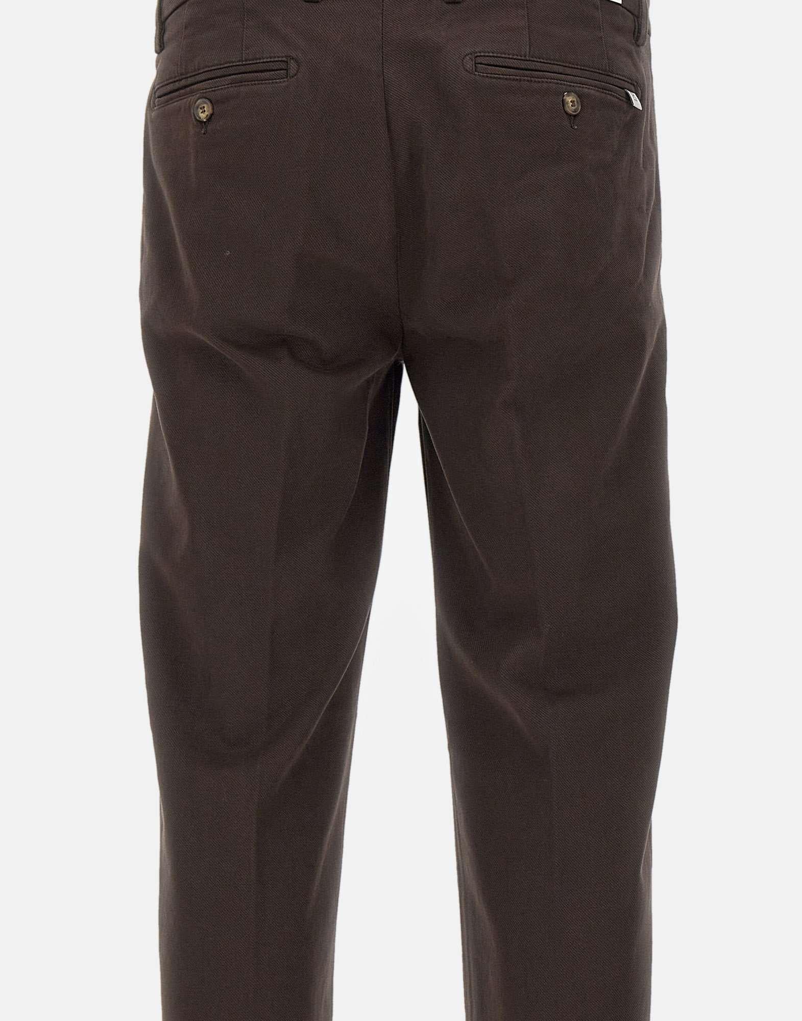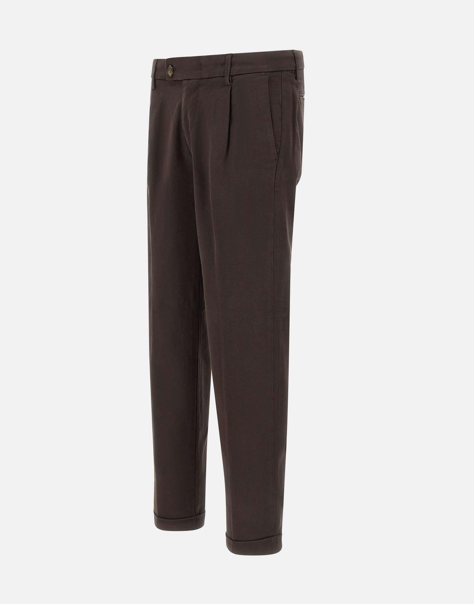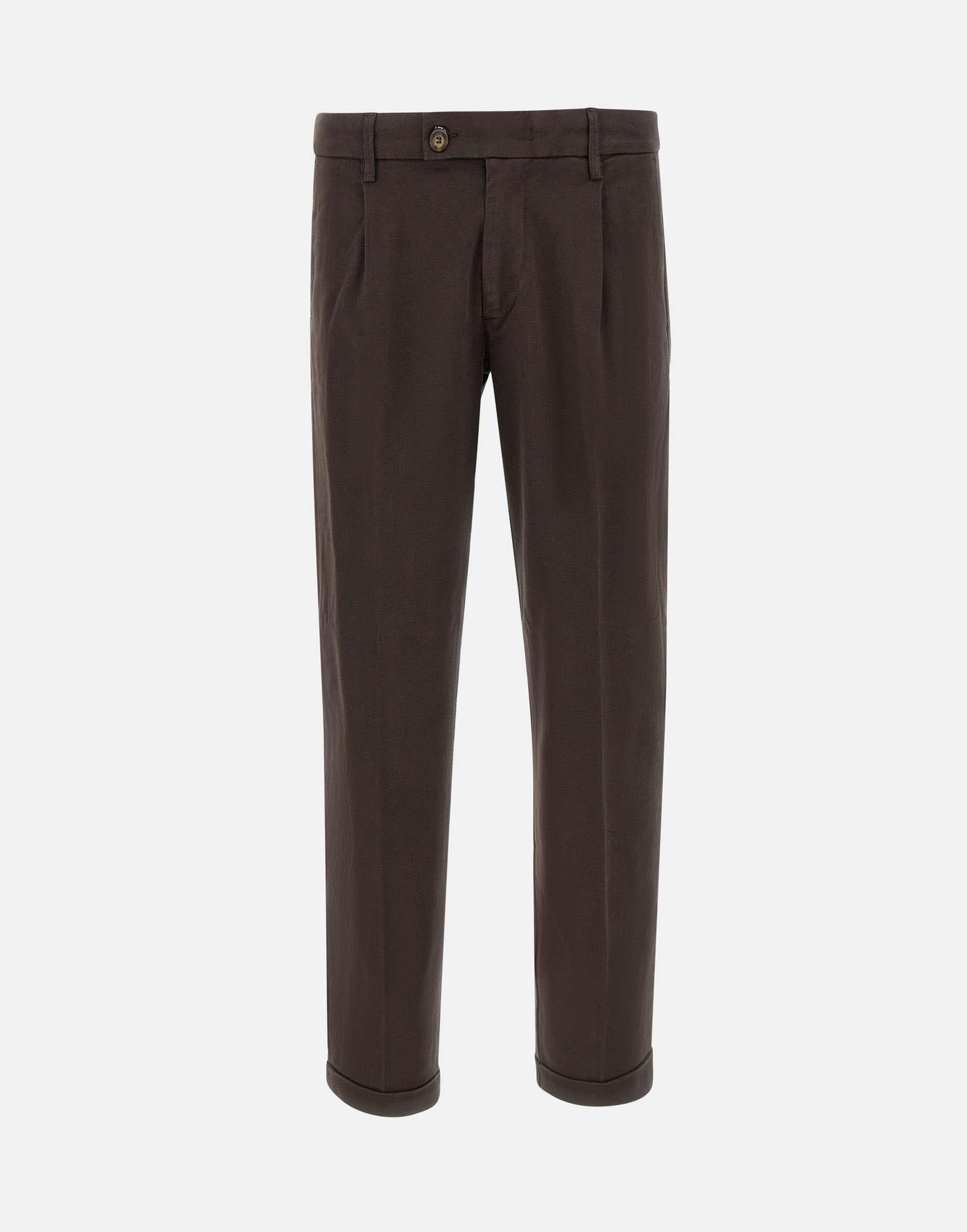 Re-Hash "Mucha-P1C" men's pants in dark brown cotton and lyocell blend, an iconic piece that redefines men's elegance. Featuring front pleats, slim fit, Italian front pockets, and back pockets with button and logo label. Concealed zip and button closure. Finished with a 3 cm turn up hem, these pants offer the perfect balance of comfort and tailored sophistication. Made in Italy. Bottom width: 17cm.