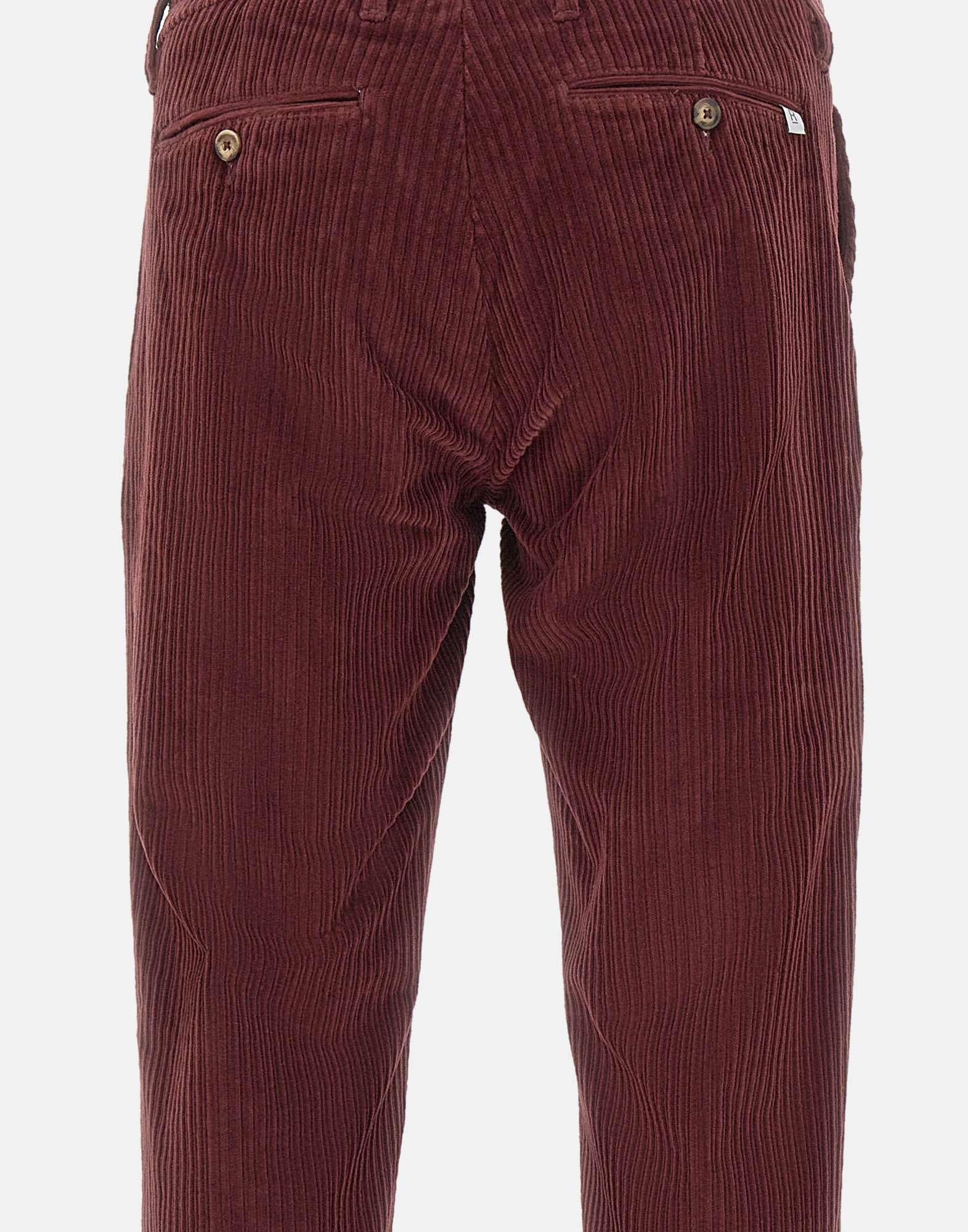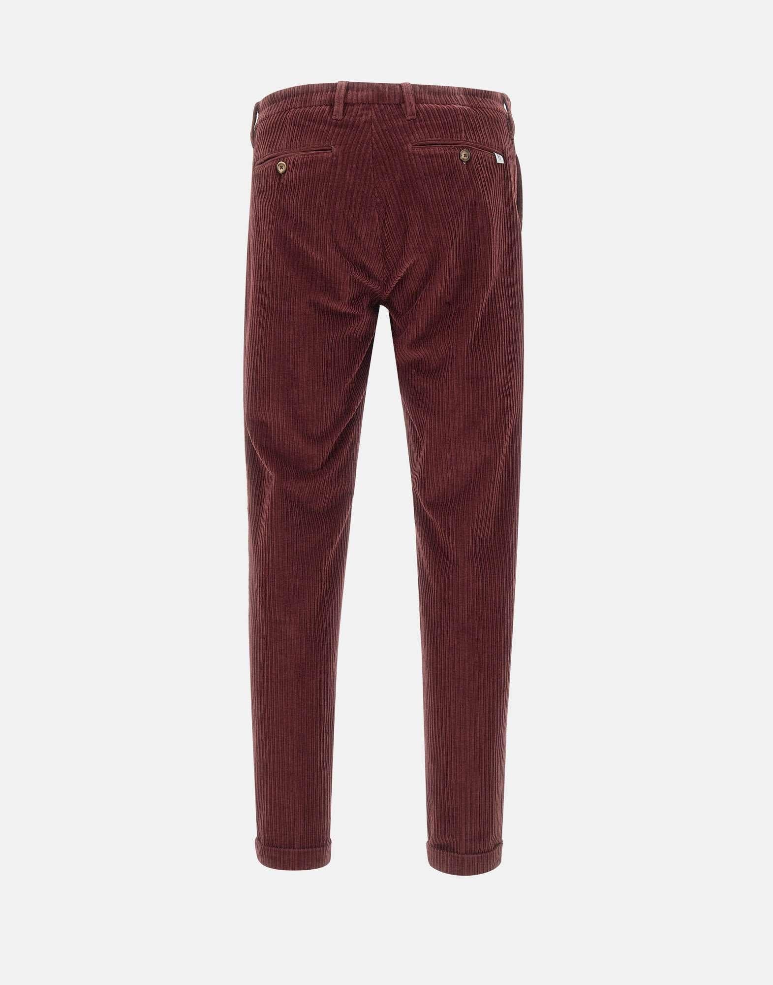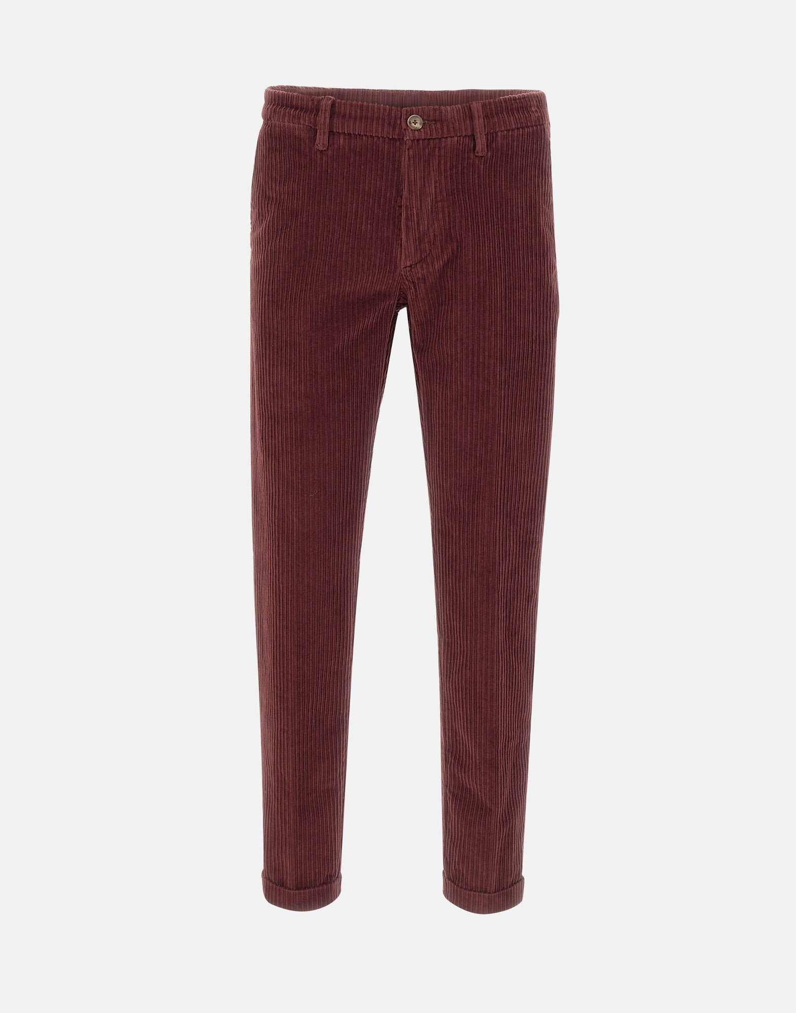 Re-Hash "Mucha" men's pants in soft burgundy corduroy cotton, featuring a straight cut and elegant texture. Designed with front Italian pockets, back pockets with button and logo label, and a zip and button closure. Finished with a 3 cm turn up hem for a tailored touch. A refined and versatile piece for casual elegance. Made in Italy. Bottom width: 17 cm.