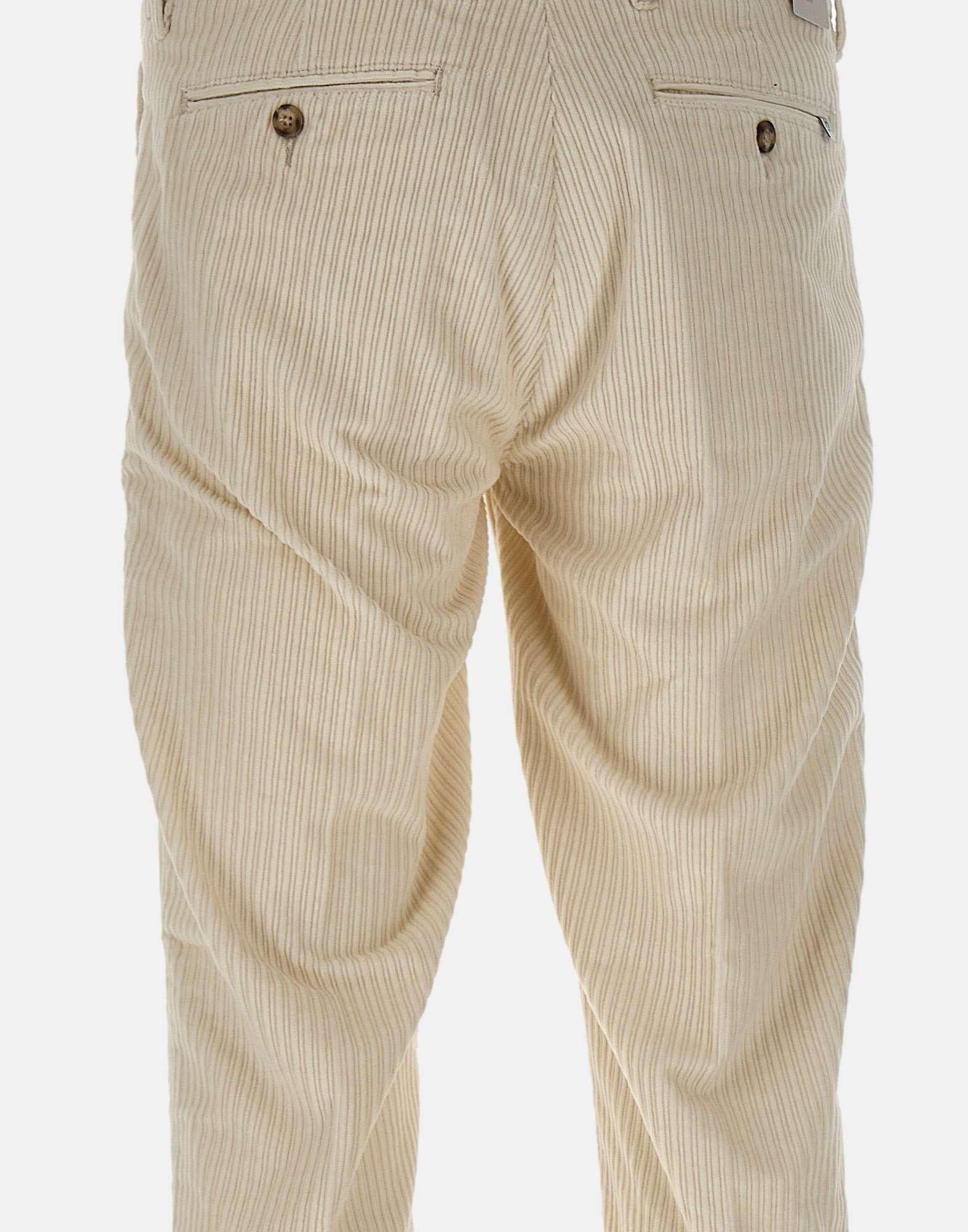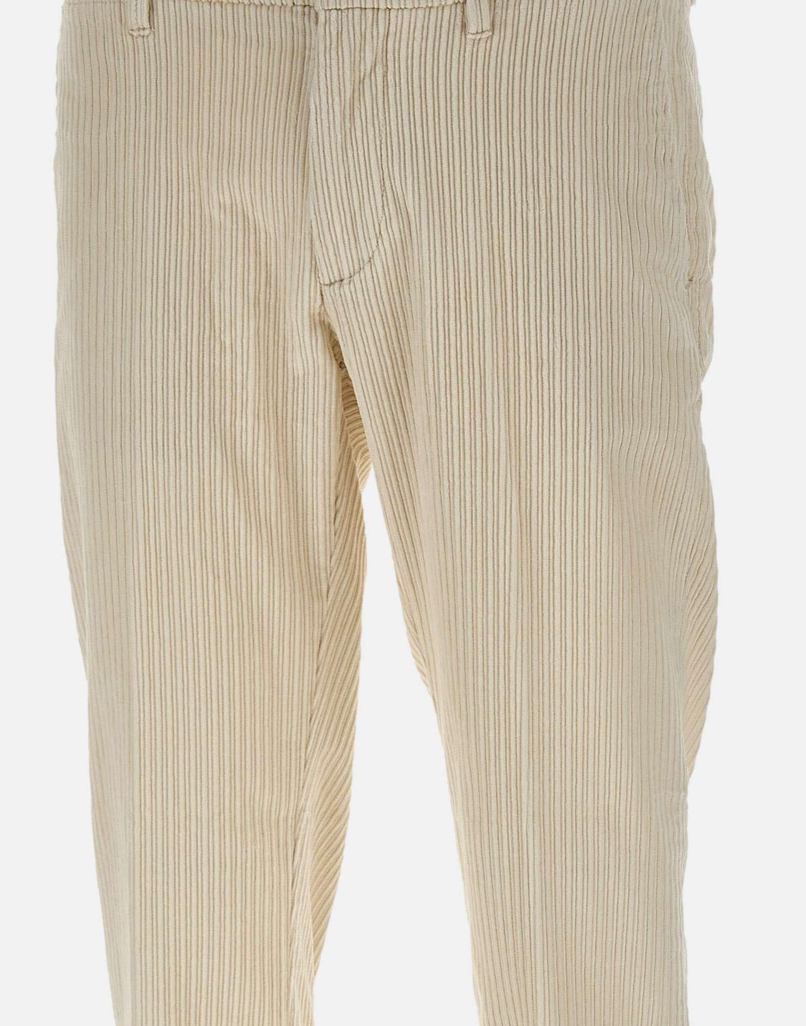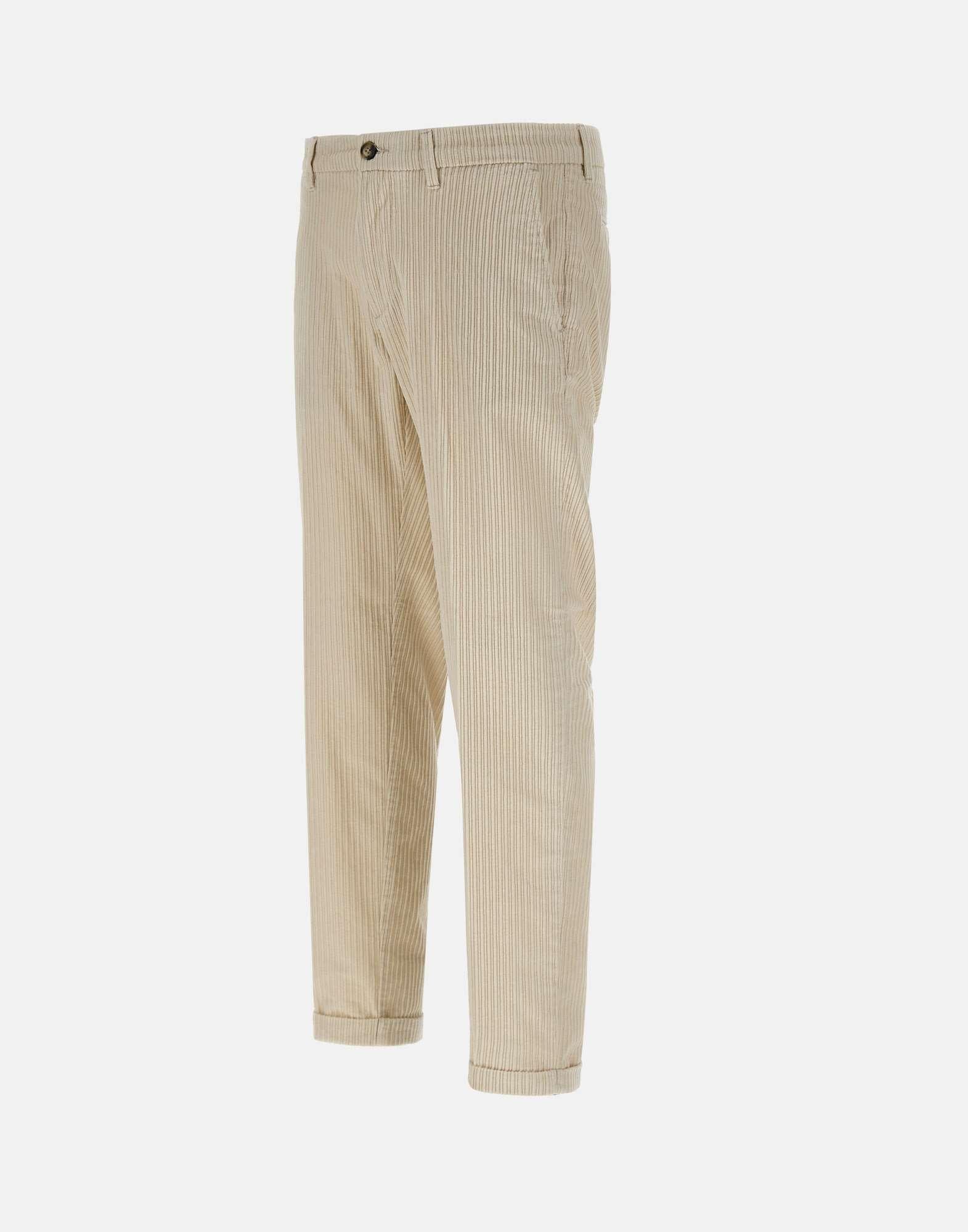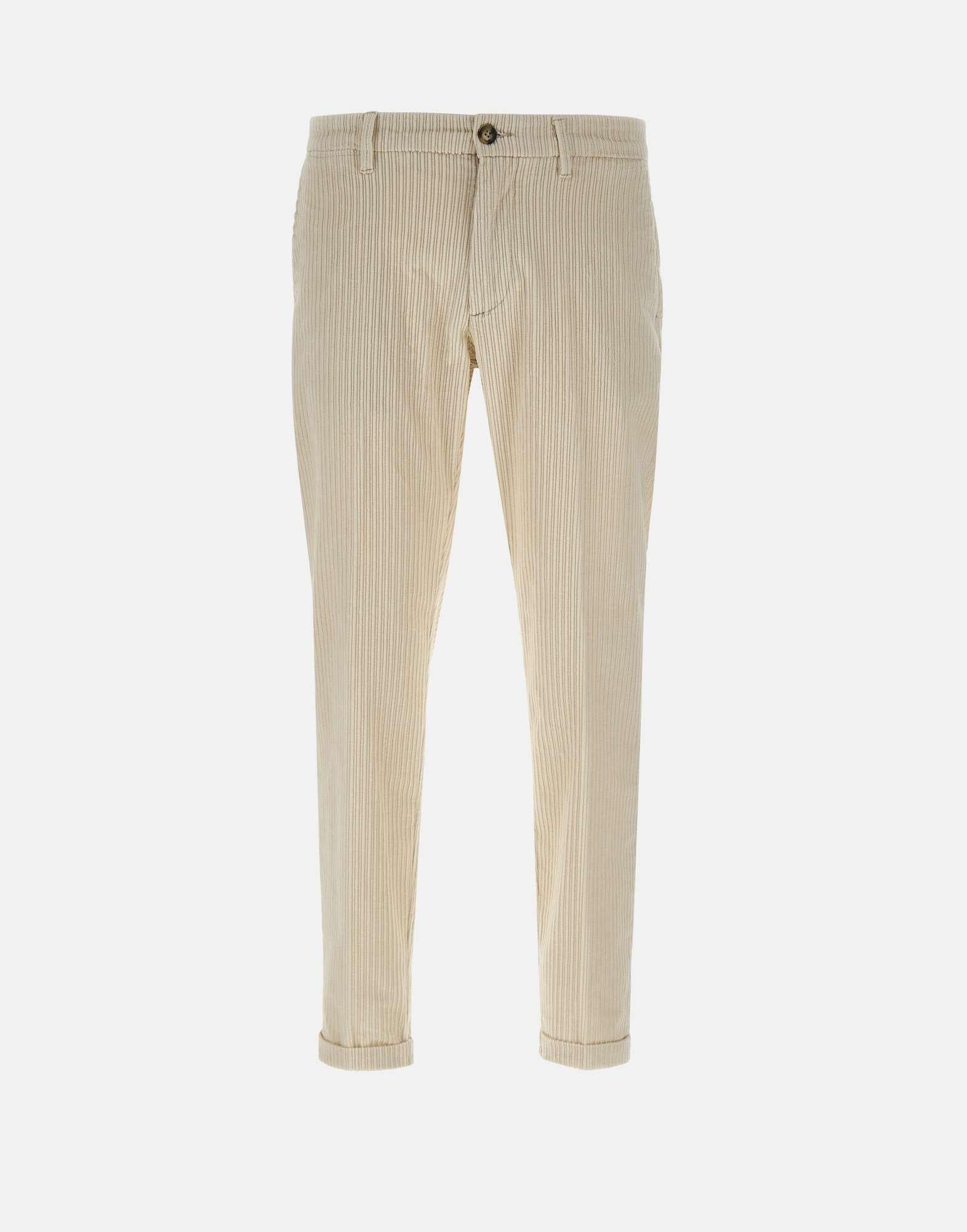 Re-Hash "Mucha" men's pants in soft white corduroy cotton, featuring a straight cut and elegant texture. Designed with front Italian pockets, back pockets with button and logo label, and a zip and button closure. Finished with a 3 cm turn up hem for a tailored touch. A refined and versatile piece for casual elegance. Made in Italy. Bottom width: 17 cm.