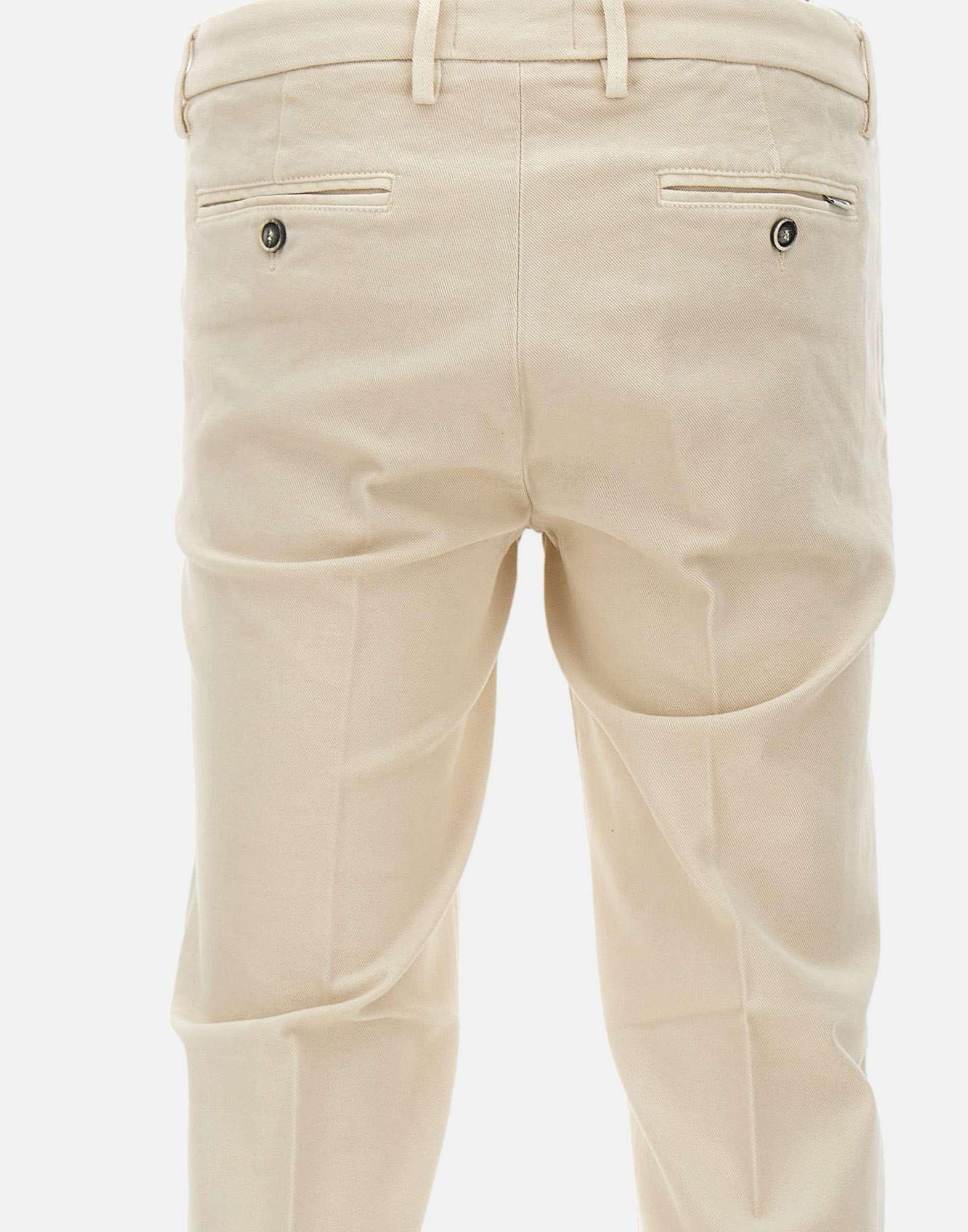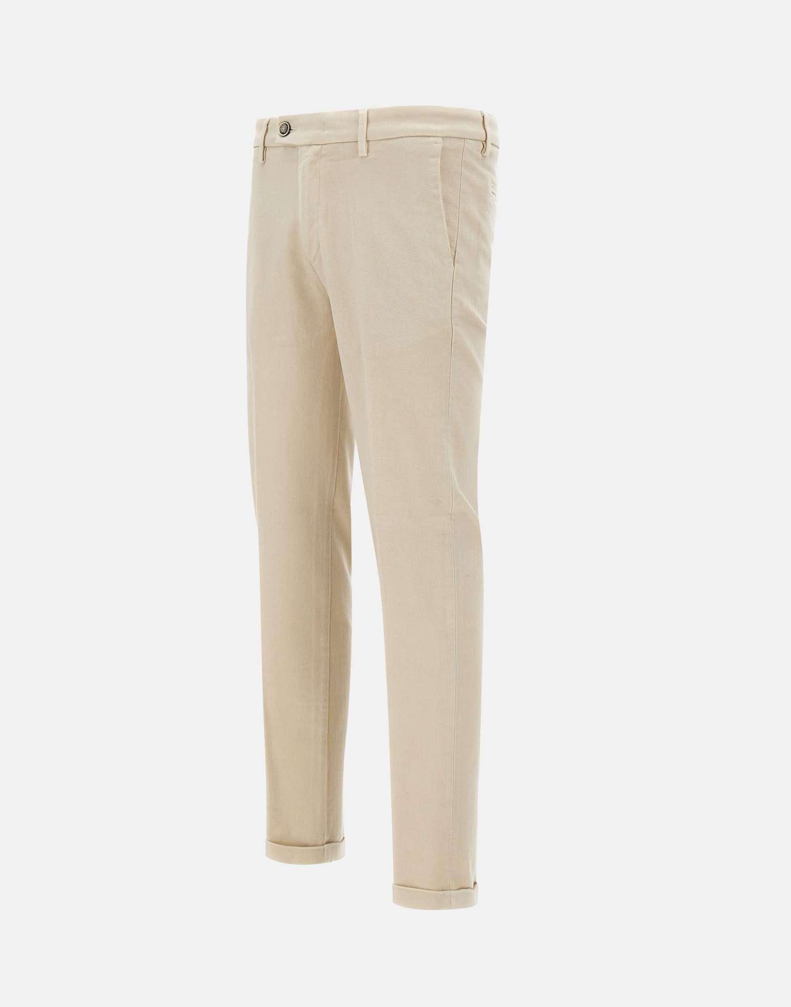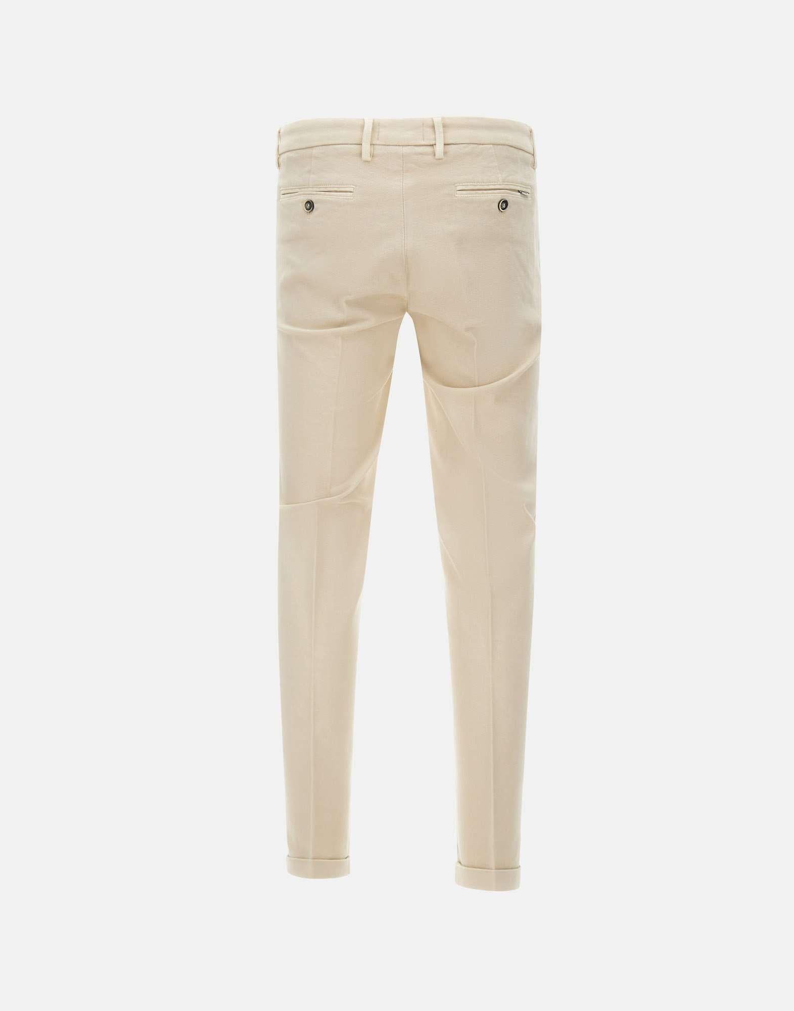 Re-Hash "Mucha10" men's chino trousers in an elegant ivory tone, featuring a slim fit and refined tailoring. Designed with sustainability in mind, they combine premium fabric and meticulous details. Mid rise waist, front Italian pockets, back pockets with button and logo label, and concealed zip and button closure. Finished with a 2,5 cm turn-up hem. A versatile and stylish choice for both formal and casual outfits. Made in Italy. Bottom width: 16cm.