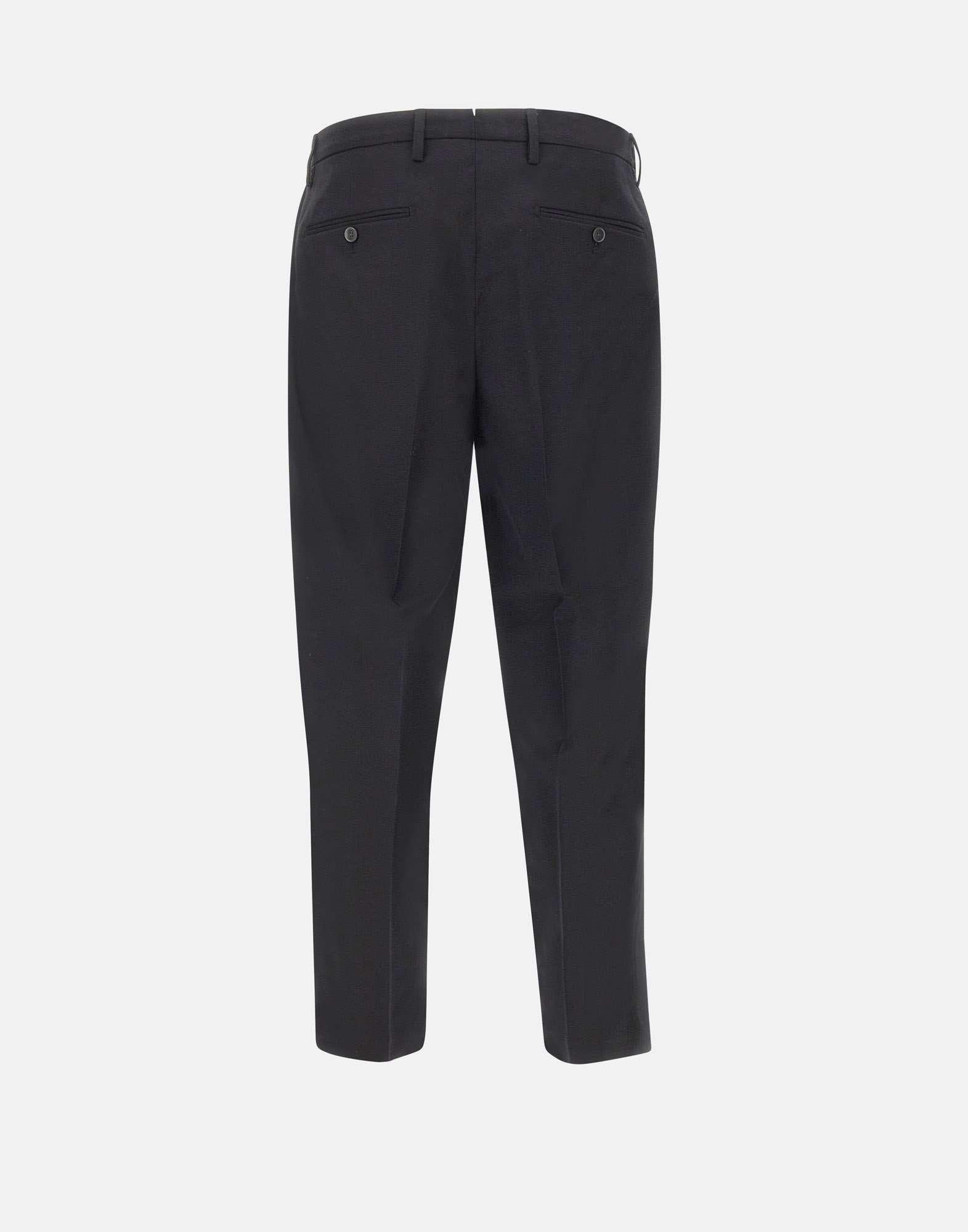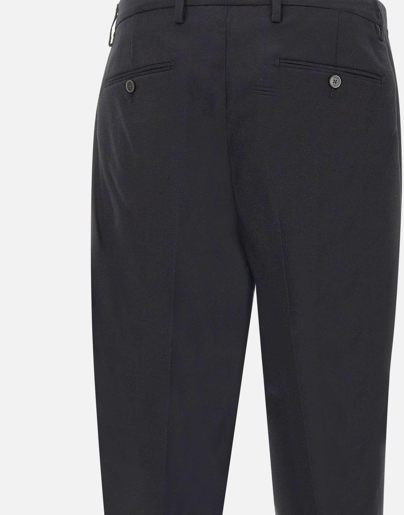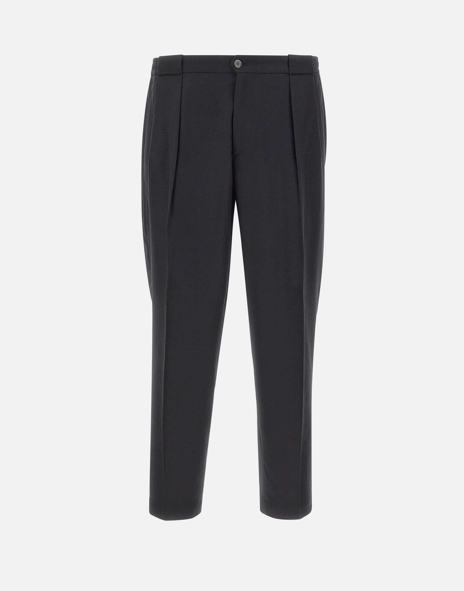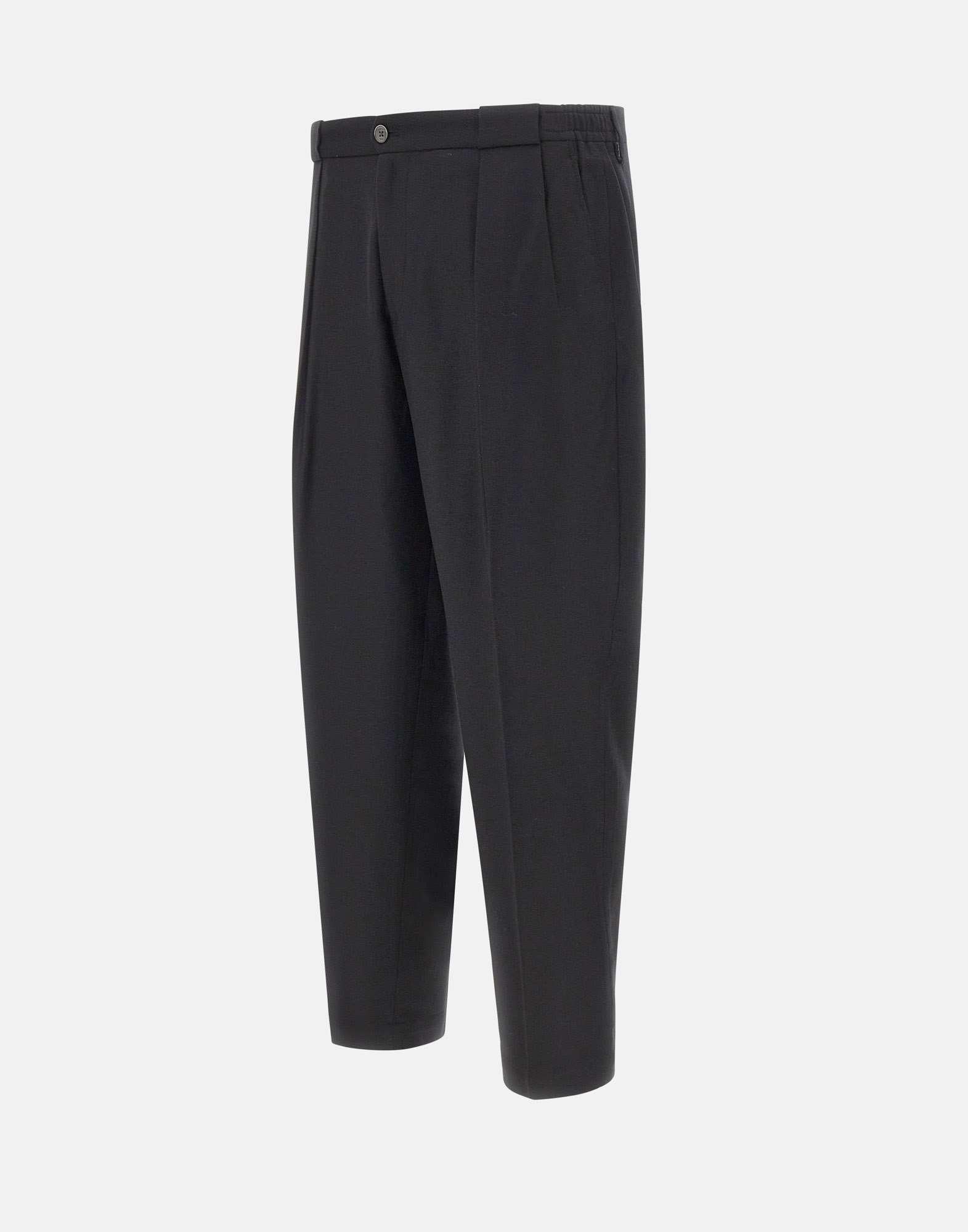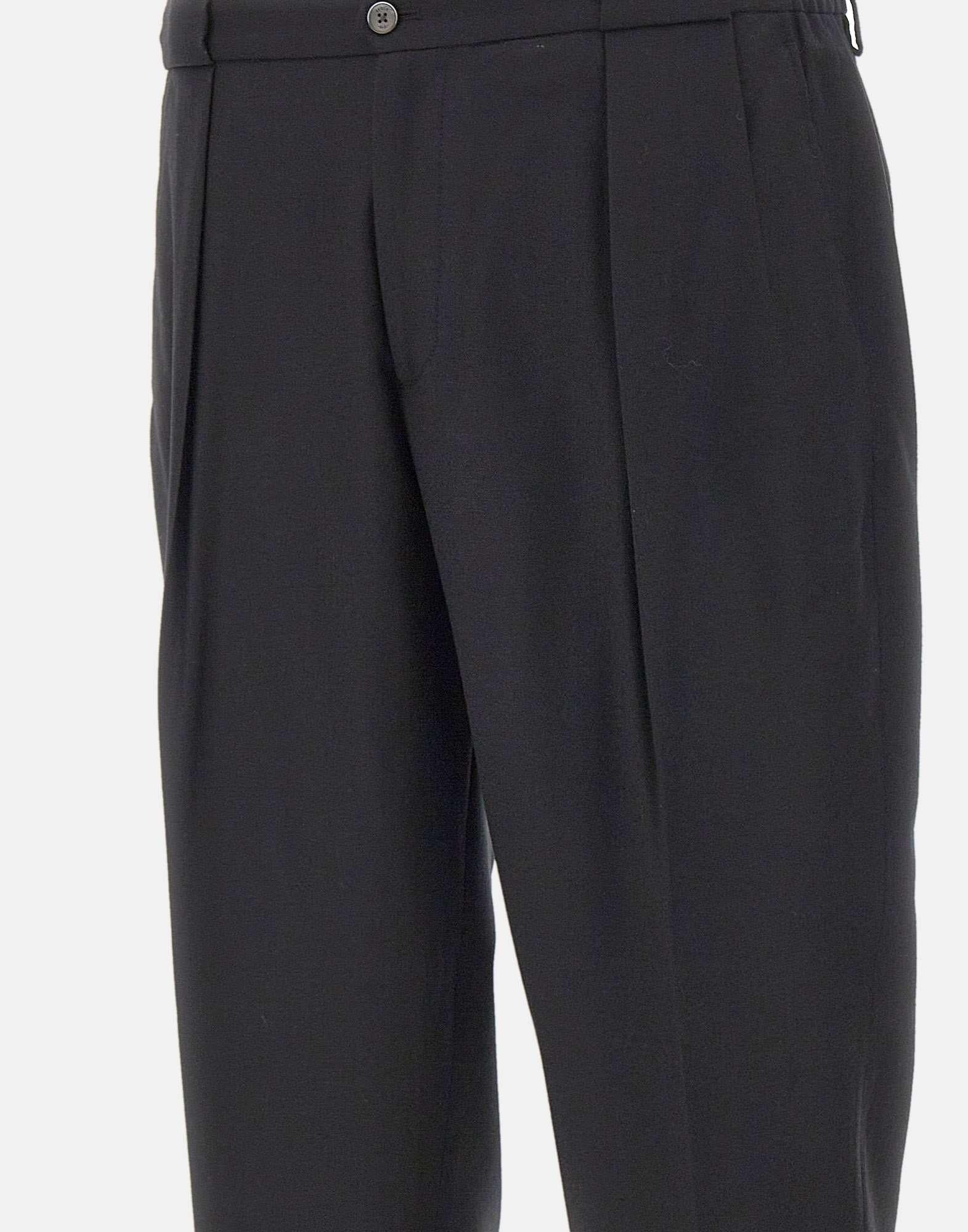 Briglia 1949 "Portobellos" men's trousers in black wool, part of the Racconta la Sartoria line. They feature a regular, partially elasticated waistband with belt loops, a zip fastening with a tone-on-tone branded button, side welt pockets, and a double front pleat that enhances the tailored construction. Branded buttoned back pockets complete the design. The regular easy fit ensures comfort and refined elegance. Hem width: 18 cm. Hand wash. Made in Italy.