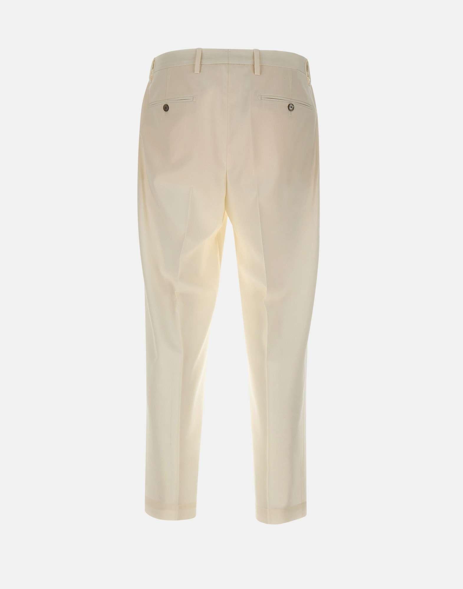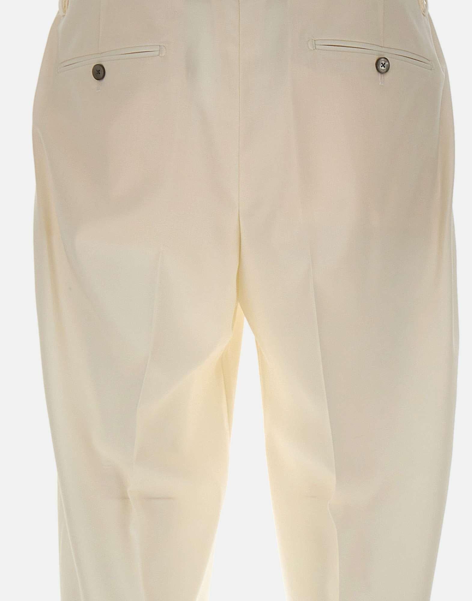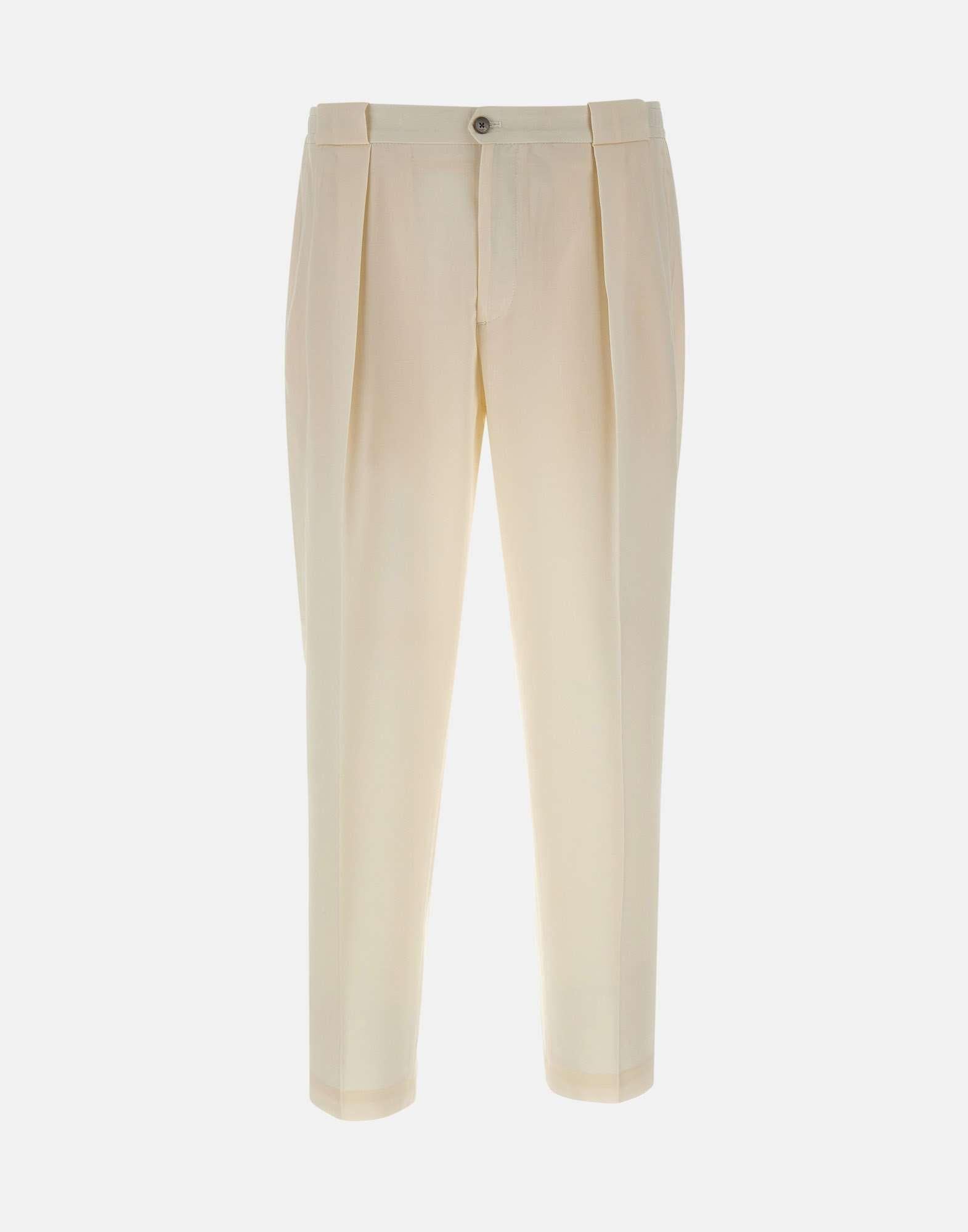 Briglia 1949 "Portobellos" men's trousers in white wool-blend bi-stretch fabric, crafted with Marzotto EarthEarth materials and part of the Racconta la Sartoria line. They feature a regular, partially elasticated waistband with belt loops, a zip fastening with a tone-on-tone branded button, side welt pockets, and a double front pleat that enhances the tailored structure. Back pockets with branded buttons complete the design. The regular easy fit offers comfort and refined style. Hem width: 18 cm. Hand wash. Made in Italy.