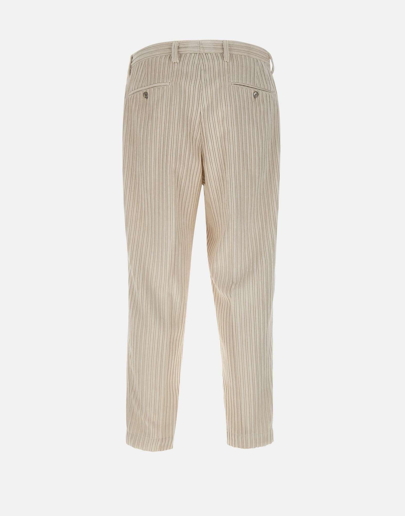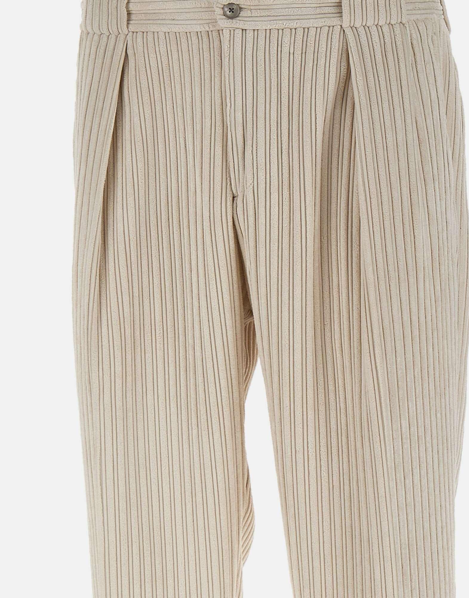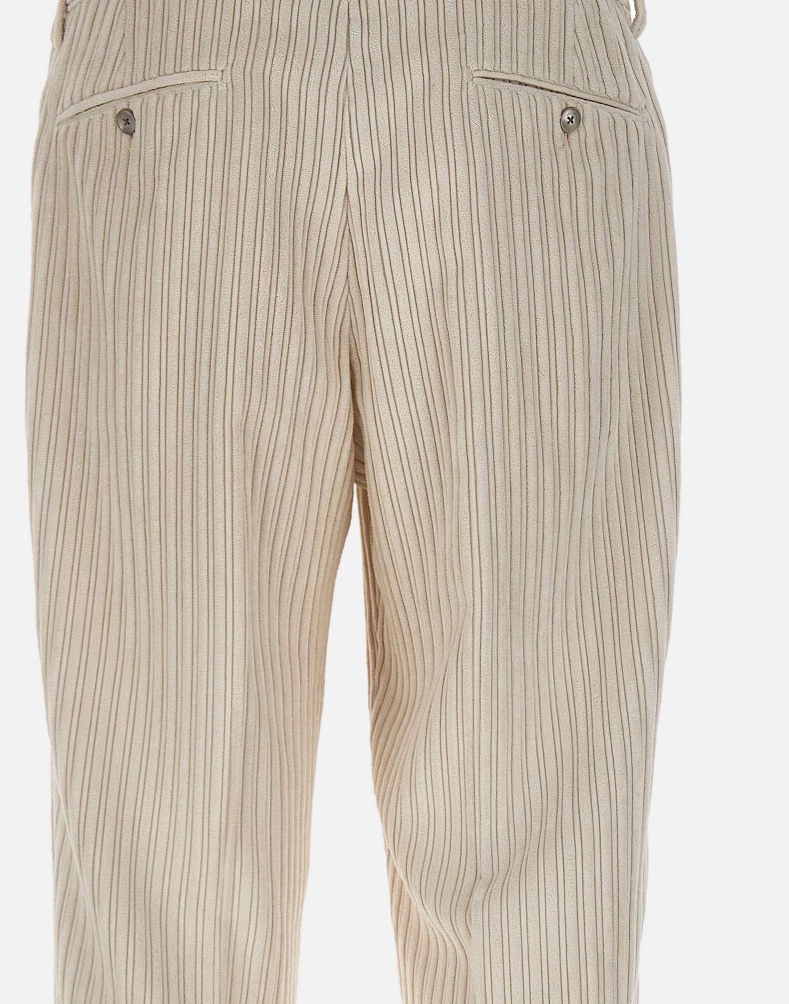 Men's Briglia 1949 "Portobellos" trousers in cream-colored velvet, a style that combines retro style and contemporary tailoring from the Racconta la Sartoria line. Crafted with a soft, velvety texture, they feature a classic fit enhanced by thoughtful details. They include two side slit pockets, two back welt pockets, a zip and button closure, and belt loops for a versatile and structured fit. The wide 20 cm hem balances the silhouette, making them ideal for sophisticated looks from work to leisure. Made in Italy.