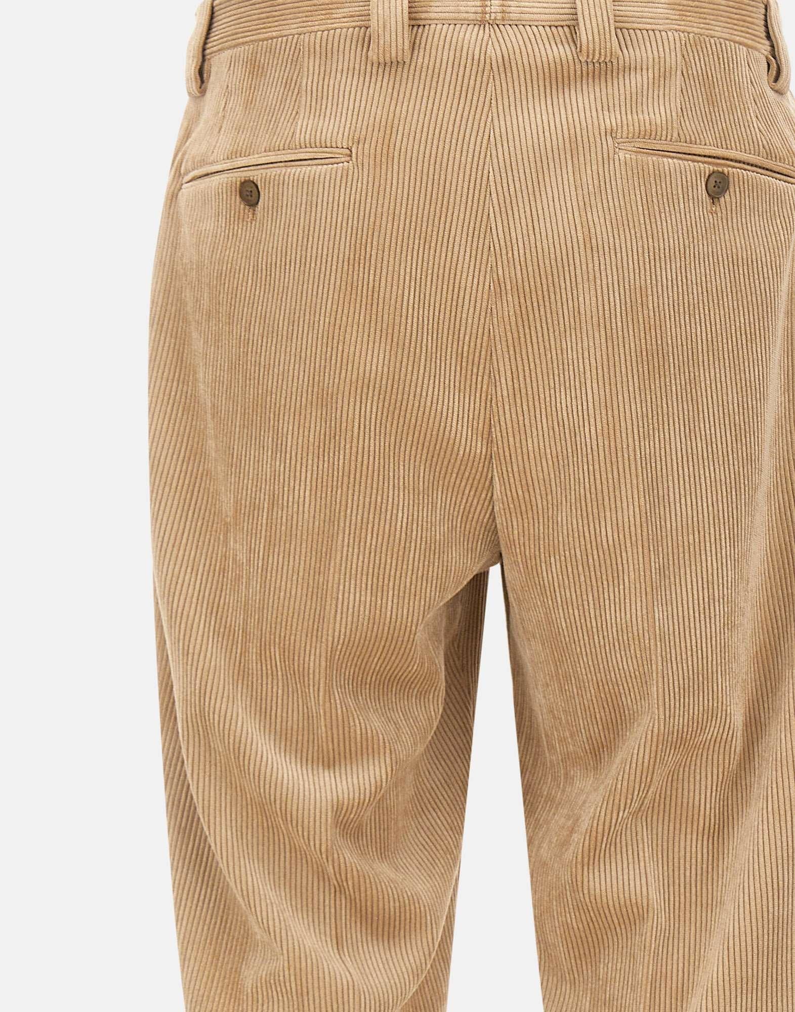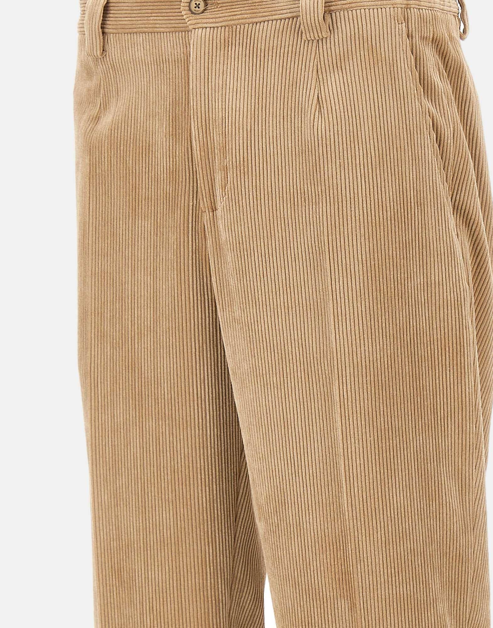 Briglia 1949 "Portofinos" men's trousers in beige velvet, blending retro inspiration with contemporary tailoring from the Racconta la Sartoria line. Crafted with a soft, velvety texture, they feature a classic cut enhanced by refined details. Designed with two slanted side pockets, two back welt pockets, a zip and button closure, and belt loops for a structured, versatile fit. The wide 20 cm hem adds balance to the silhouette, making them ideal for sophisticated outfits from office to leisure. Made in Italy.