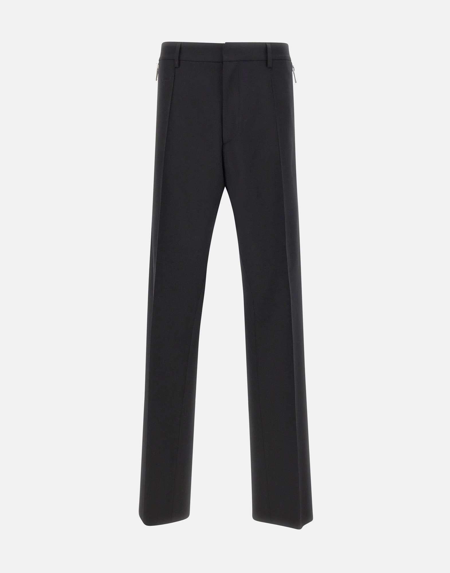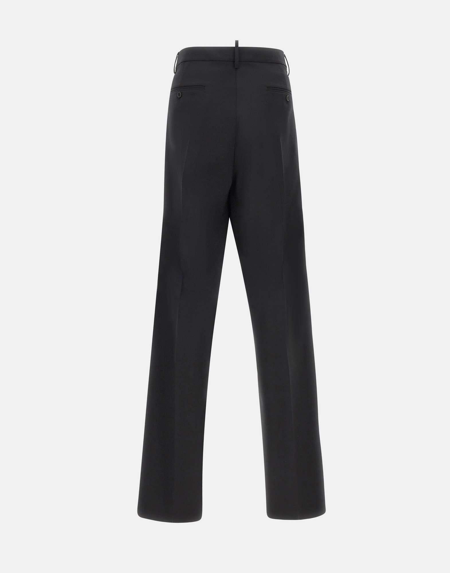 DSquared2 men's trousers crafted from black stretch wool with a tailored cut and bold signature details. Featuring maxi side zippers with branded pullers, pressed creases, and a straight leg with a regular fit. Finished with belt loops, back welt pockets with button closure, and a metal logo at the back. Zip and hook fastening. Made in Italy.