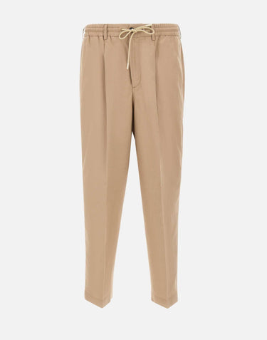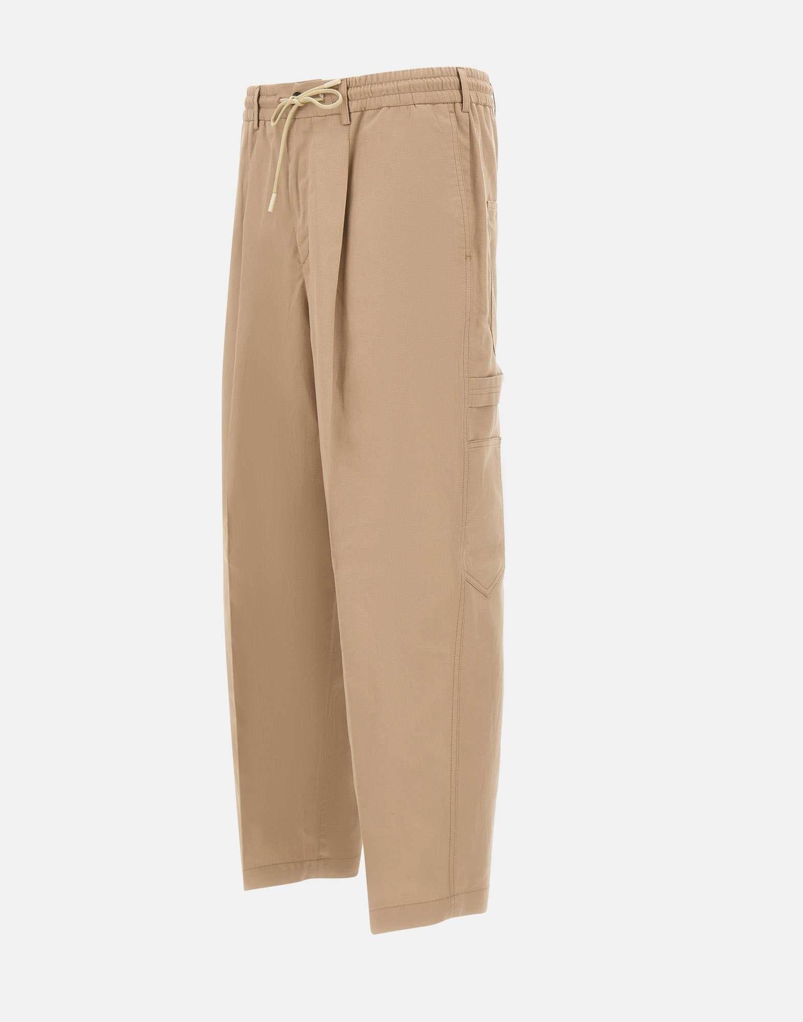 Men's PT Torino trousers crafted from a beige cotton and linen blend, designed to combine comfort with a modern casual aesthetic. Feature an elasticated waistband with drawstring, concealed zip and button fastening, and belt loops for versatile wear. Finished with Italian front pockets, side cargo pockets, and back patch pockets for a functional look. The wide leg silhouette offers a relaxed yet refined fit. Regular fit. Bottom width: 23 cm.