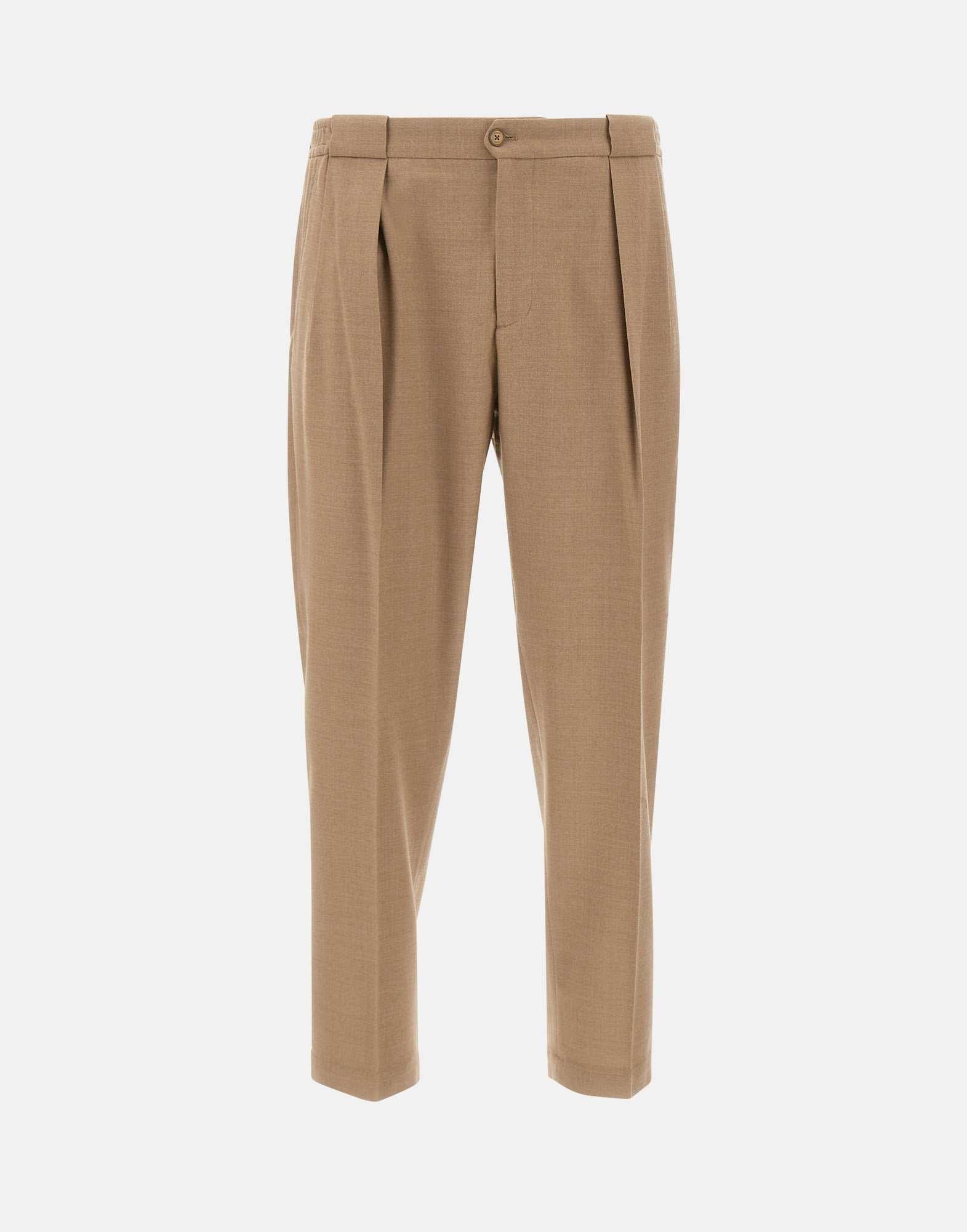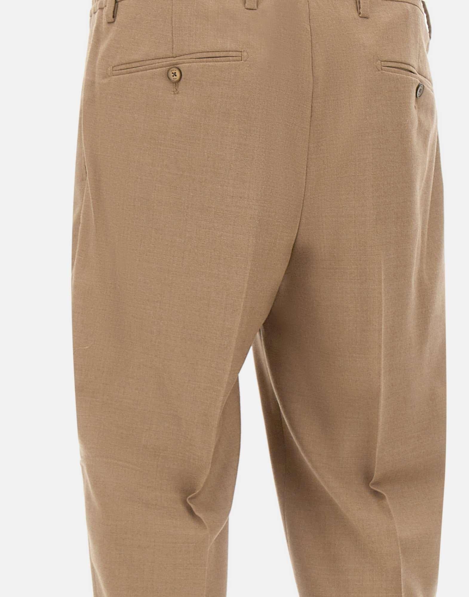 Briglia 1949 "PortobelloS" men's trousers, beige, wool fabric, Racconta la Sartoria line, partially elasticated regular waist with belt loops, zip and matching logo button fastening, side welt pockets, double front pleats, back pockets with logo buttons, regular easy fit. Hem: 18 cm. Hand wash. Made in Italy.
