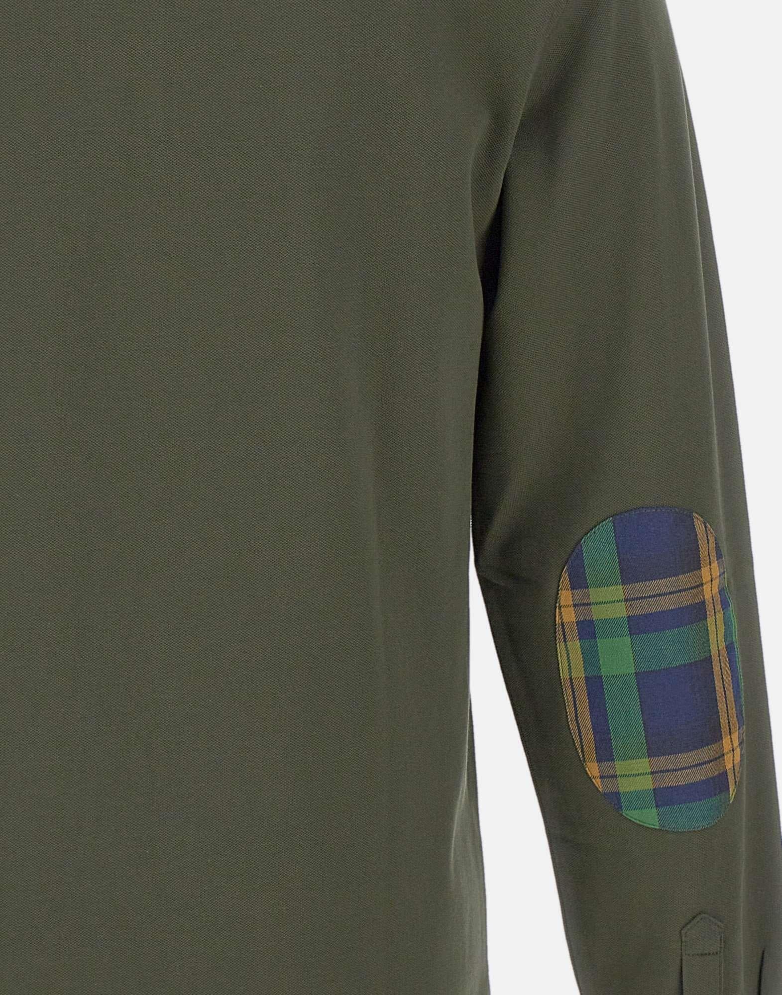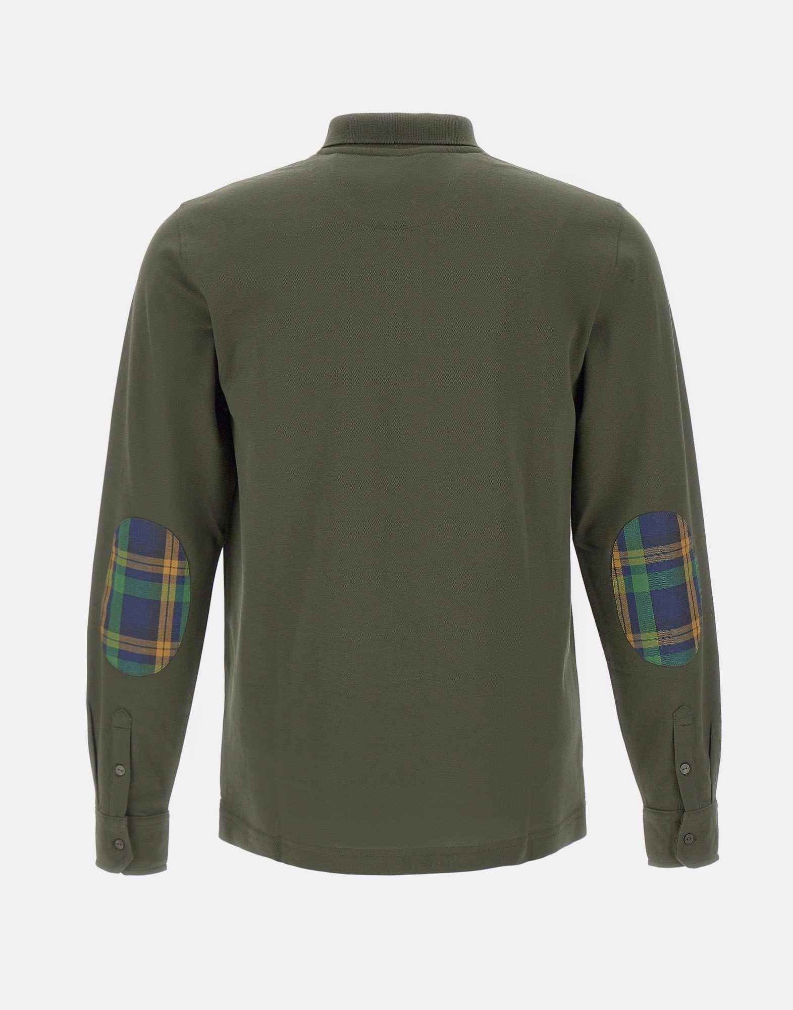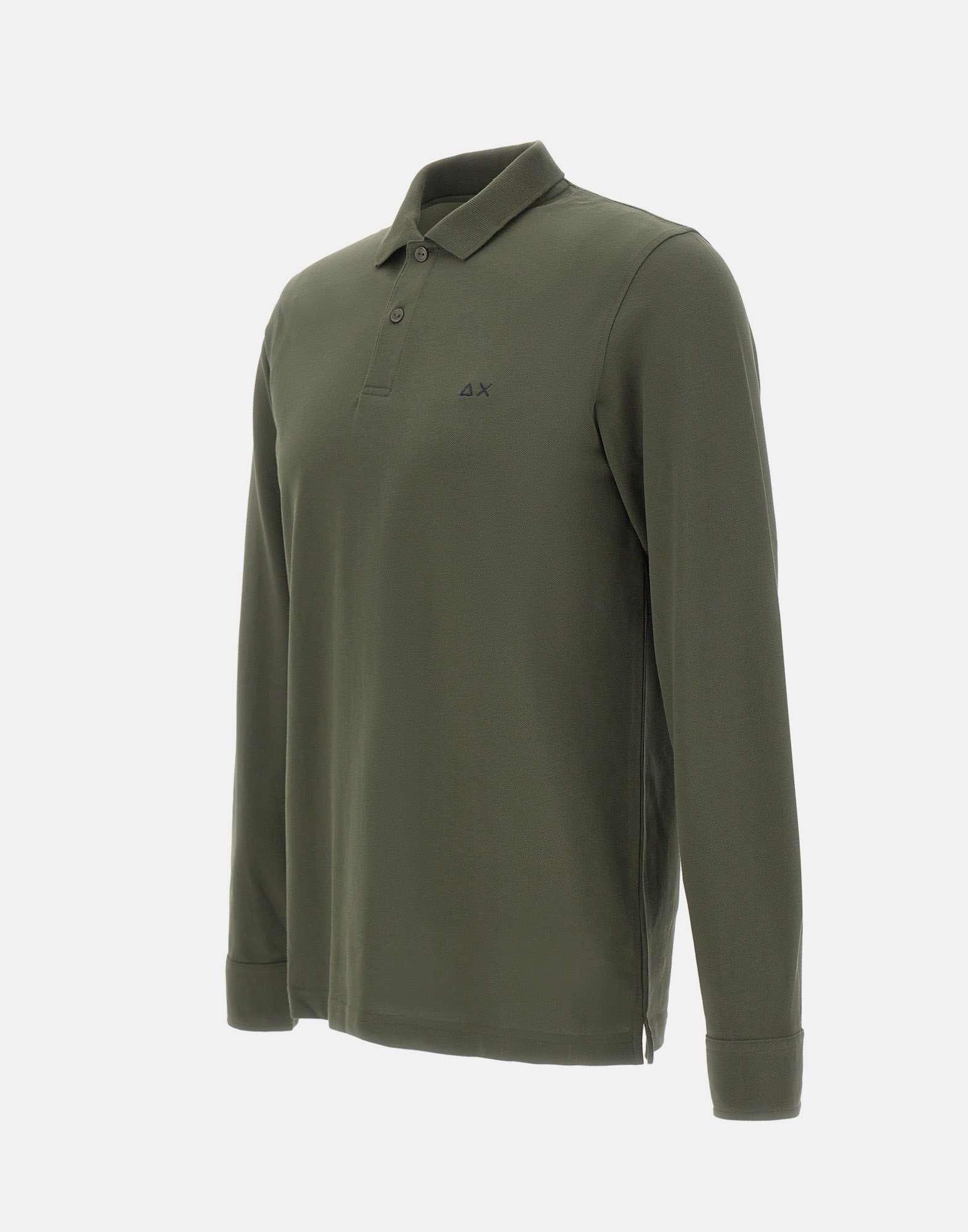 Sun68 men's polo shirt in stretch cotton piqué, dark military green, with a casual design and attention to detail. It features a ribbed collar with a checkered lining, long sleeves with buttoned cuffs, and a front button closure. The reinforced elbows with contrasting embroidered check patches add a distinctive touch. The embroidered logo on chest completes piece. Perfect for a sporty yet refined style.