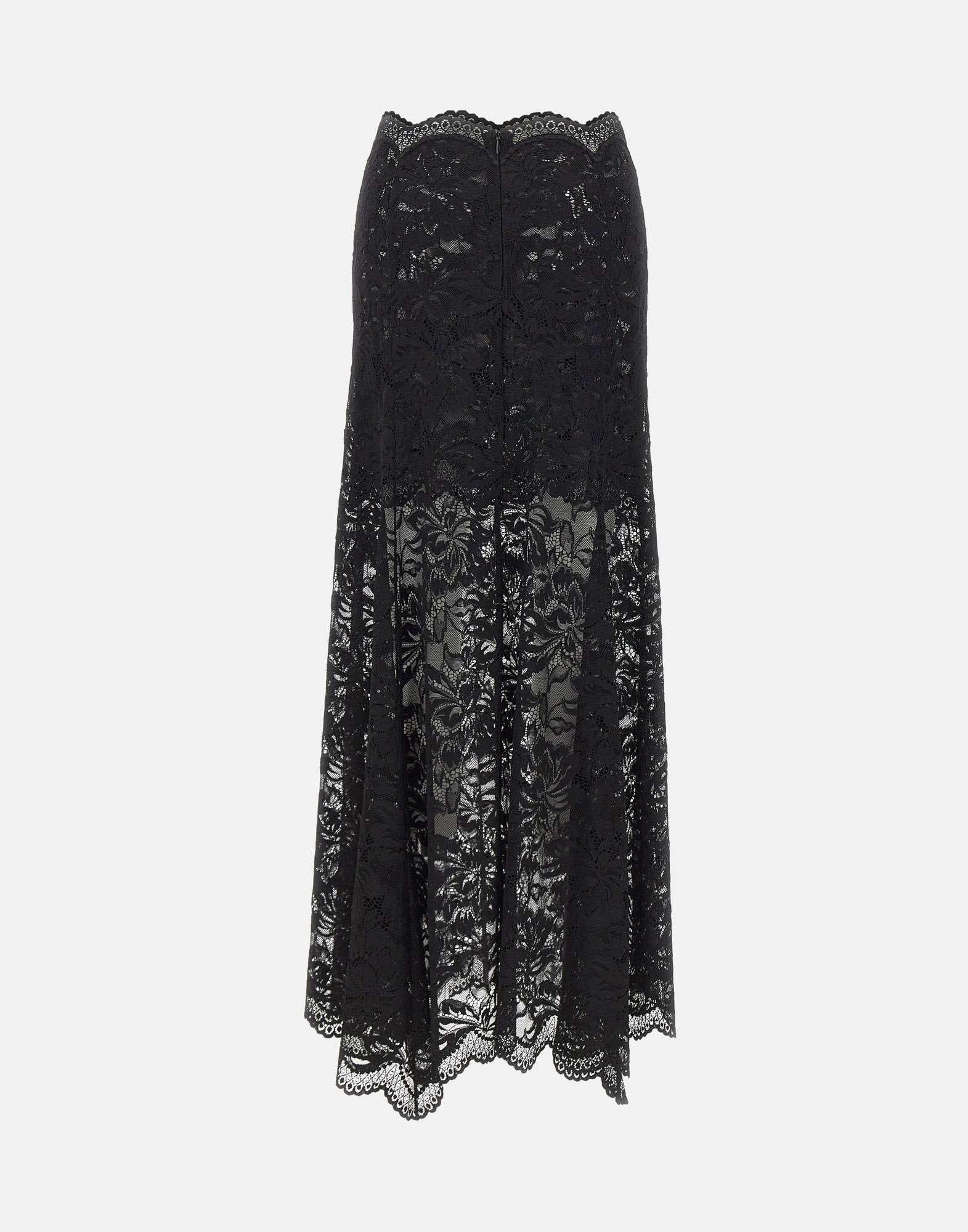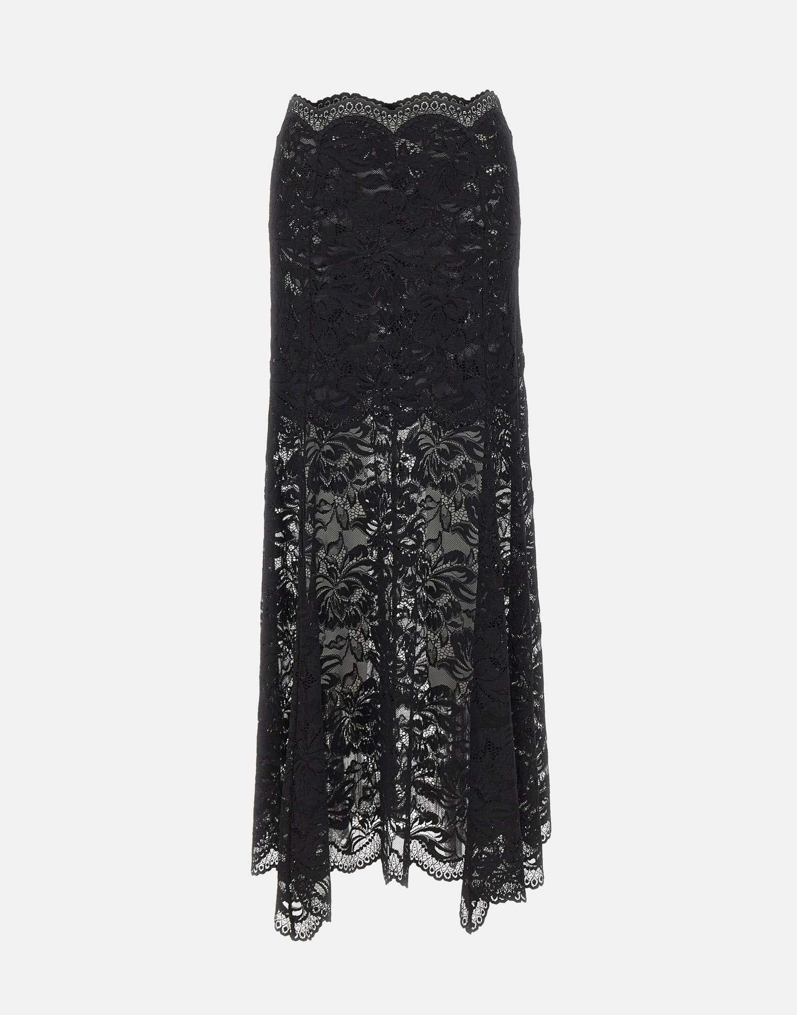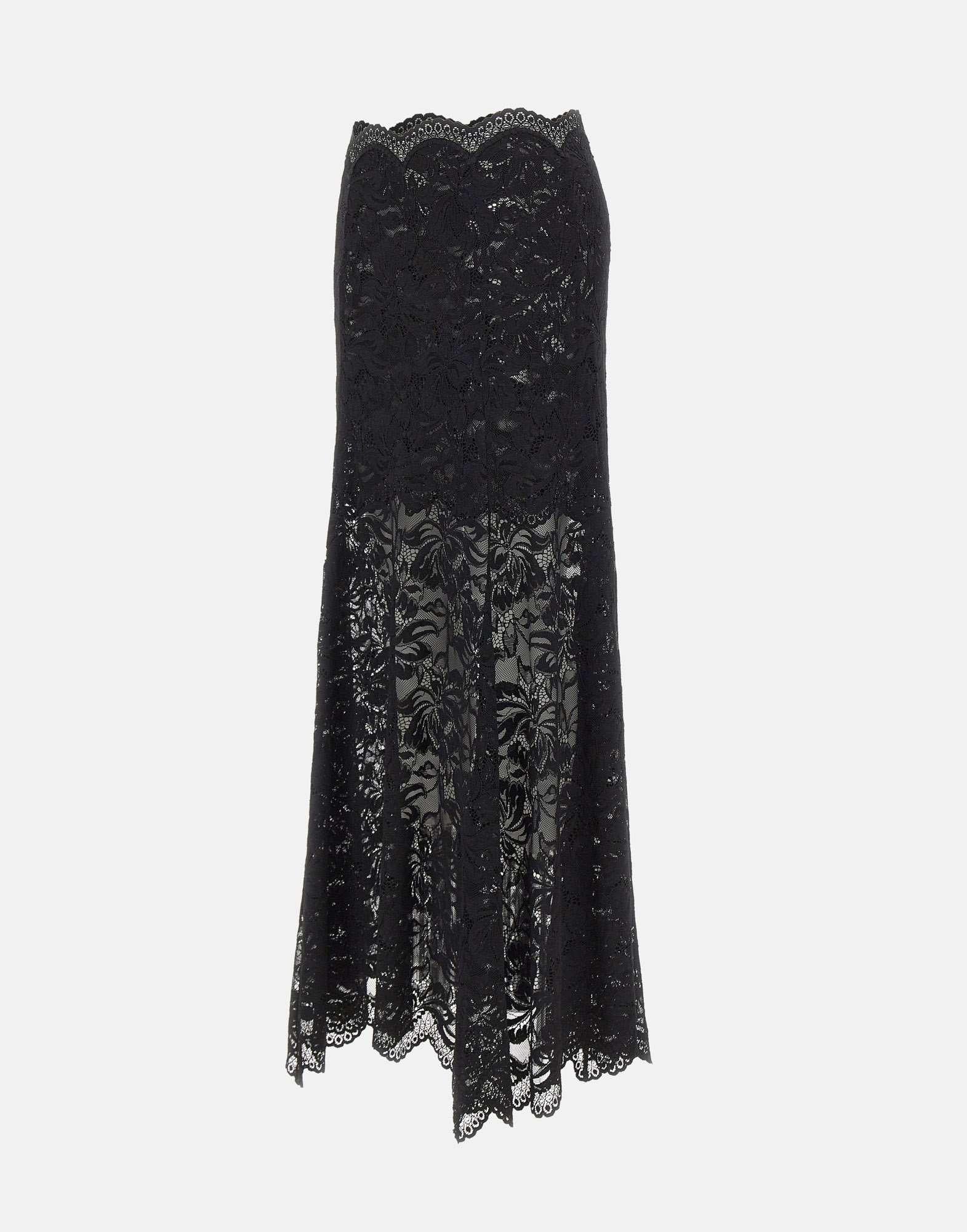 Rabanne long skirt crafted entirely from black lace, designed for a luminous, feminine elegance. The flared cut adds graceful movement, while the waist and hems are finished with delicate lace trim for a refined touch. A concealed back zip closure keeps the silhouette clean and polished. Regular fit, perfect as a maxi skirt for special occasions and evening looks.
