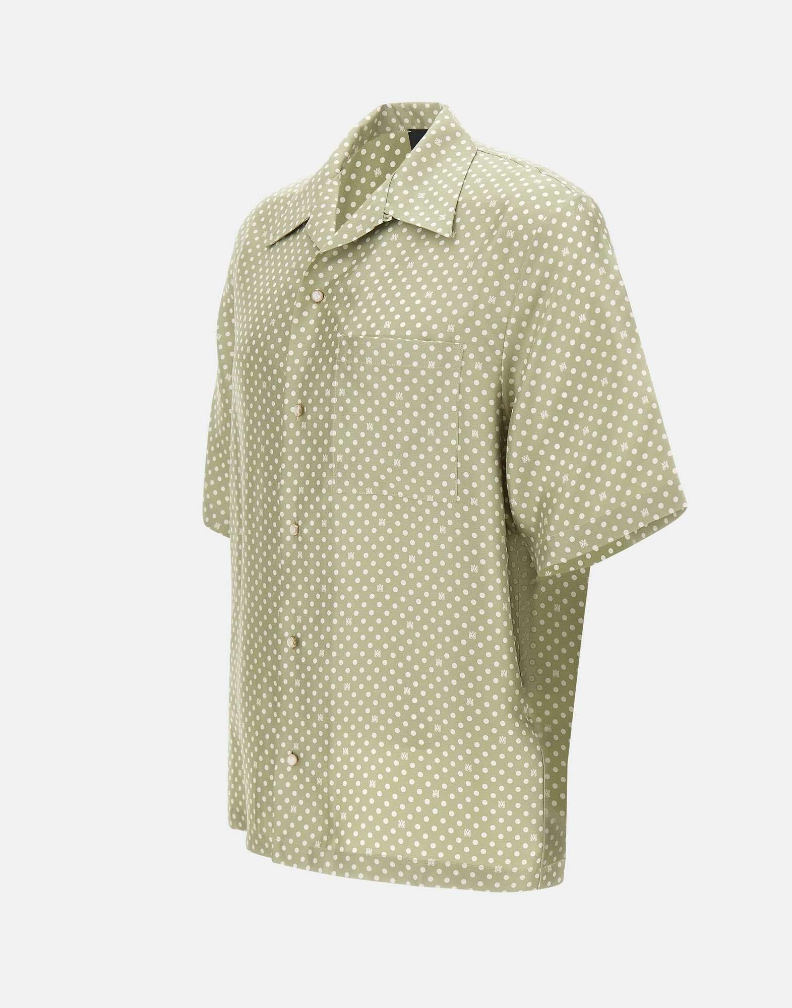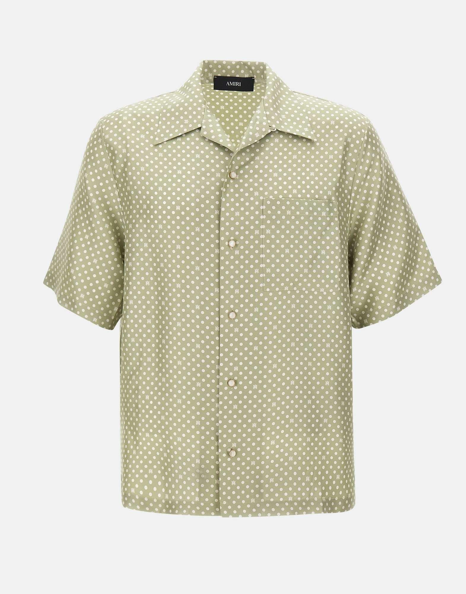 Amiri "Polka Dot Camp" men's shirt crafted from light green silk, featuring a white polka dot print that also incorporates the Amiri logo. Designed with short sleeves, a front button closure with white mother-of-pearl buttons, and a patch chest pocket for a refined yet relaxed feel. The oversized fit creates an easy, fluid silhouette, perfect for elevated summer looks. Made in Italy.